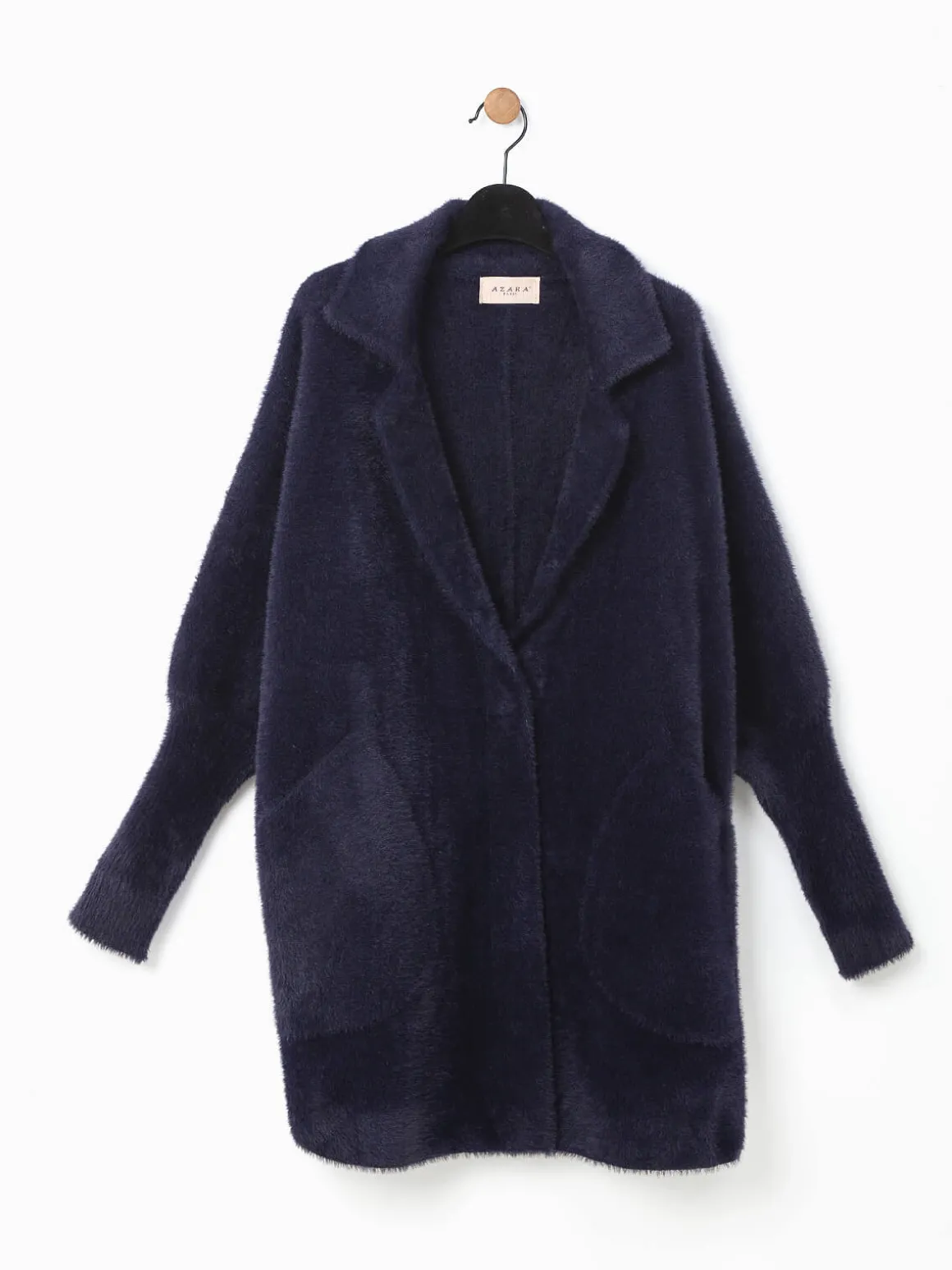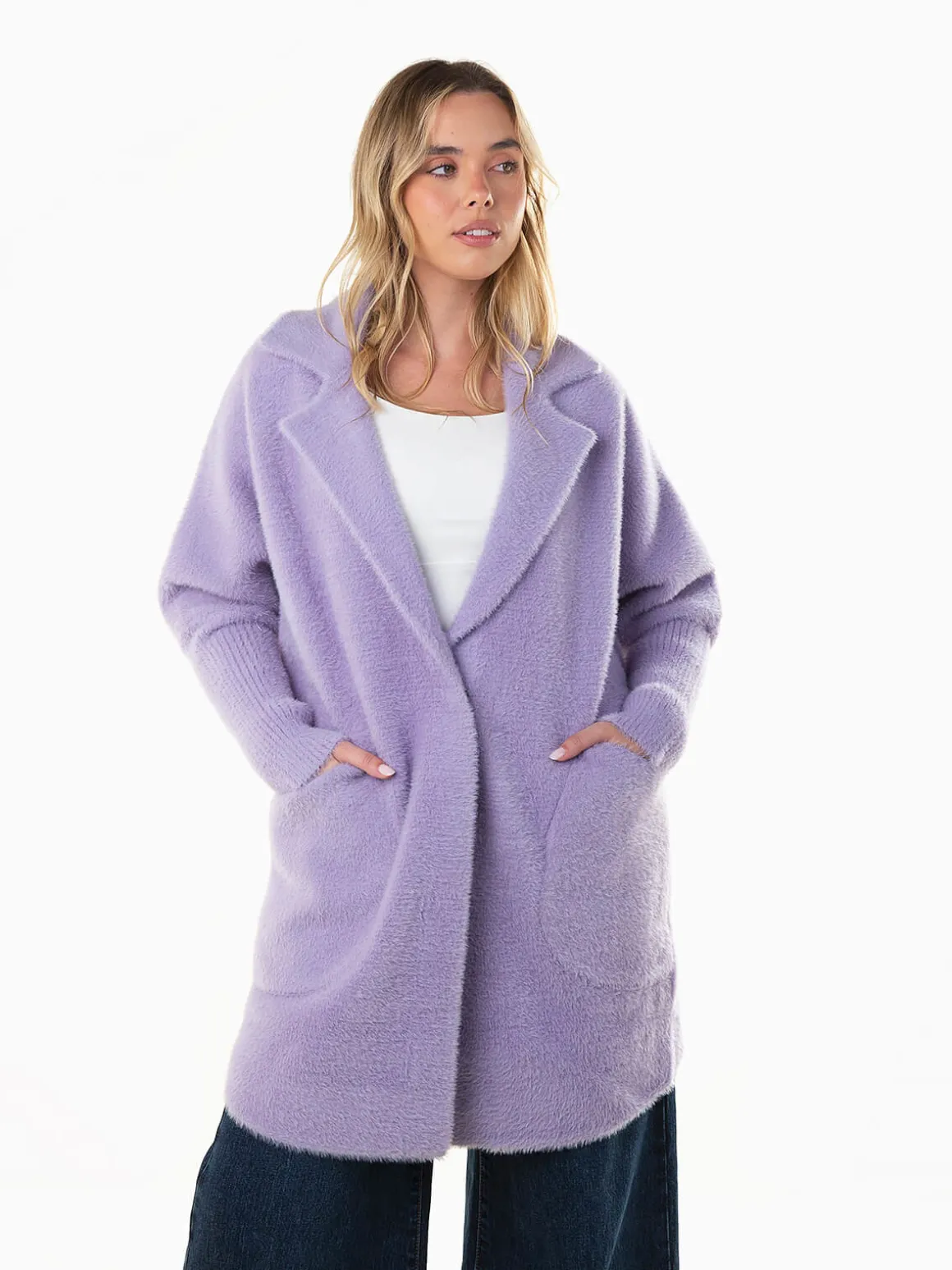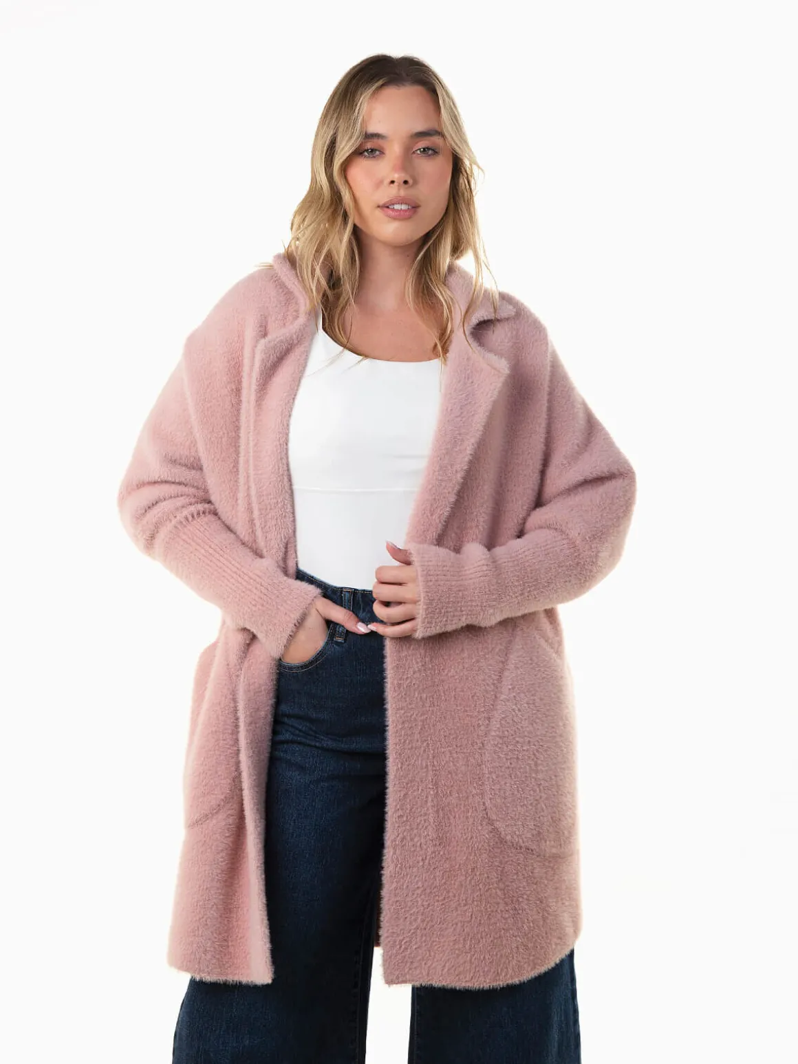 Casaco comprido efeito pelo para senhora. Casaco manga comprida com punho justo canelado. Gola abas e lapelas. 2 bolsos. Aperto botão de pressão.Altura da Modelo: 166 cm | Tamanho: Tamanho Único
