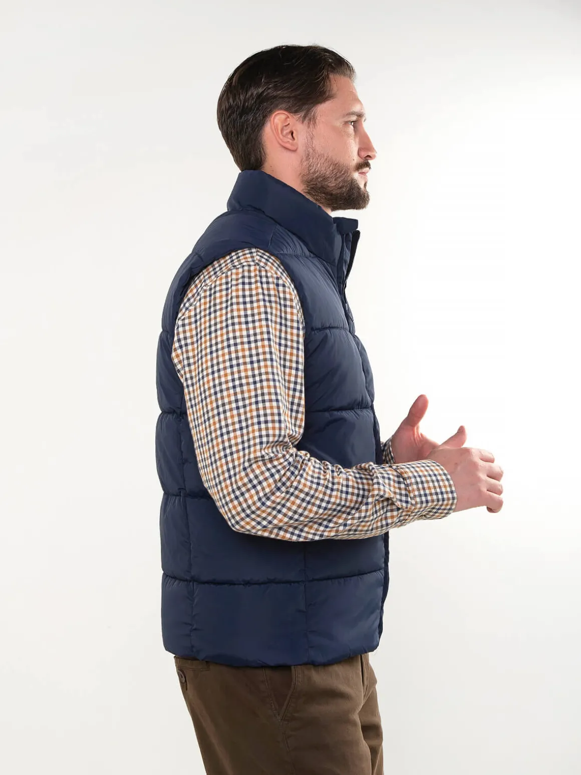 Colete acolchoado azul marinho com gola subida, fecho em zíper e 2 bolsos laterais. Inclui bolso interior prático. Leve, confortável e perfeito para completar looks casuais nos dias mais frios.Altura do Modelo: 180 cm | Tamanho: M
