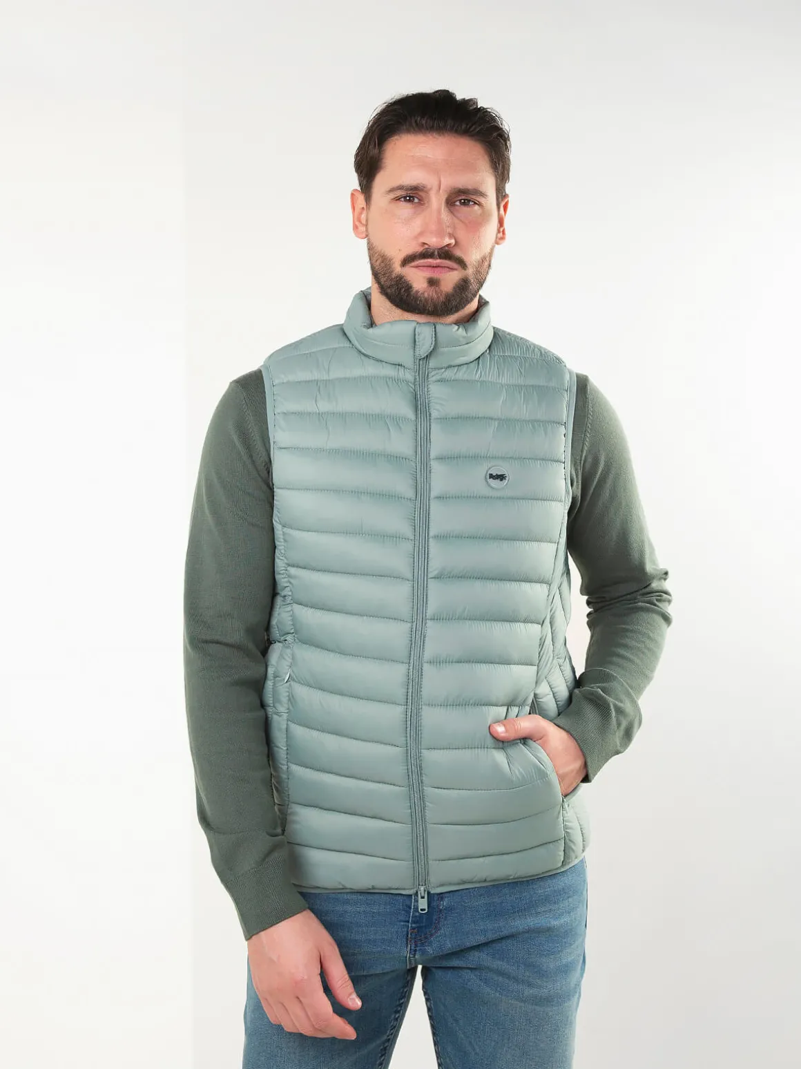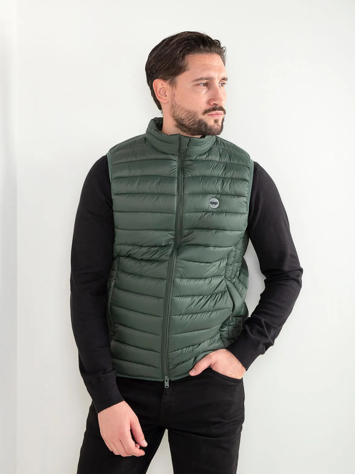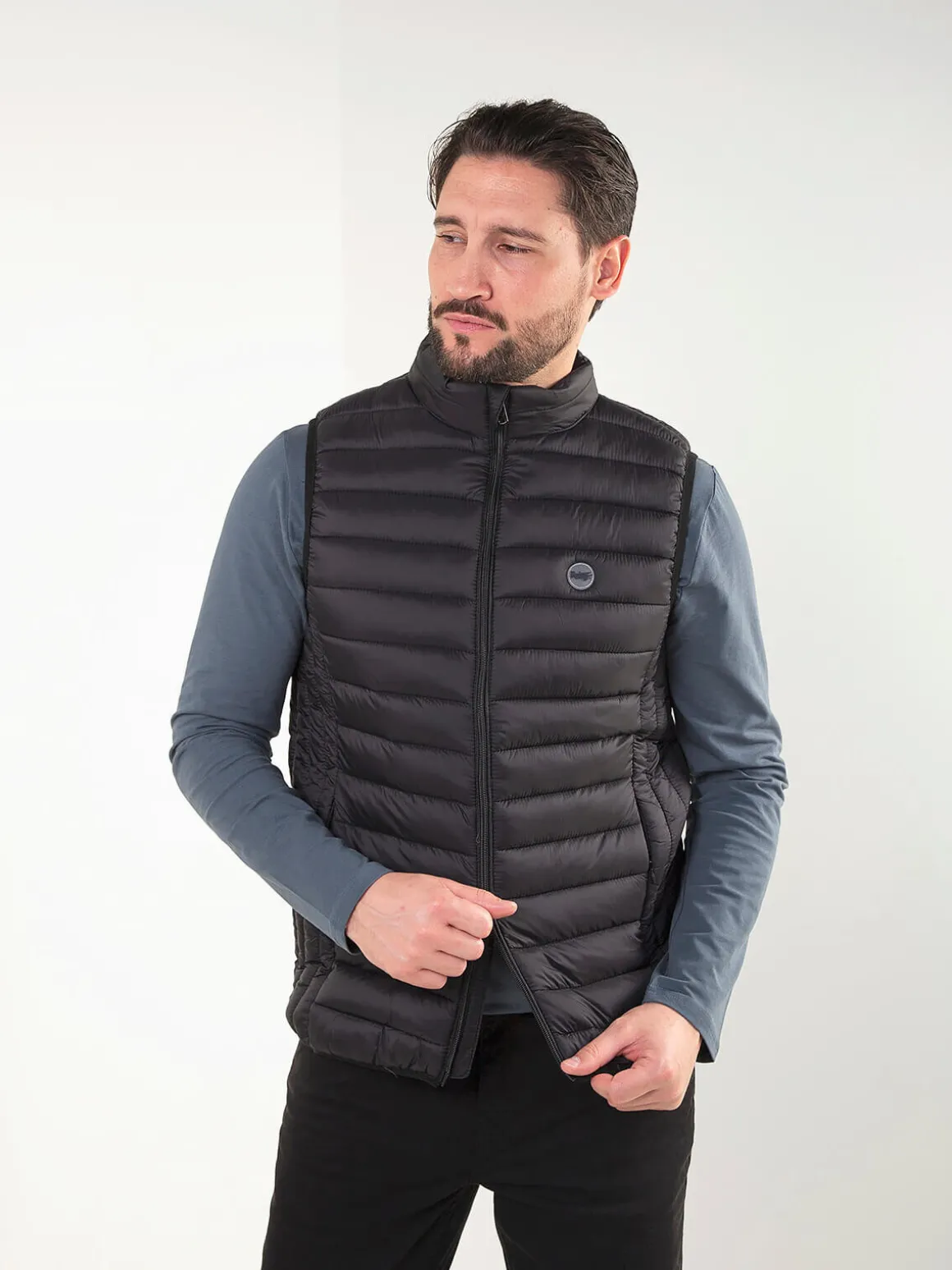Colete acolchoado leve com gola subida e fecho em zíper. Modelo confortável, fácil de usar no dia a dia e perfeito para sobrepor em looks casuais. Inclui bolsos laterais discretos.Altura do Modelo: 180 cm | Tamanho: L
