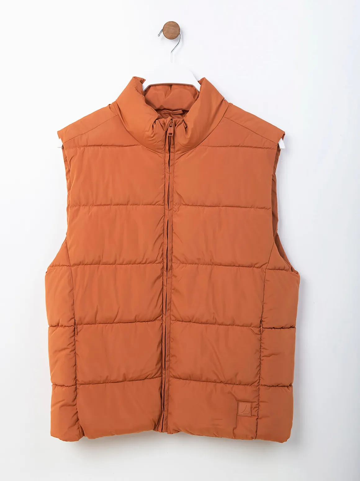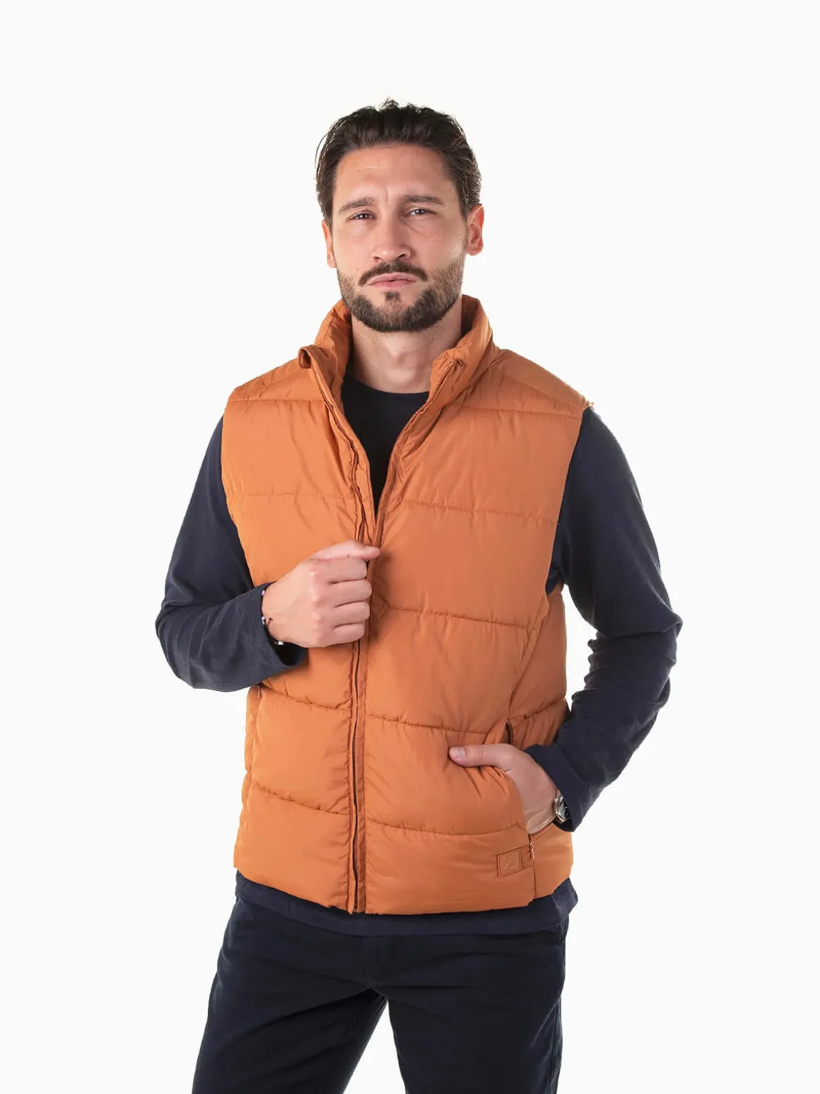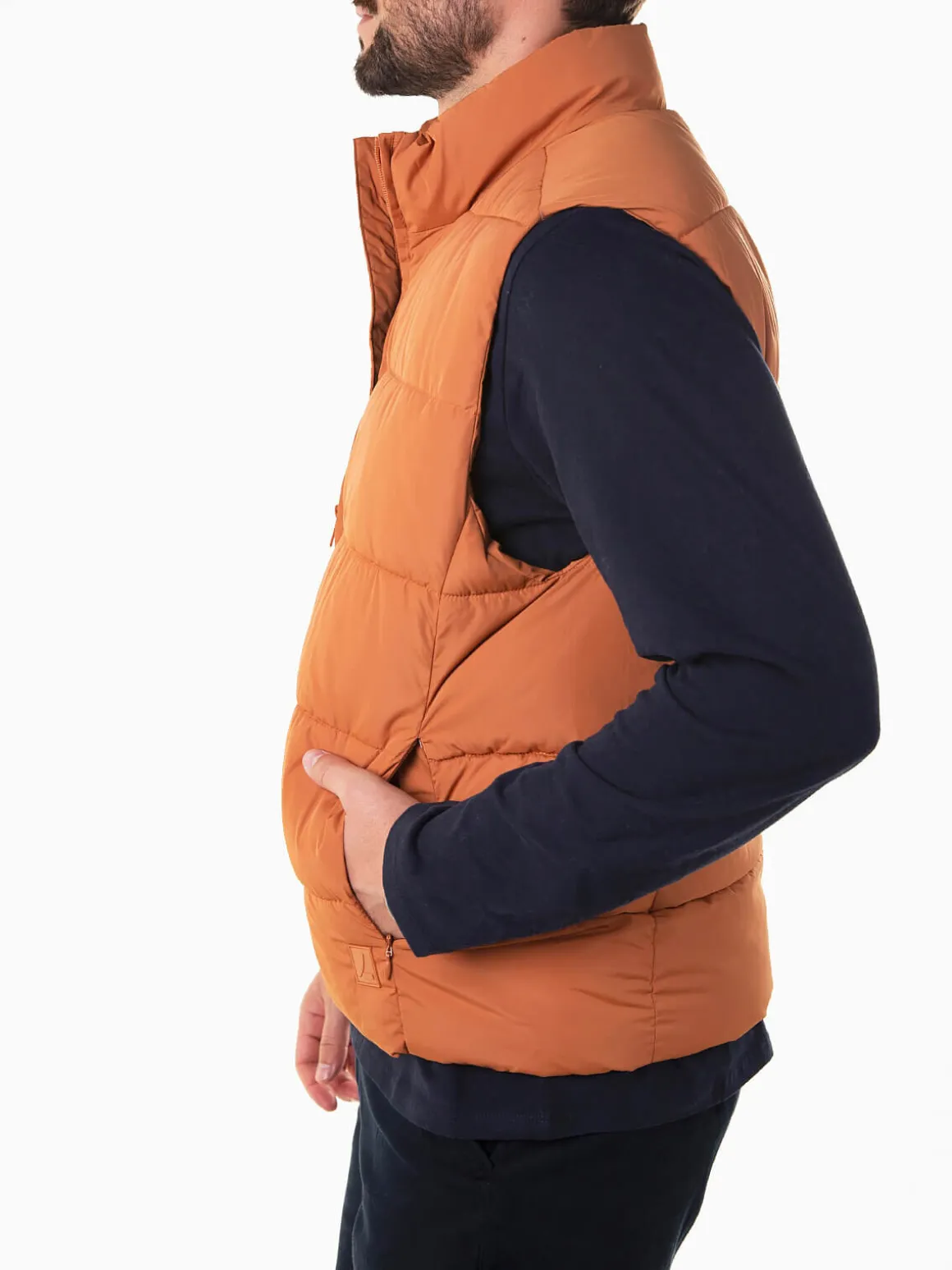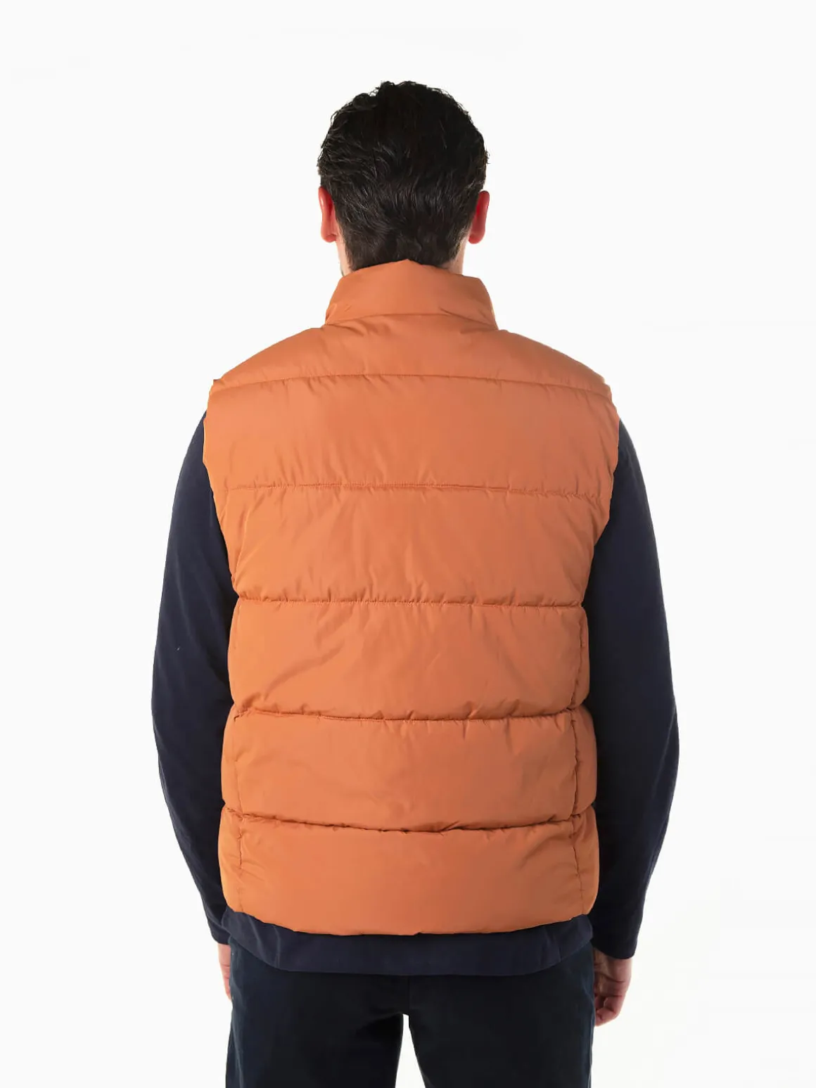 Colete acolchoado em tom telha para homem. Modelo com gola alta, dois bolsos laterais e bolso interior. Aperto com fecho zíper à frente. Tecido com resistência a chuva ligeira, ideal para os dias instáveis da estação. Uma peça prática e moderna para completar qualquer look de outono.Altura do Modelo: 180 cm | Tamanho: M