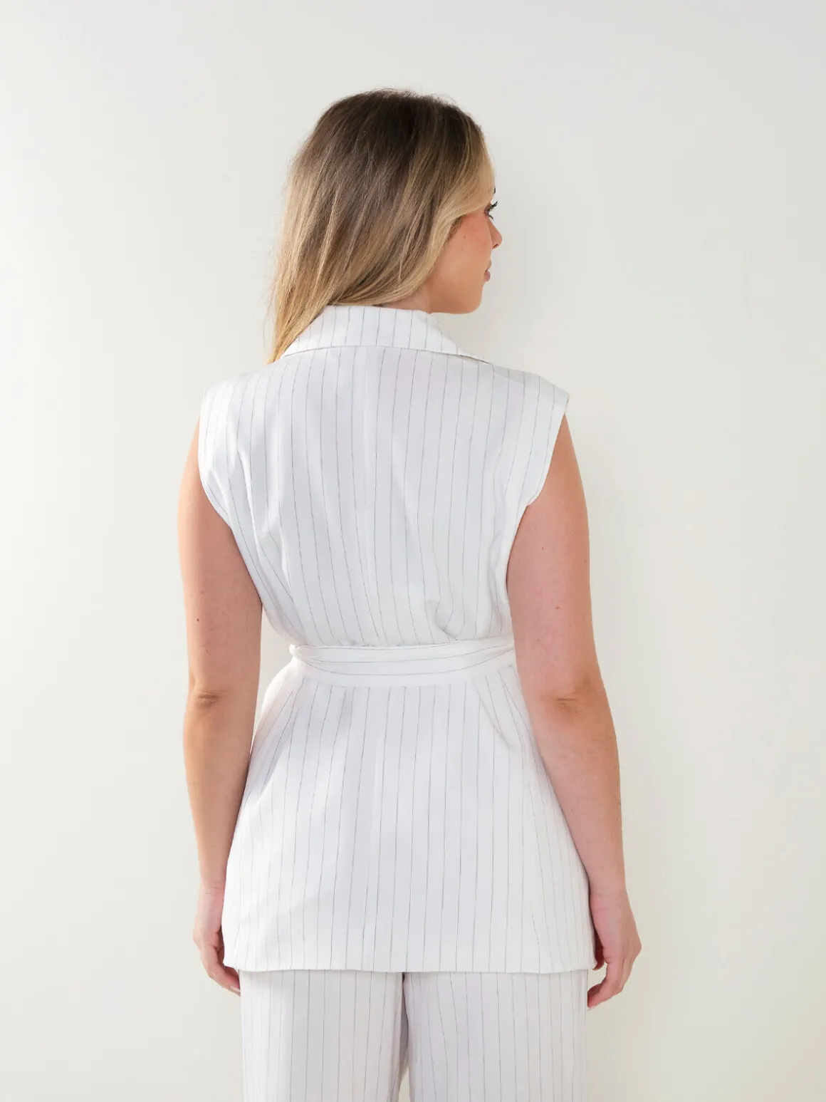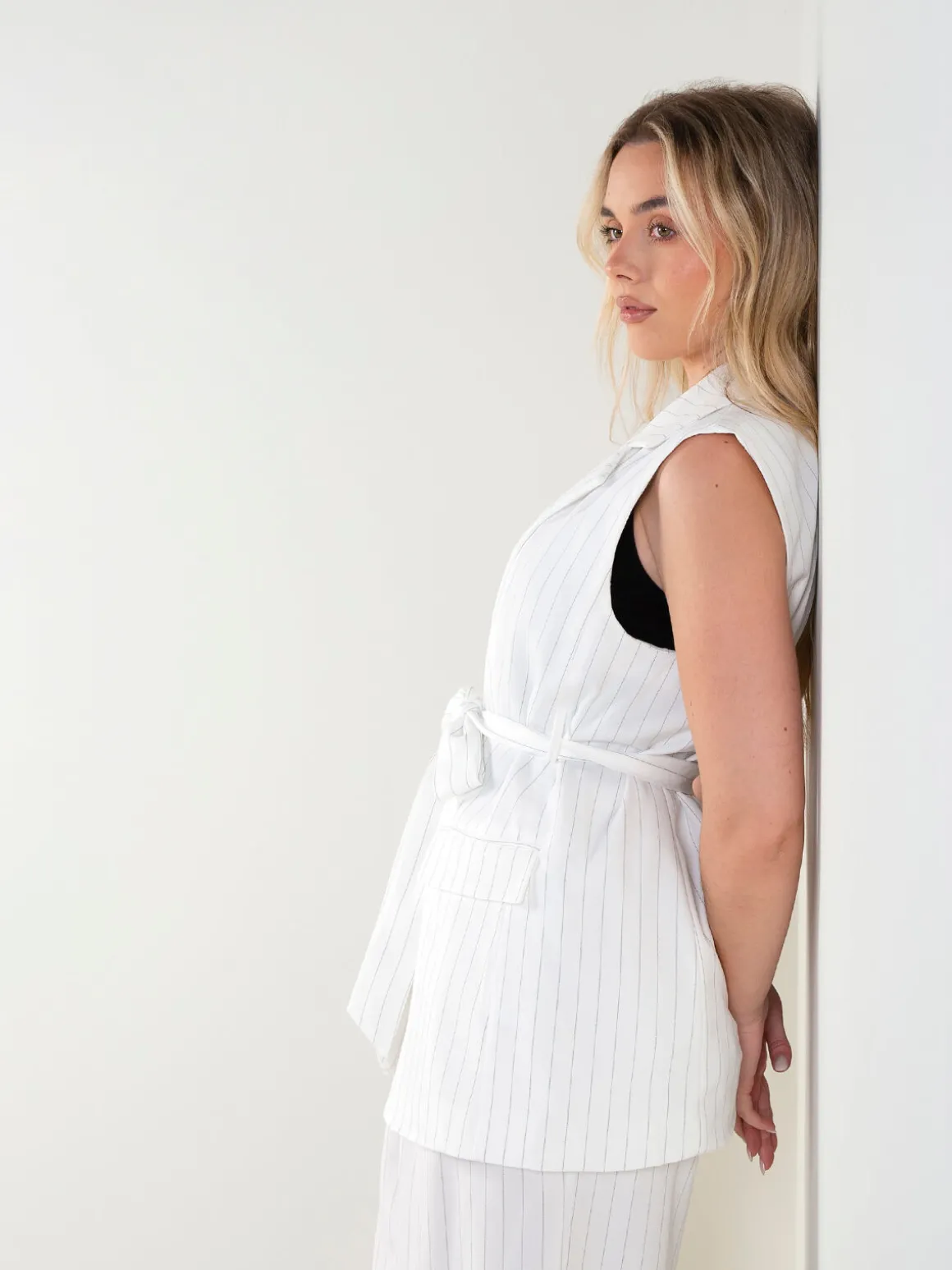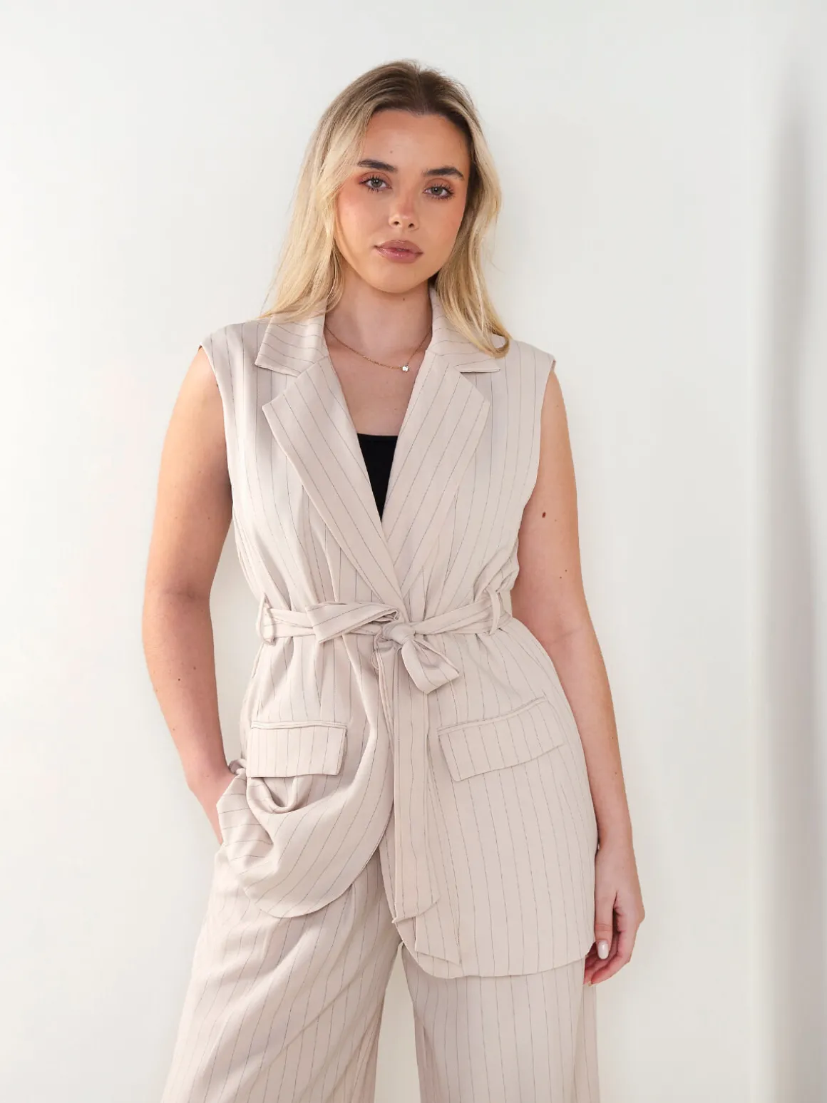 Colete comprido de alfaiataria com padrão risca diplomática e cinto ajustável na cintura. Ideal para usar em conjunto ou em looks elegantes e atuais.Altura da Modelo: 166 cm | Tamanho: S/M