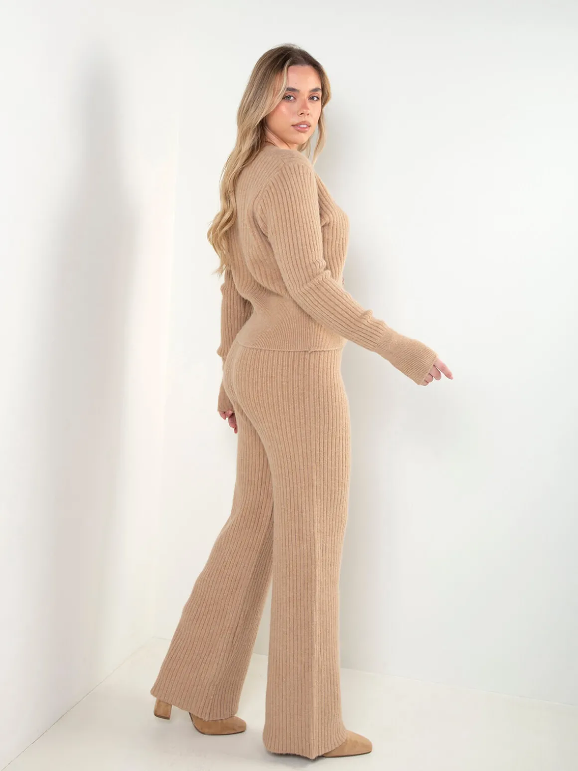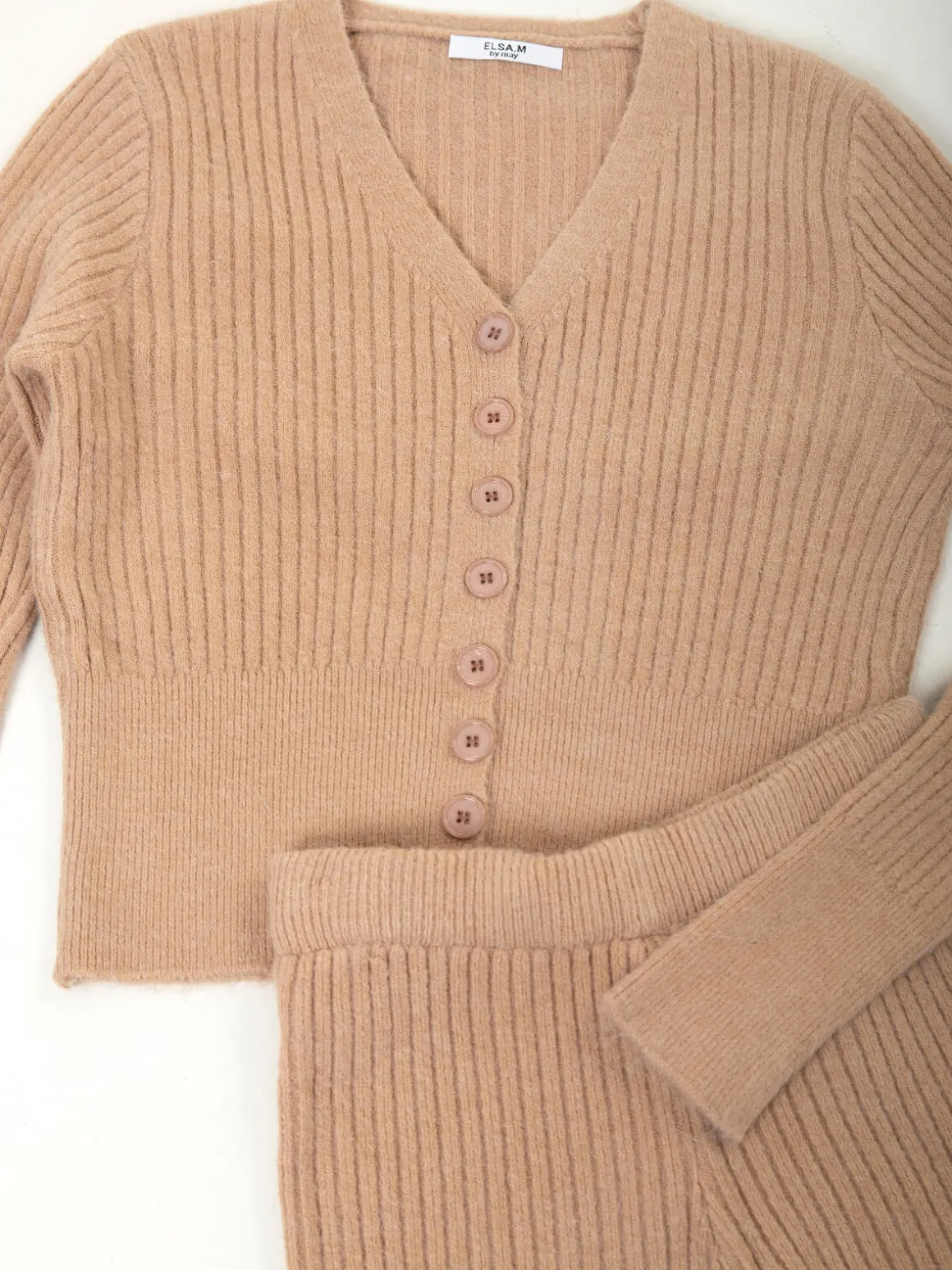 Conjunto de malha canelada composto por casaco com gola em V, fecho de botões e manga comprida, e calças de cintura elástica para maior conforto. Modelo ajustado, ideal para o dia a dia, fácil de usar em conjunto ou separado.Altura da Modelo: 166 cm | Tamanho: Tamanho Único