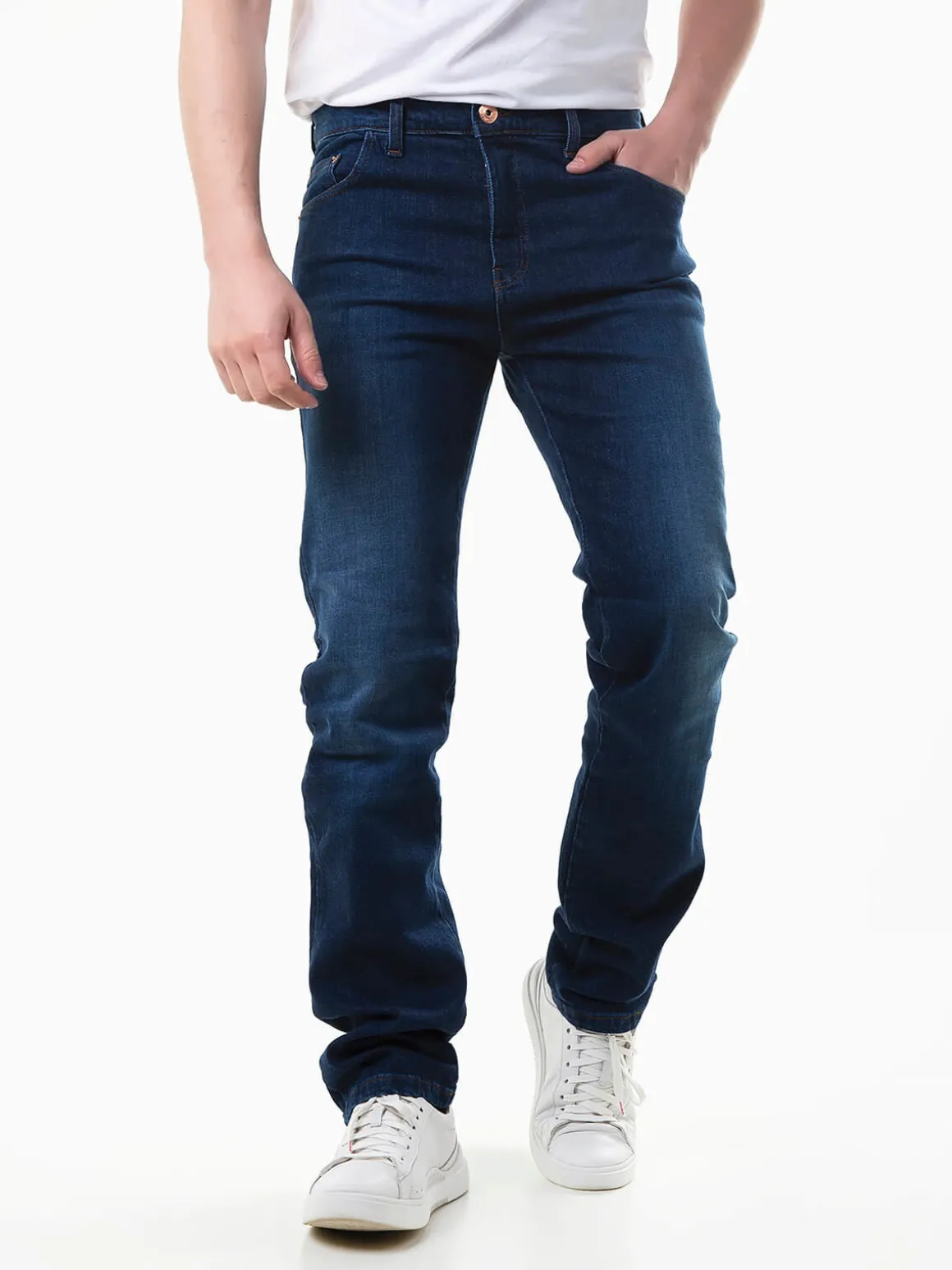 Jeans straight fit com lavagem azul escuro. Calças ganga com 5 bolsos. Aperto fecho zíper e botão. Altura do Modelo: 180 cm | Tamanho: 42