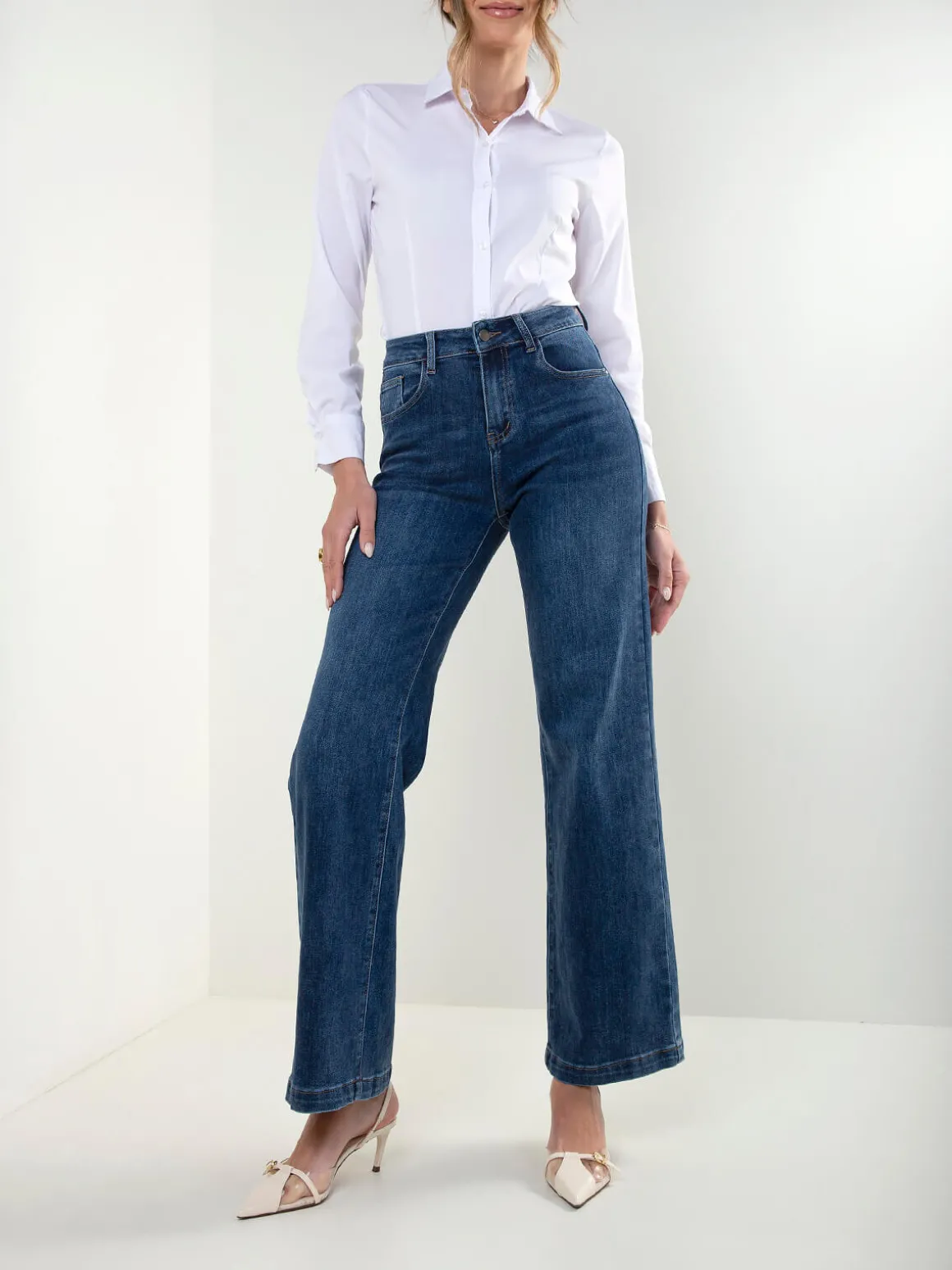 Calças de ganga wide leg com cintura alta. Modelo de 5 bolsos, com aperto por fecho de correr e botão. Lavagem azul escuro, ideal para looks atuais e versáteis.Altura da Modelo: 175 cm | Tamanho: S