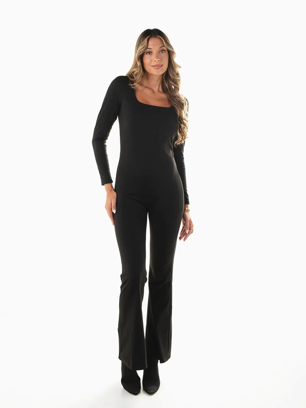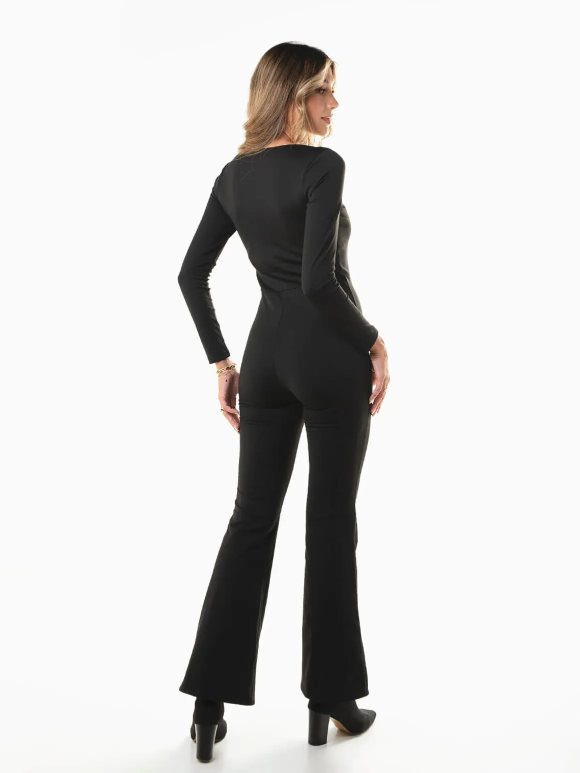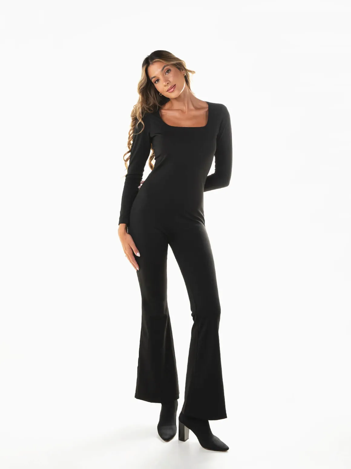 Macacão comprido em tecido elástico tipo lycra, com decote quadrado e calças em boca de sino. Modelo justo de manga comprida que valoriza a silhueta e garante conforto, ideal para looks modernos e sofisticados.Altura da Modelo: 175 cm | Tamanho: S/M