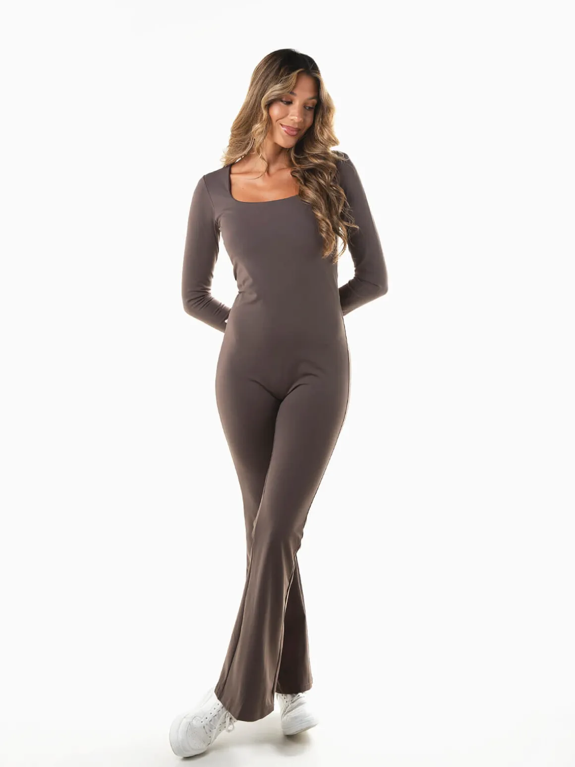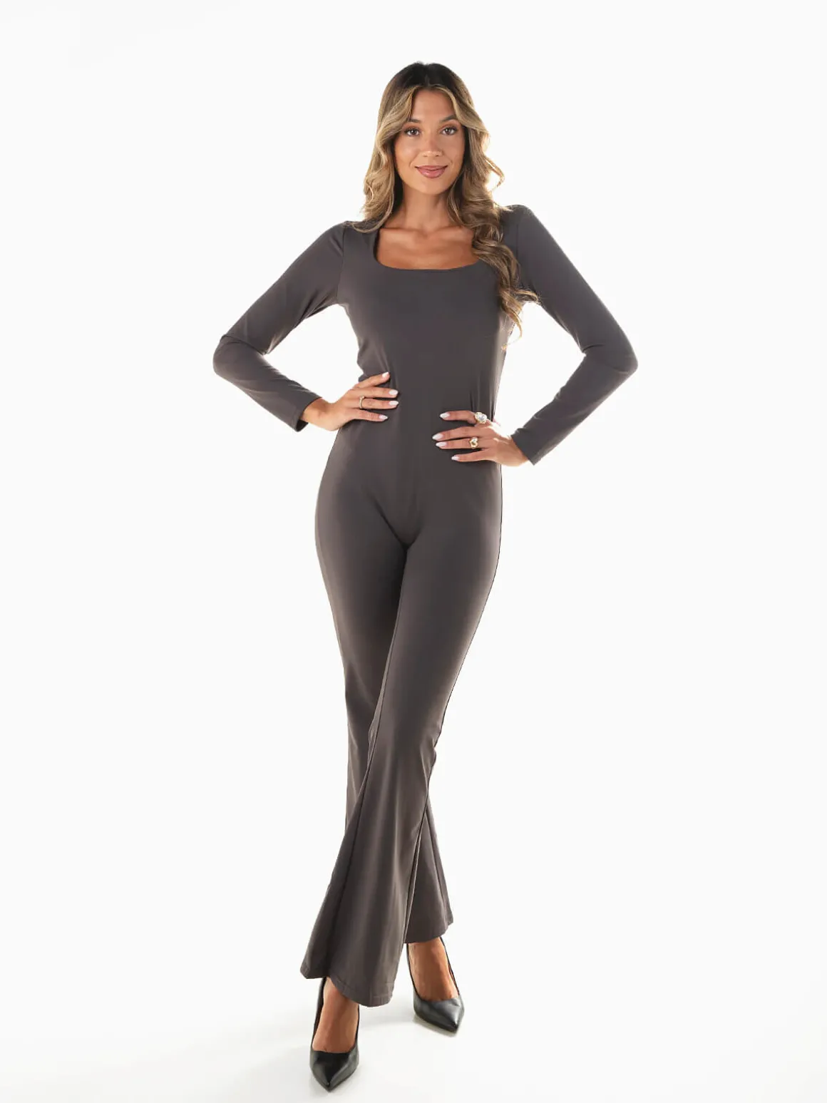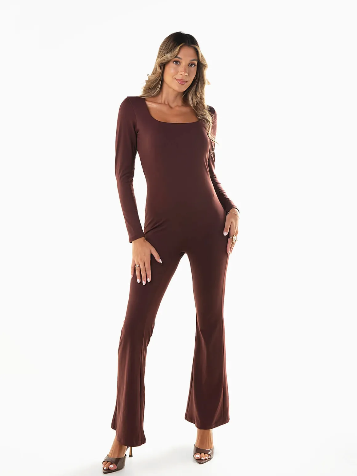 Macacão comprido em tecido elástico tipo lycra, com decote quadrado e calças em boca de sino. Modelo justo de manga comprida que valoriza a silhueta e garante conforto, ideal para looks modernos e sofisticados.Altura da Modelo: 175 cm | Tamanho: S/M