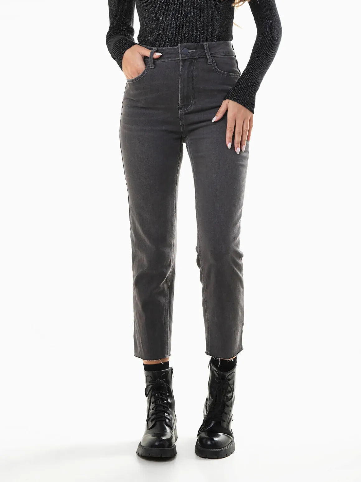 Mom jeans cinza de cintura alta com base desfiada, 5 bolsos e aperto com fecho éclair e botão. Confortáveis e versáteis, perfeitas para criar looks urbanos e descontraídos.Altura da Modelo: 175 cm | Tamanho: 36