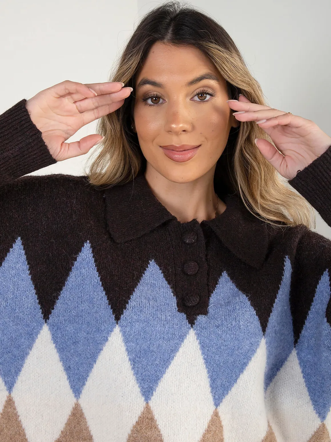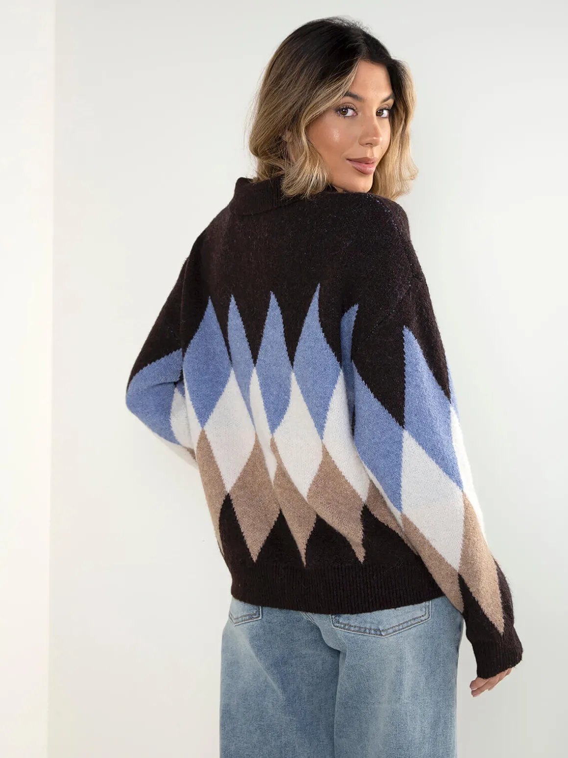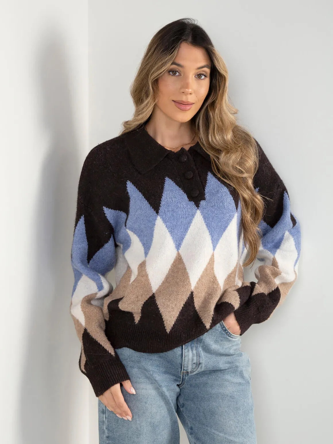 Polo castanho escuro com padrão de losangos e corte oversized. Modelo quente e confortável de manga comprida, gola de abas e acabamentos canelados. Carcela com 3 botões. Altura da Modelo: 175 cm | Tamanho: Tamanho Único
