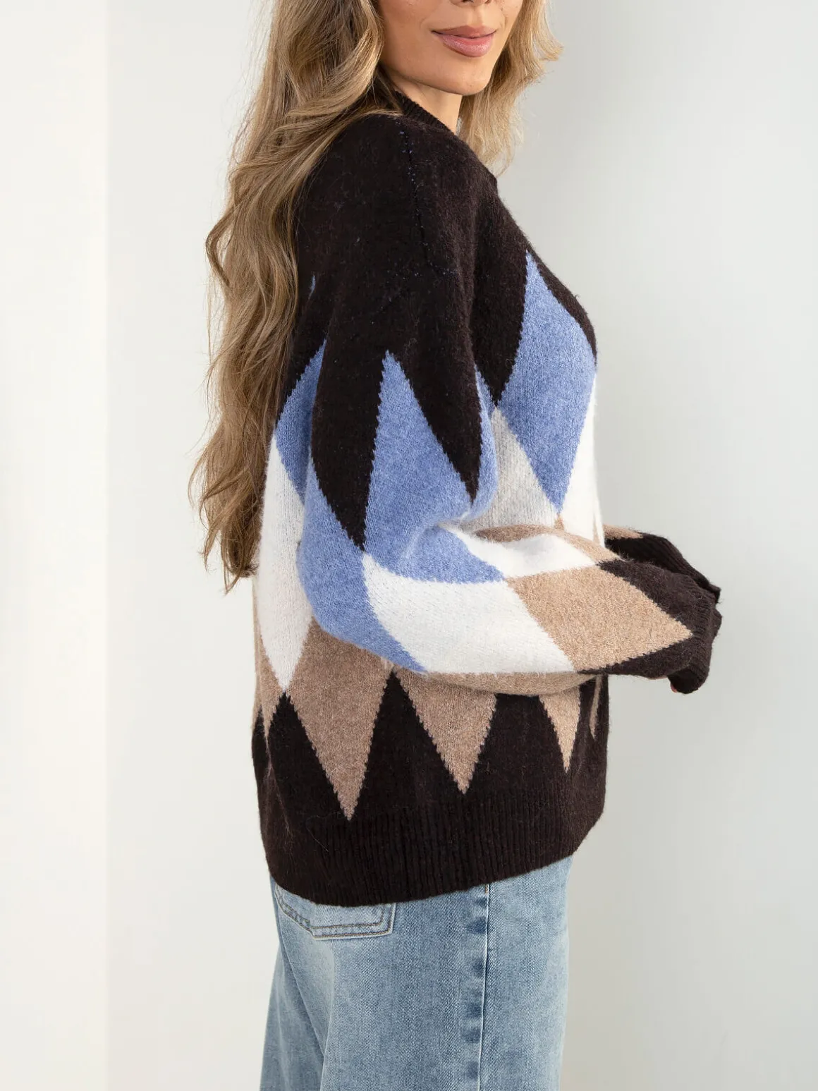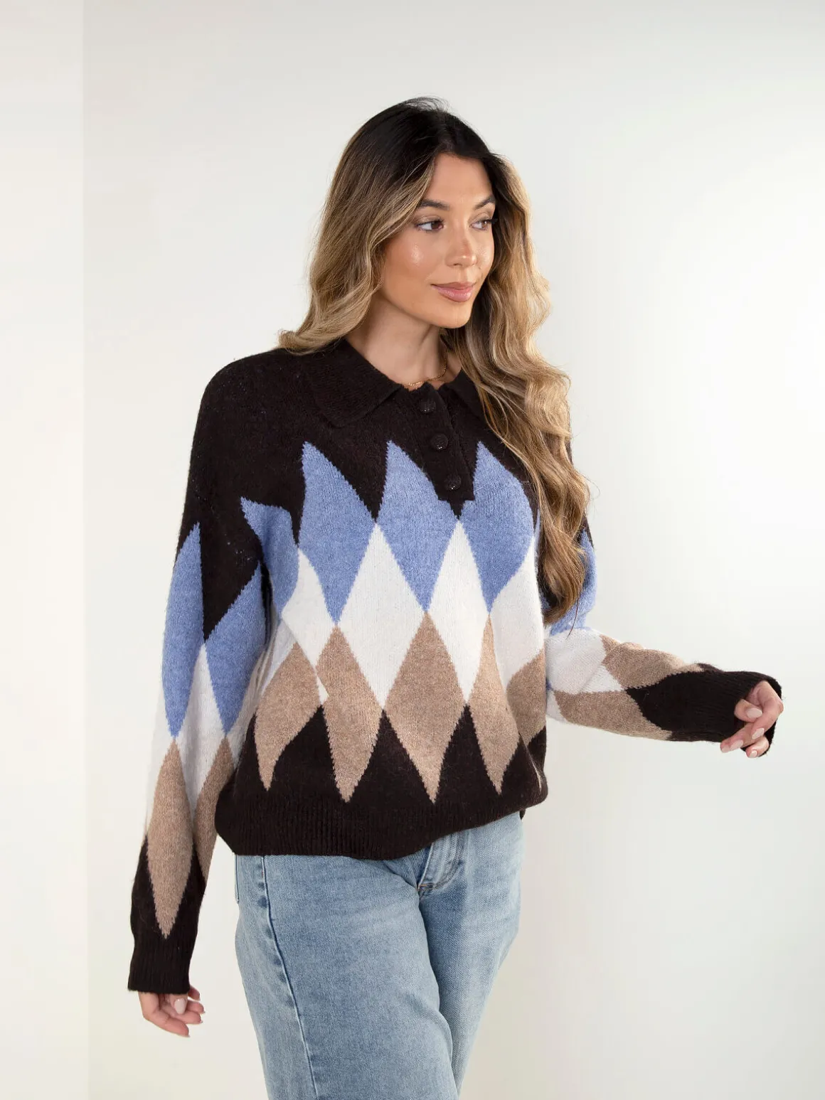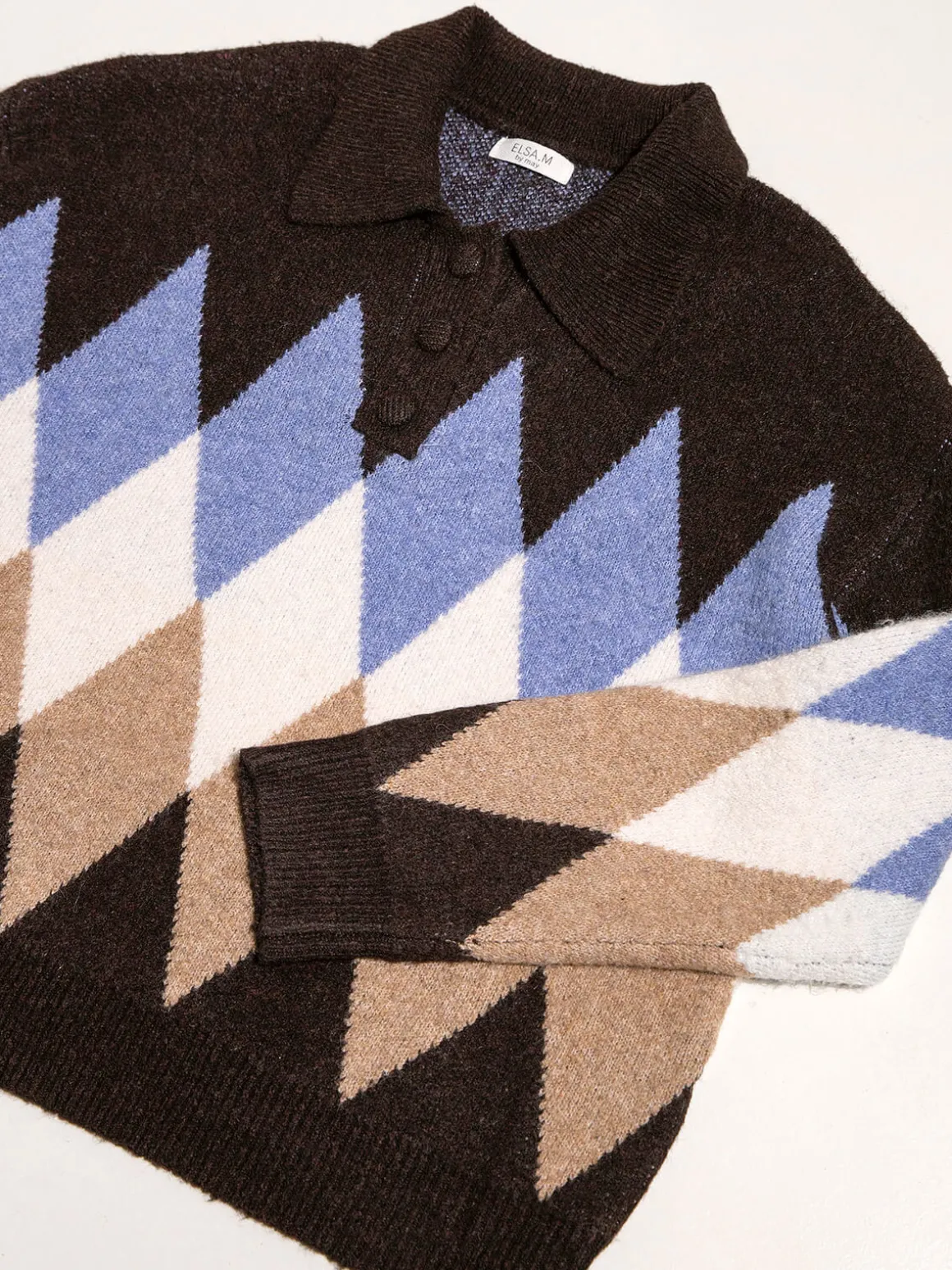 Polo castanho escuro com padrão de losangos e corte oversized. Modelo quente e confortável de manga comprida, gola de abas e acabamentos canelados. Carcela com 3 botões. Altura da Modelo: 175 cm | Tamanho: Tamanho Único