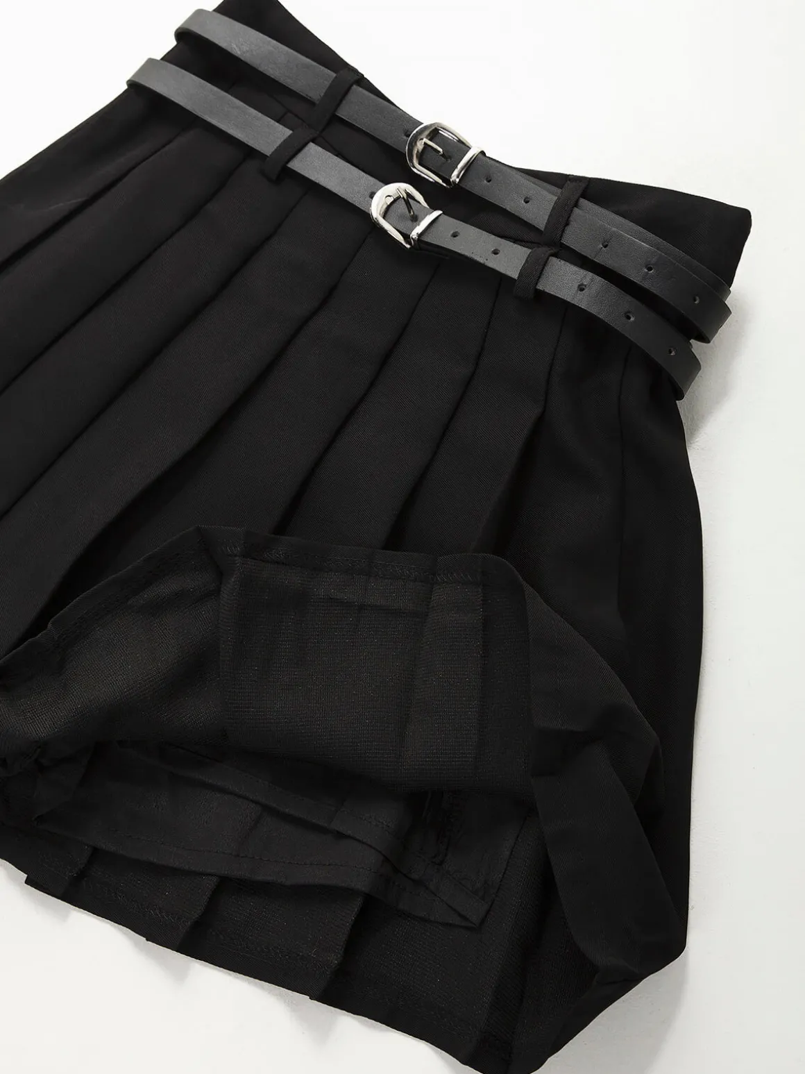 Saia curta às pregas com cintura alta, forro em calção e dois cintos em pele sintética removíveis. Aperto com fecho éclair oculto na costura. Ideal para combinar com camisolas justas ou bodies elegantes, criando um look feminino e moderno.Altura da Modelo: 166 cm | Tamanho: S