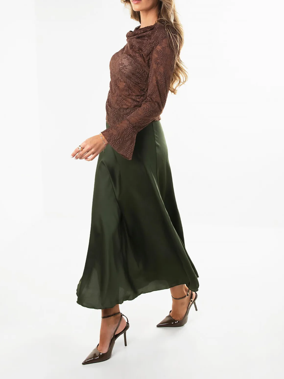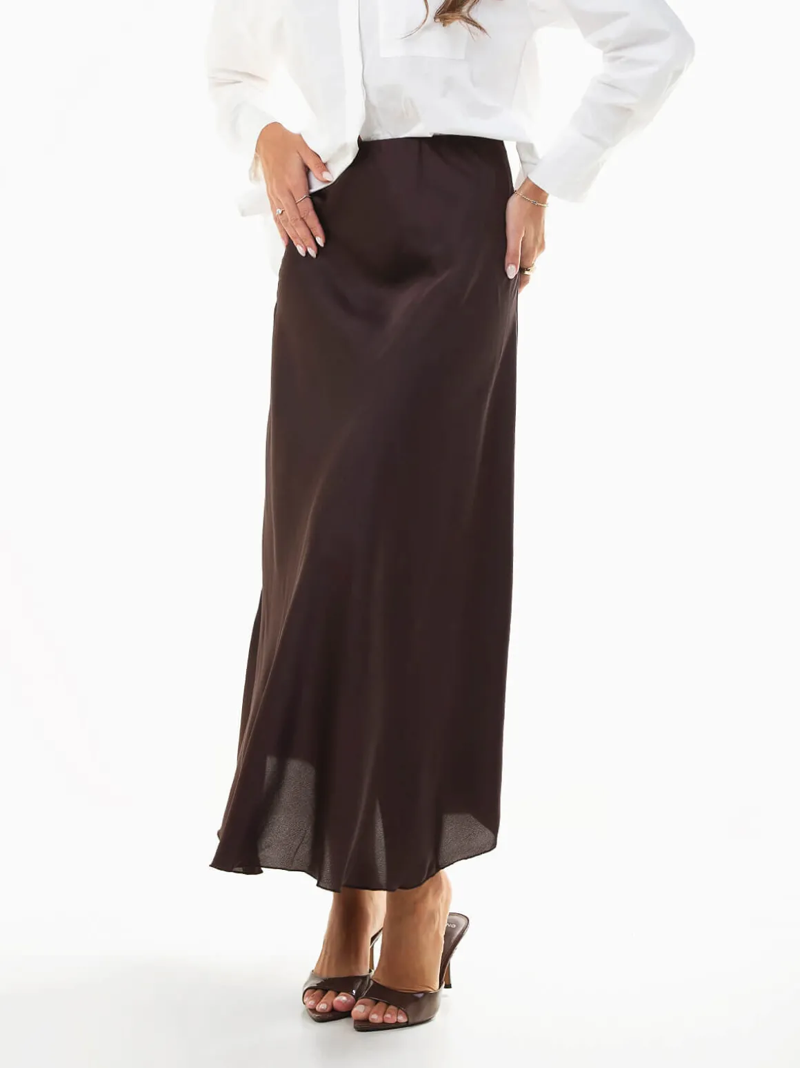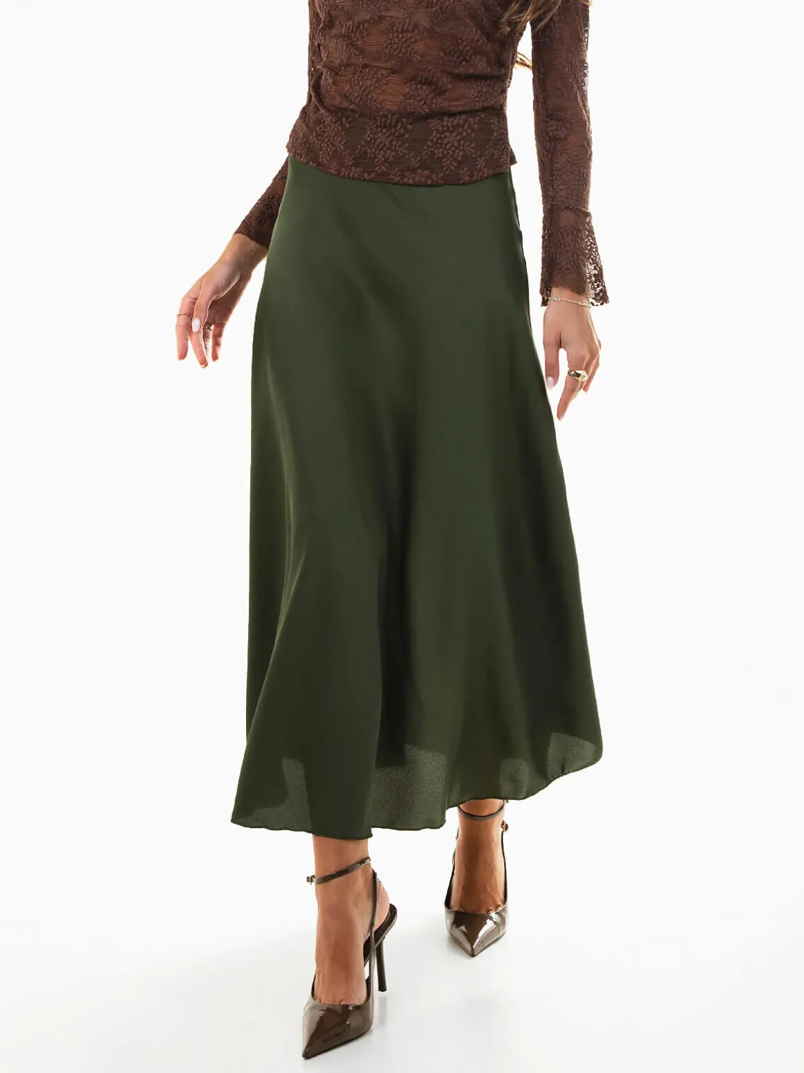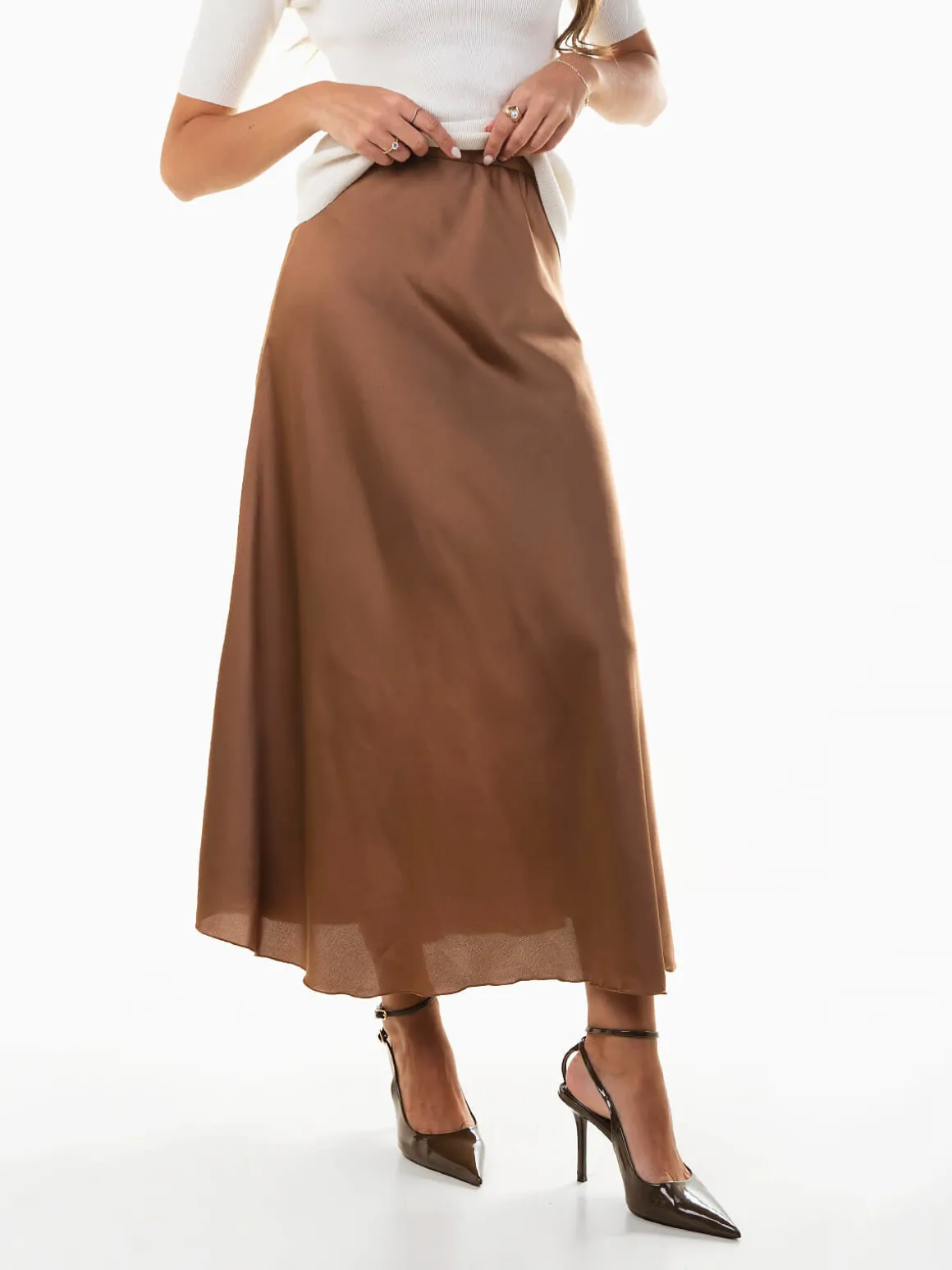 Saia midi em tecido acetinado liso, com corte evasé e cintura alta, oferecendo movimento fluido e conforto. Uma peça versátil que combina com tops lisos ou estampados, ideal para looks elegantes do dia a dia ou ocasiões especiais. Altura da Modelo: 175 cm | Tamanho: Tamanho Único