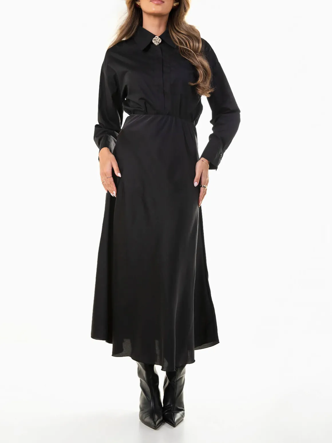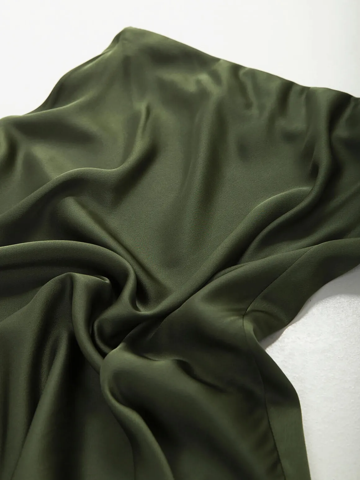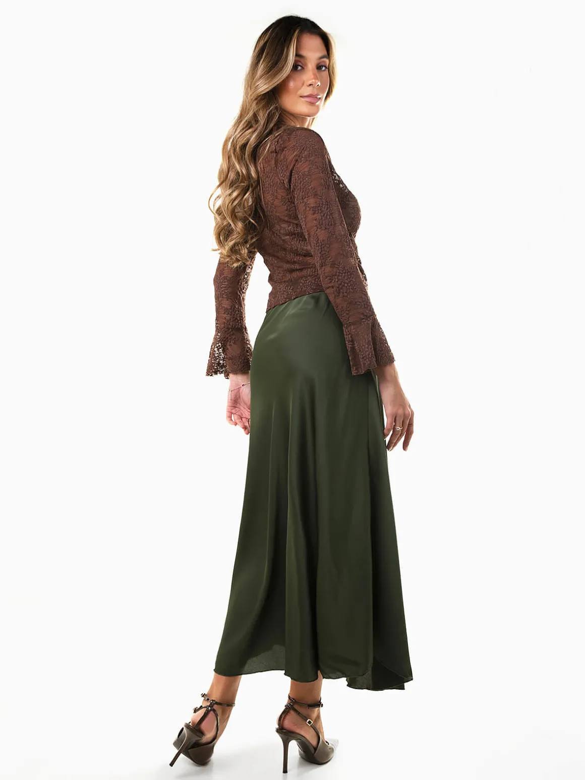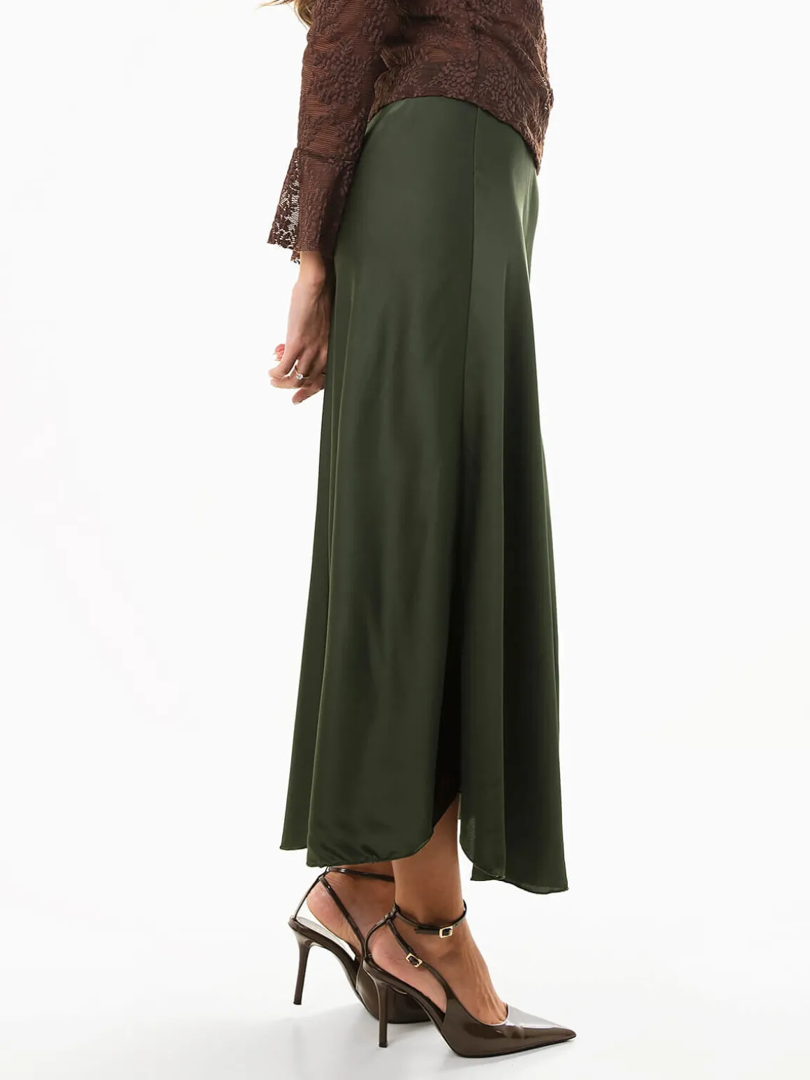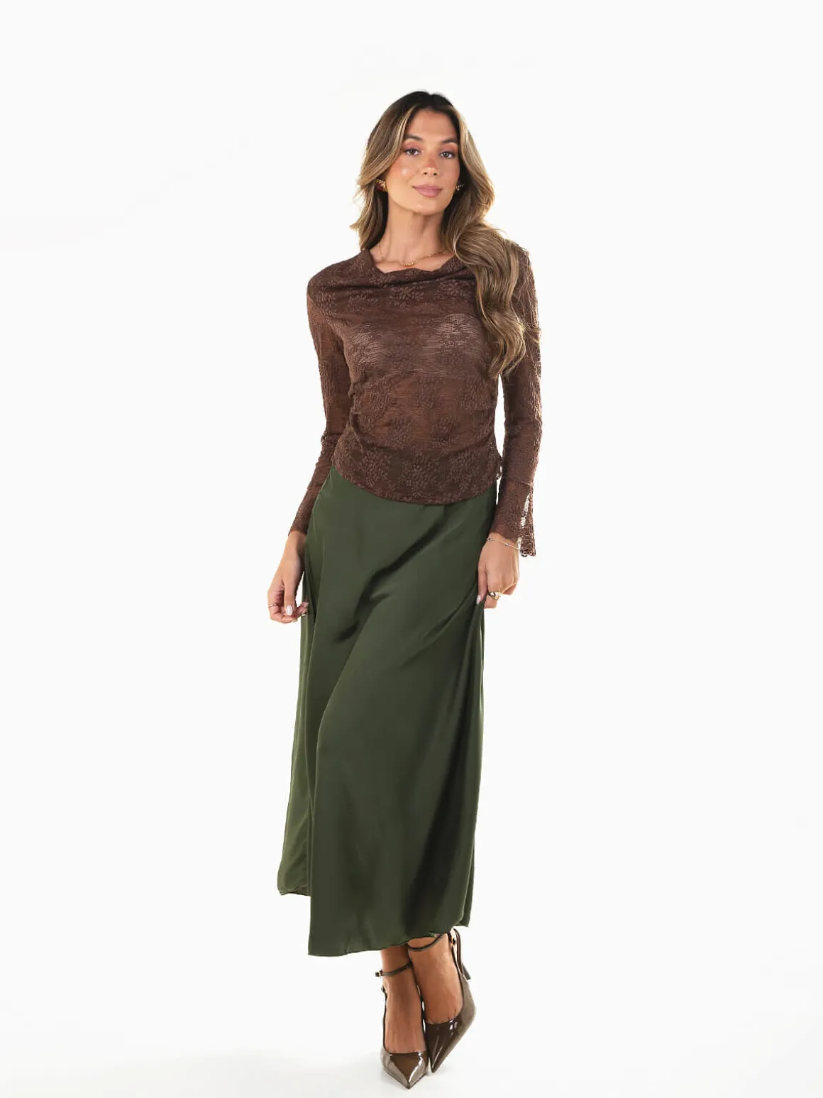 Saia midi em tecido acetinado liso, com corte evasé e cintura alta, oferecendo movimento fluido e conforto. Uma peça versátil que combina com tops lisos ou estampados, ideal para looks elegantes do dia a dia ou ocasiões especiais. Altura da Modelo: 175 cm | Tamanho: Tamanho Único