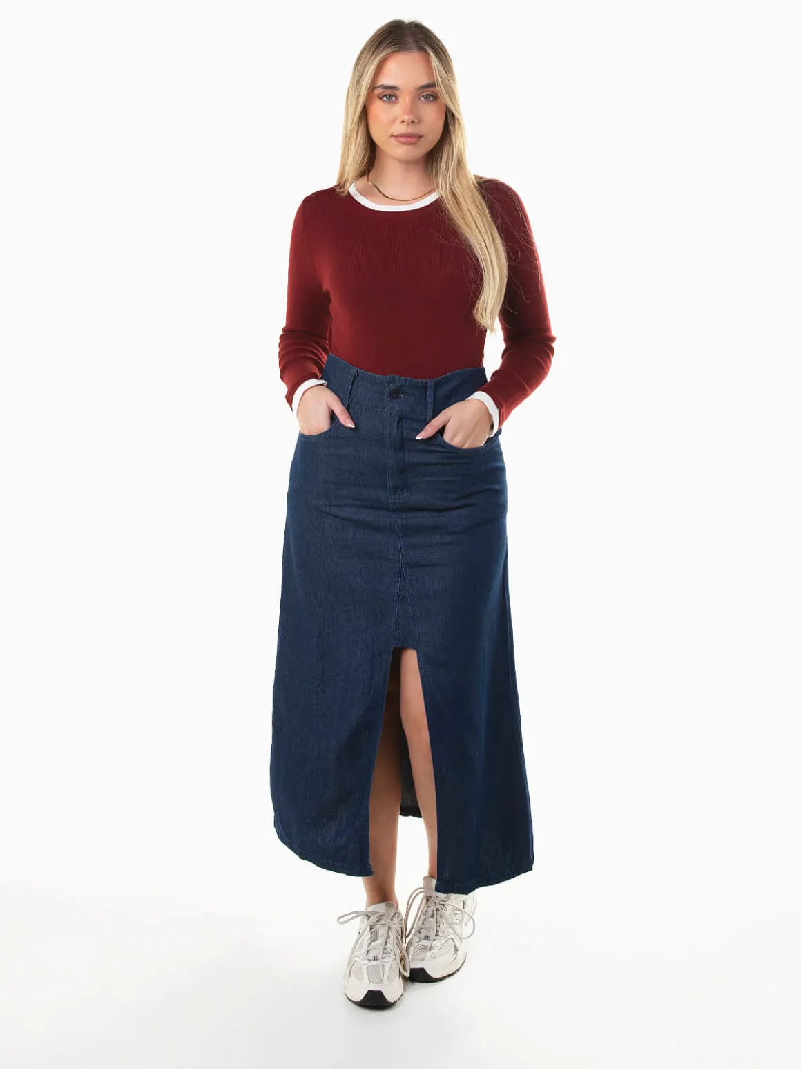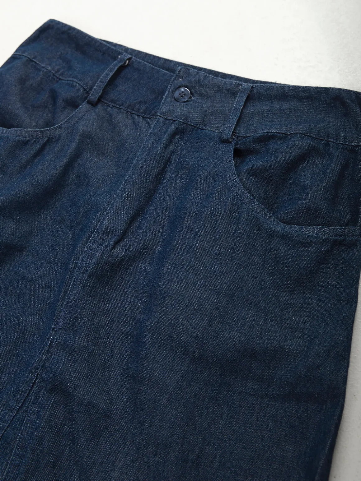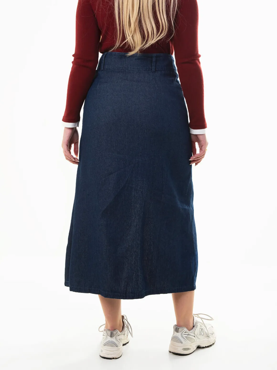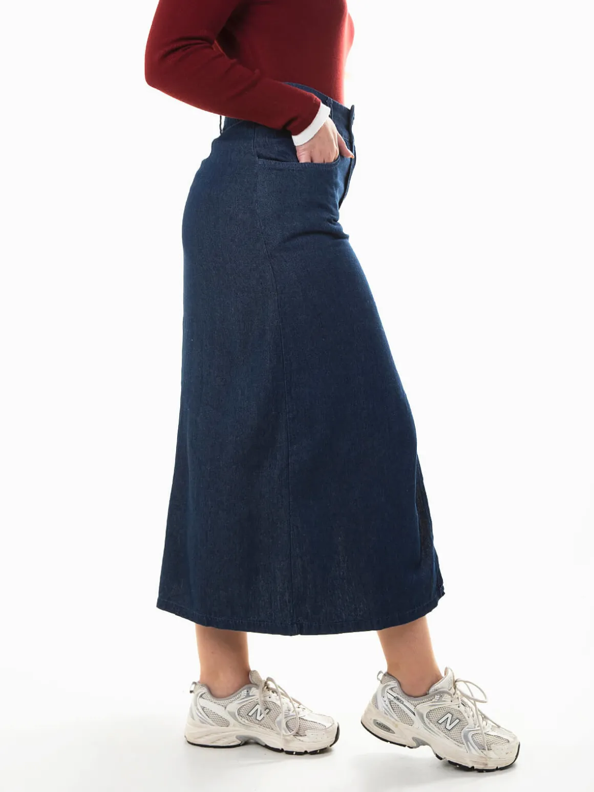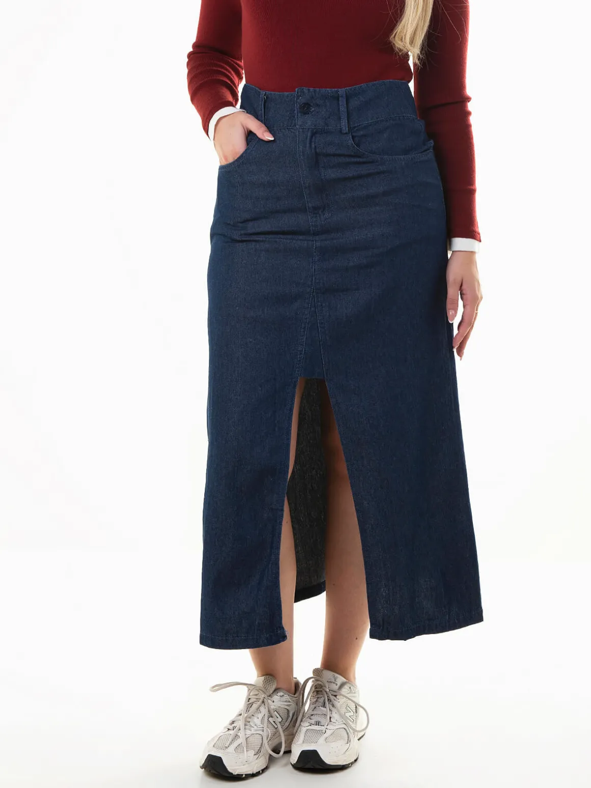 Saia midi de ganga com cintura alta e dois bolsos. Modelo com abertura frontal e aperto de fecho éclair e botão. Um essencial versátil e moderno, perfeito para combinar com camisolas, camisas ou blusas em looks de dia cheios de estilo.Altura da Modelo: 166 cm | Tamanho: S