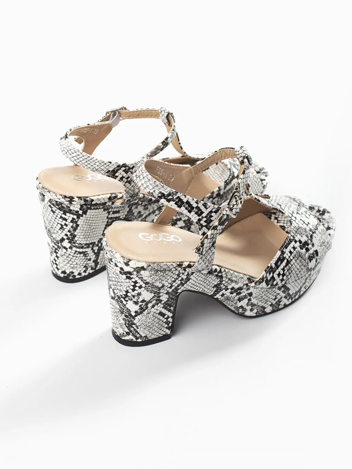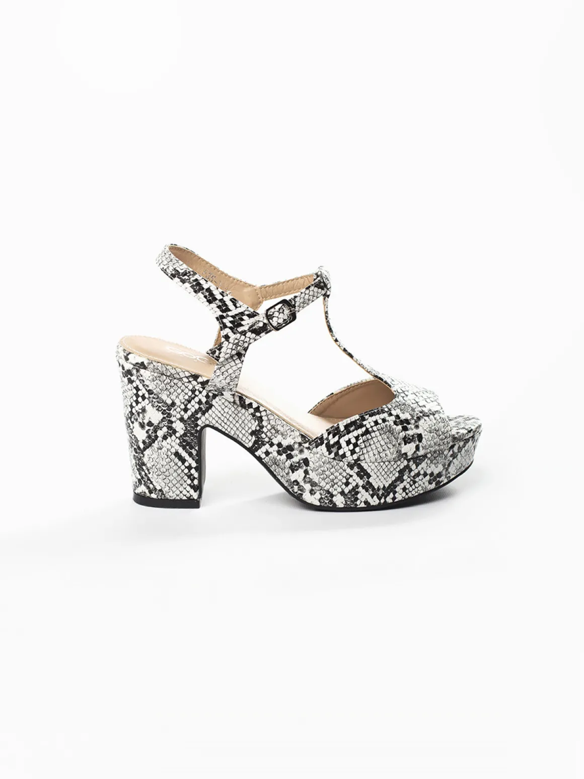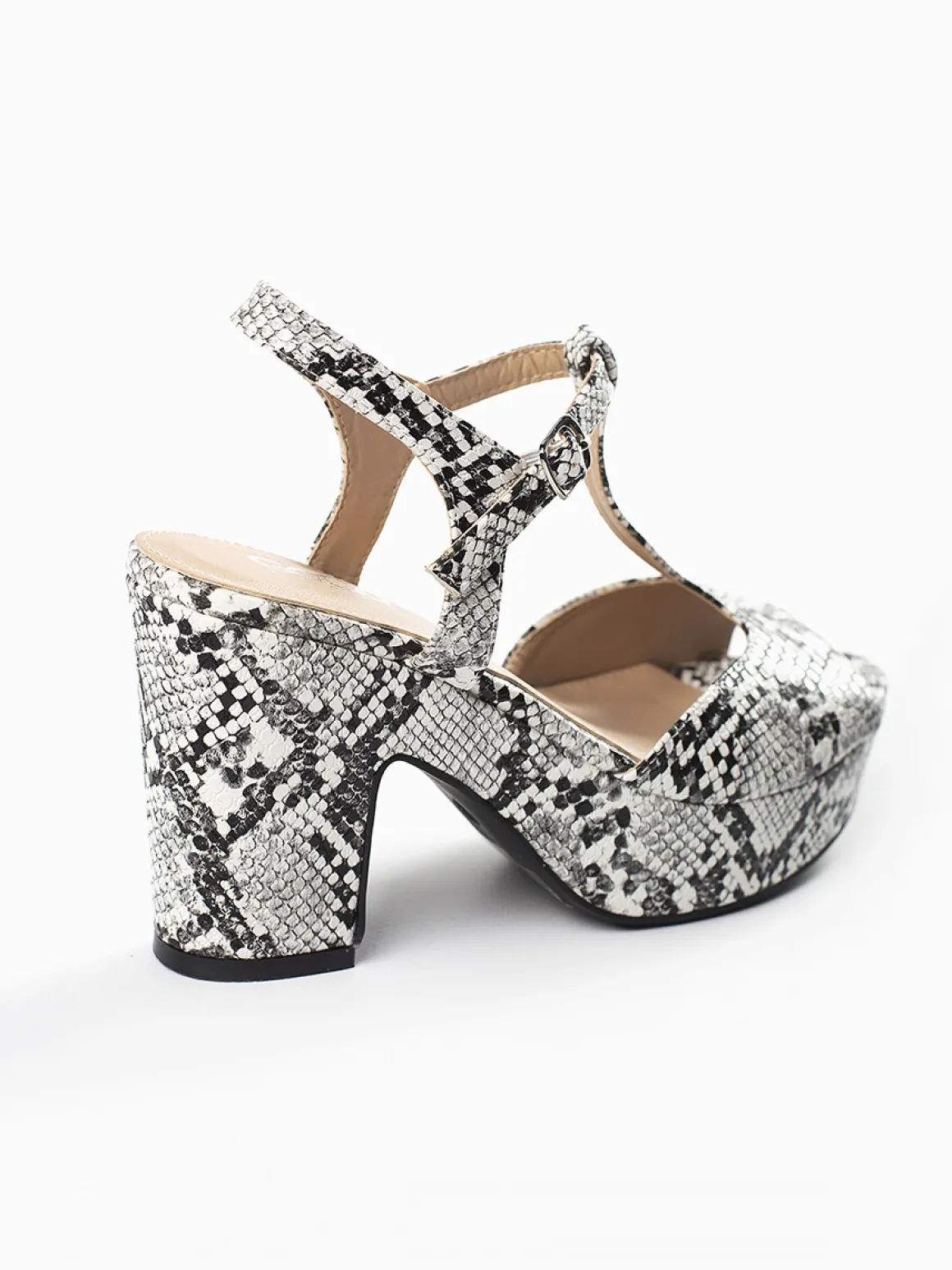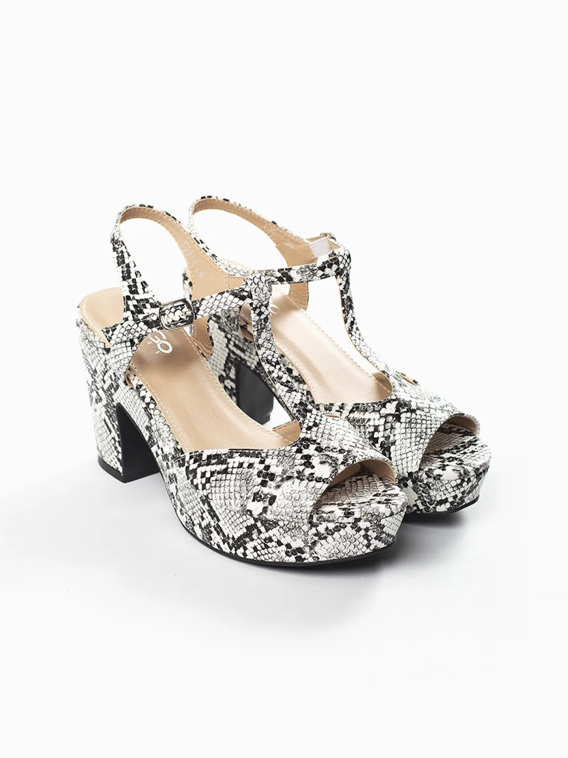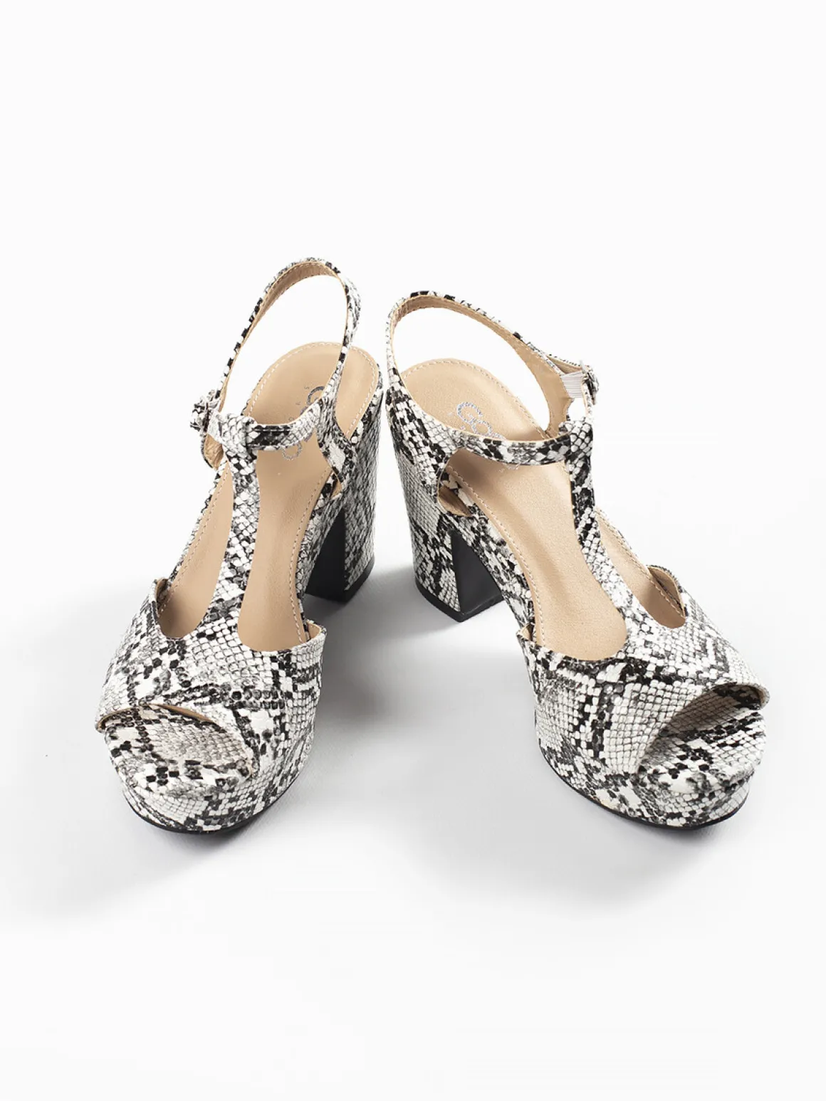 Sandálias salto alto estampado animal de cobra. Sandálias compensadas abertas com aperto de fivela. Tacão quadrado. Altura 10 cm.