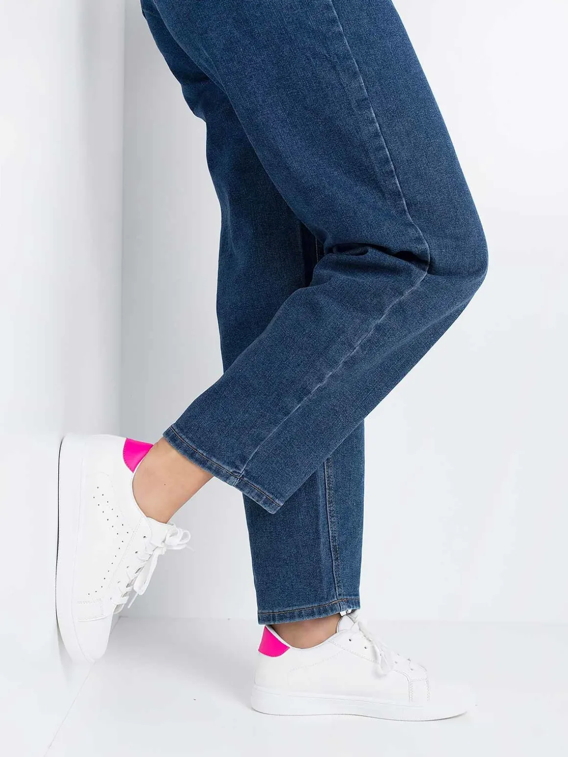 Sapatilhas brancas com encaixe rosa atrás. Sapatilhas brancas com atacadores. Recomendamos um tamanho acima do seu tamanho habitual.