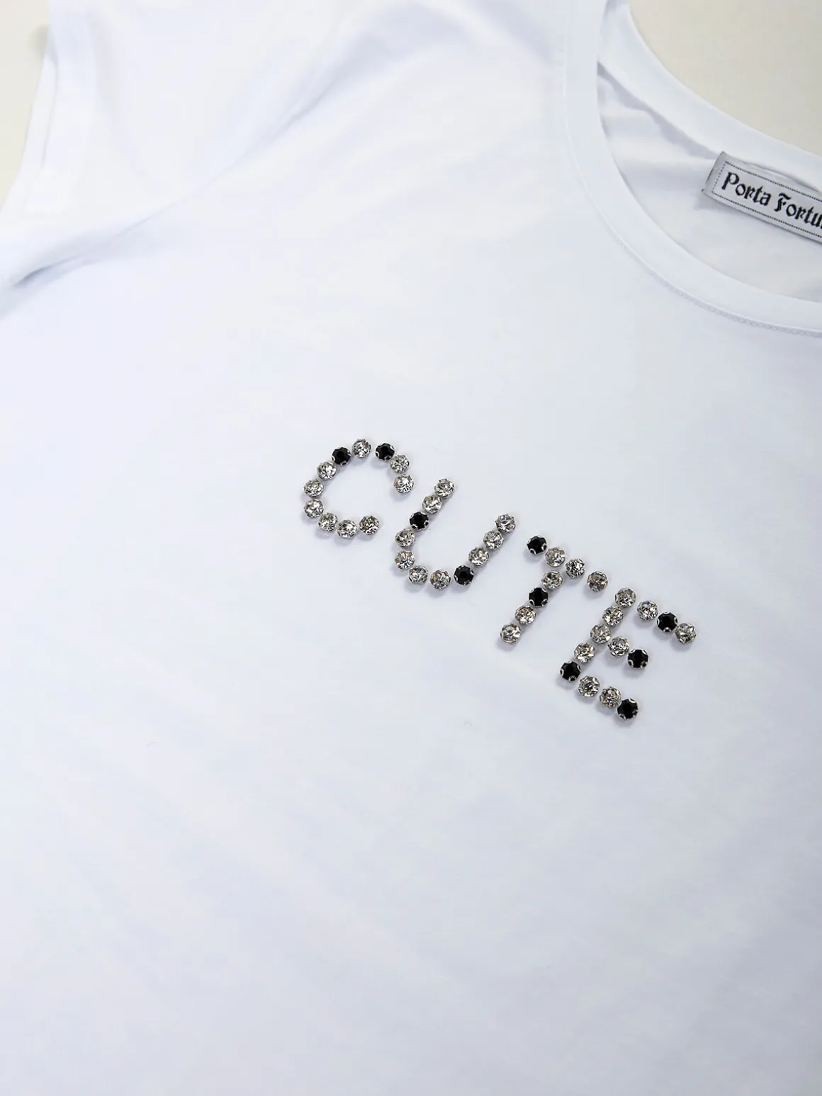 T-shirt de manga curta com aplicação de strass “CUTE” na parte frontal. Uma peça simples com um toque brilhante para looks casuais ou mais elegantes.Altura da Modelo: 166 cm | Tamanho: S/M