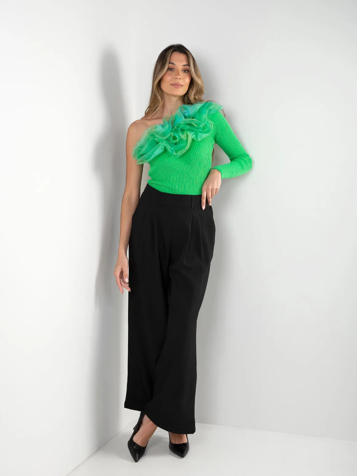 Top assimétrico malha canelada com tule
