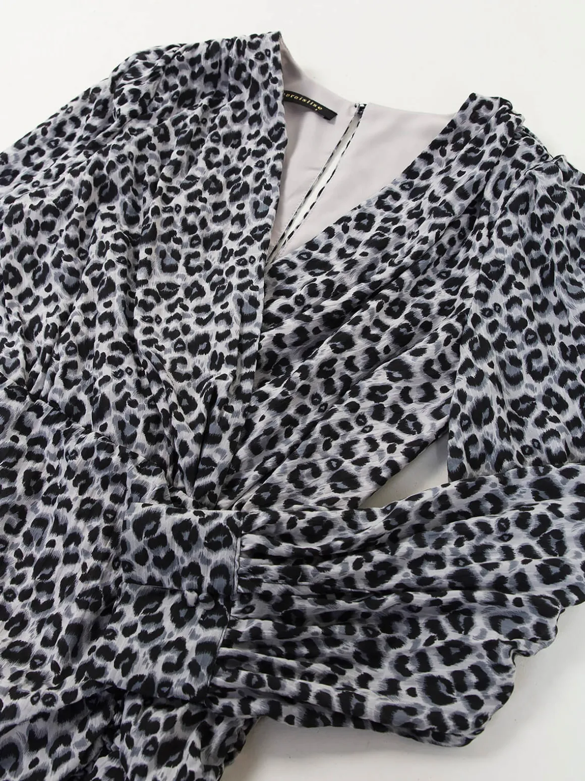 Vestido curto cinza animal print com decote em trespasse, manga comprida e detalhe franzido na zona da cintura. Modelo com saia fluida e acabamento com folho, interior forrado para maior conforto. Ideal para looks de dia ou noite, fácil de conjugar com botas ou salto alto.Altura da Modelo: 175 cm | Tamanho: S