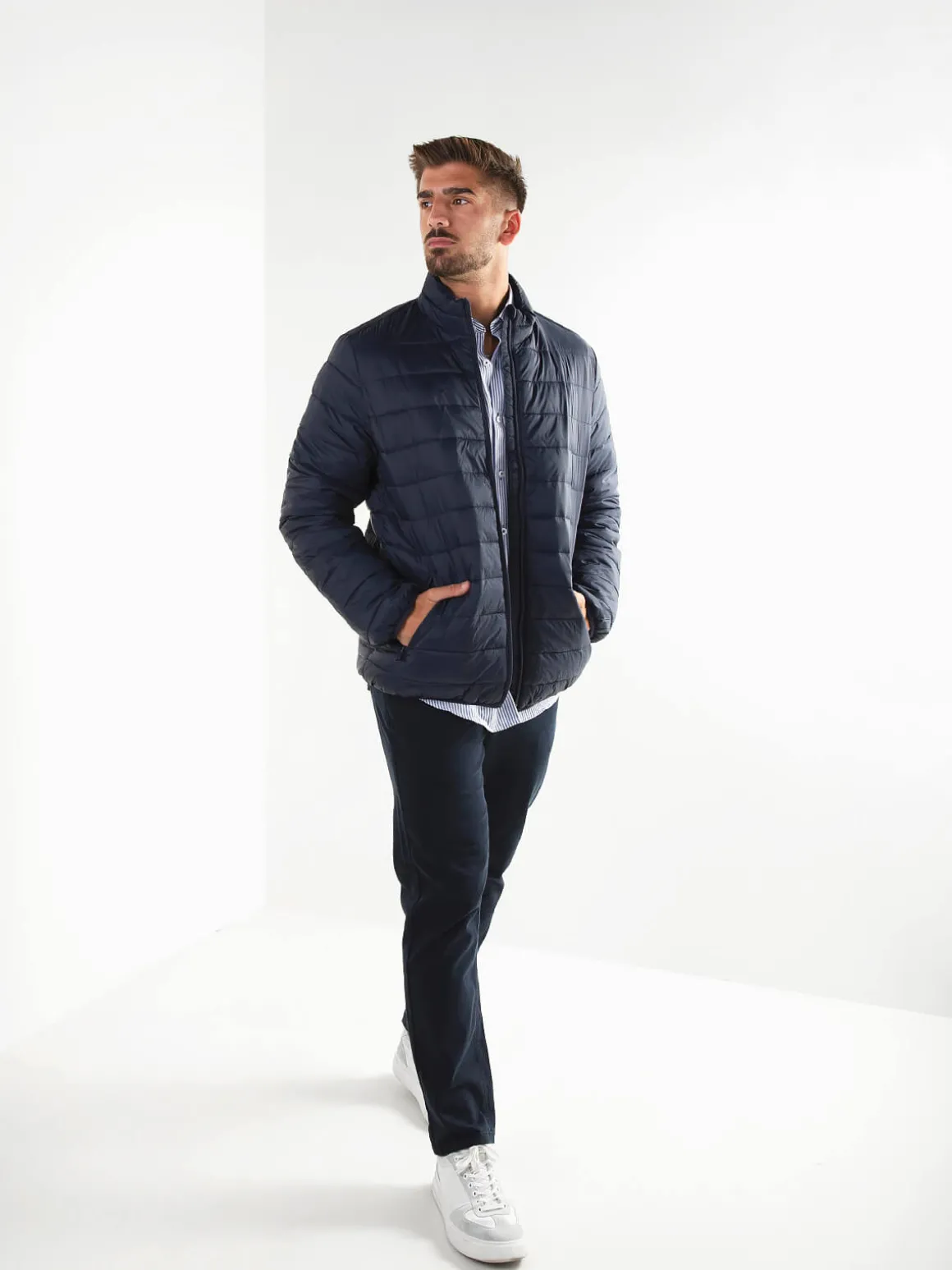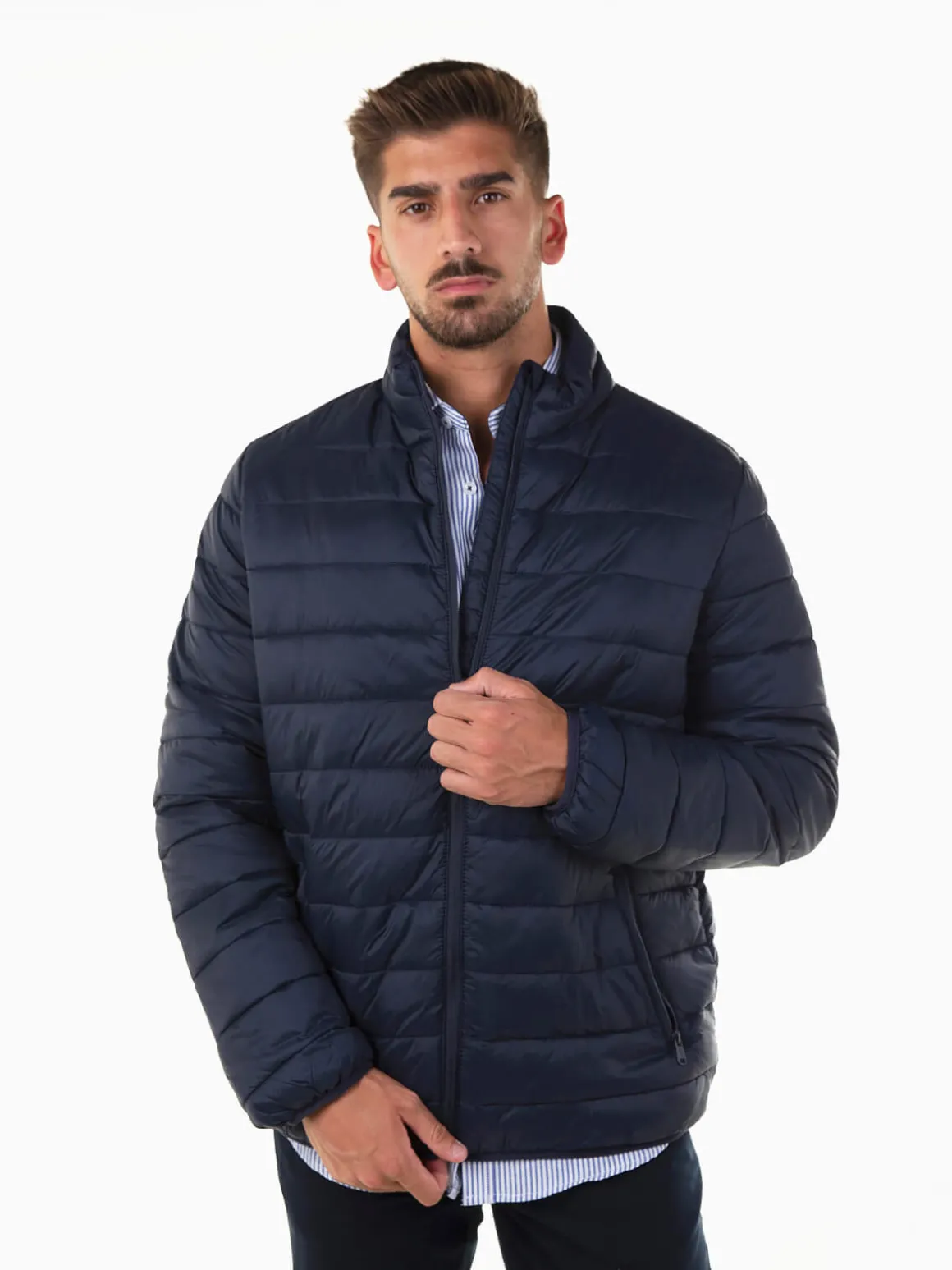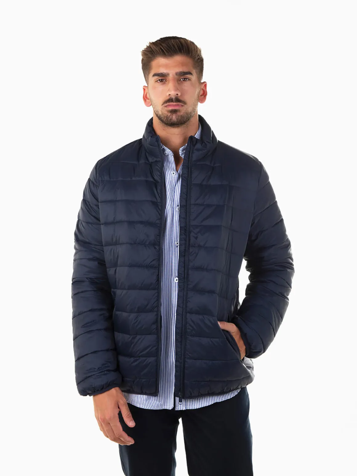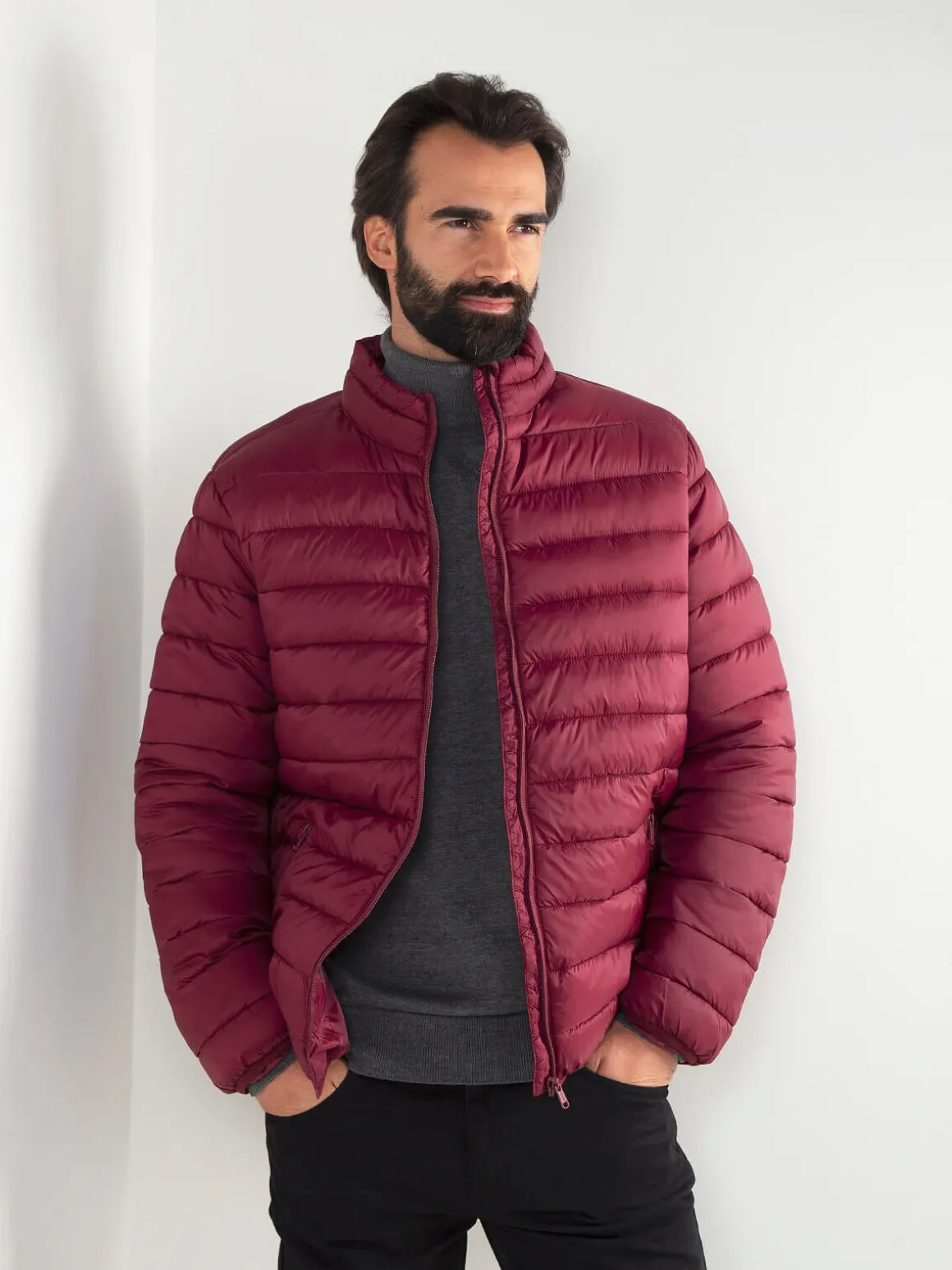 Blusão acolchoado para homem com gola subida e fecho de zíper. Modelo com dois bolsos exteriores e um bolso interior. Oferece proteção ligeira contra a chuva e total conforto no dia a dia — perfeito para looks casuais e práticos na nova estação.Altura do Modelo: 182 cm | Tamanho: L
