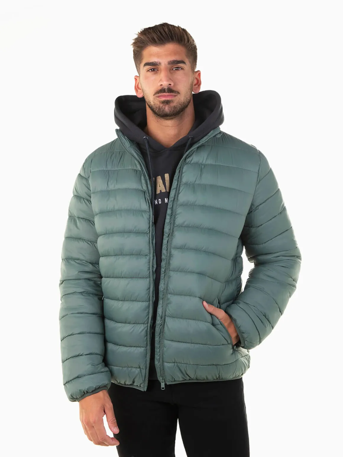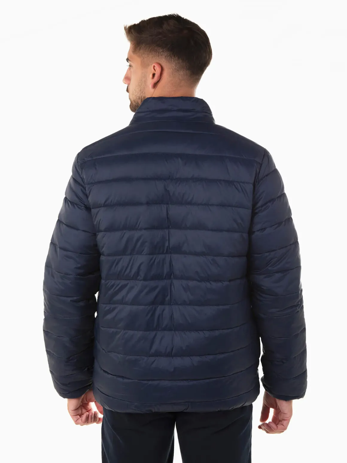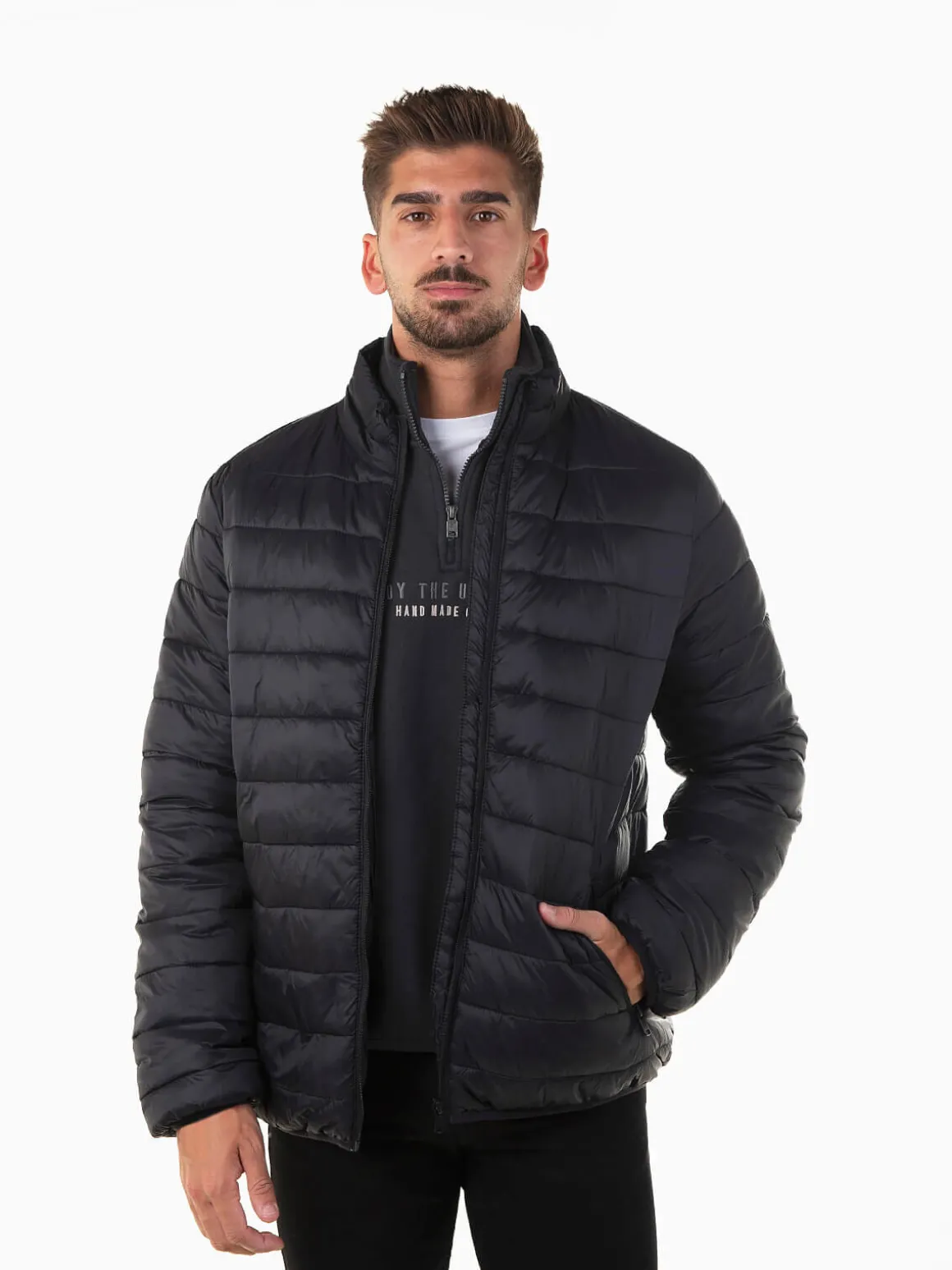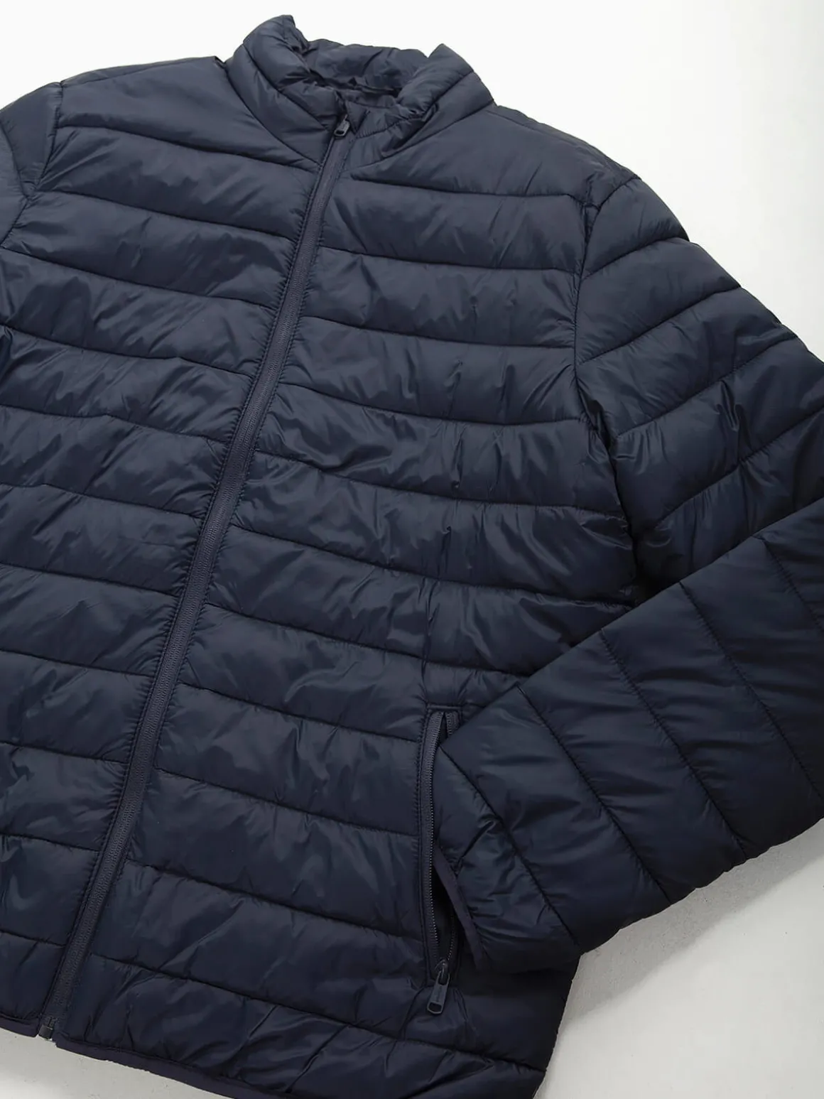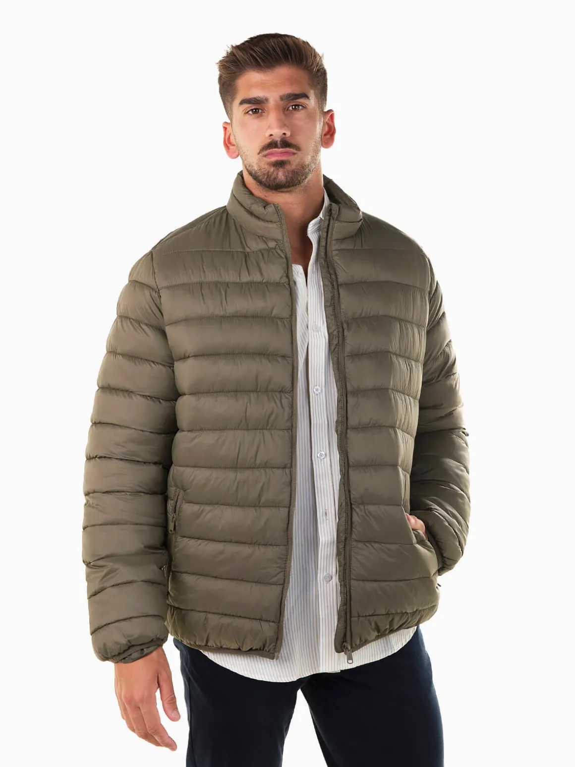 Blusão acolchoado para homem com gola subida e fecho de zíper. Modelo com dois bolsos exteriores e um bolso interior. Oferece proteção ligeira contra a chuva e total conforto no dia a dia — perfeito para looks casuais e práticos na nova estação.Altura do Modelo: 182 cm | Tamanho: L