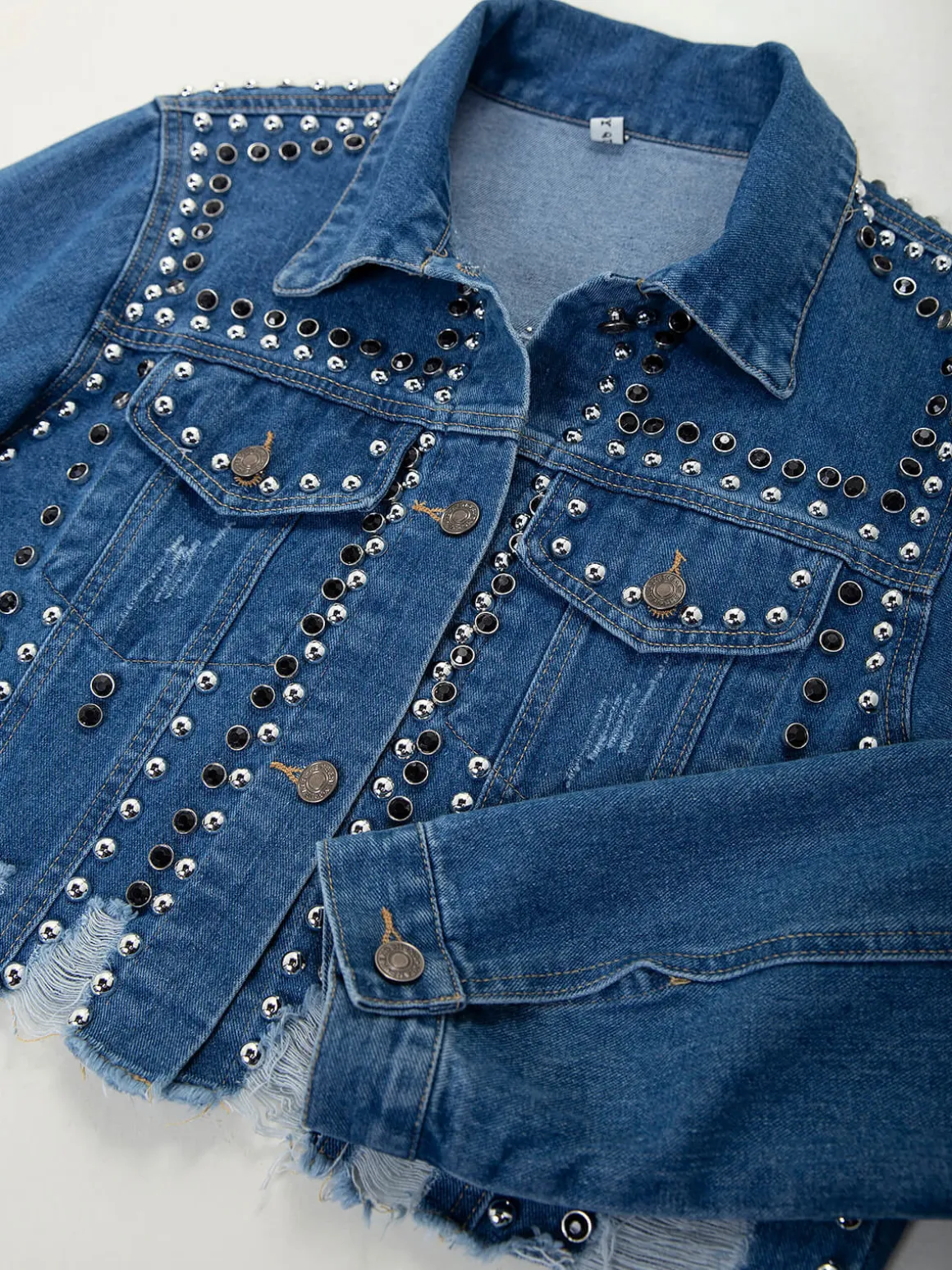 Blusão de ganga com tachas aplicadas e leves rasgos. Casaco curto manga comprida com punhos abotoados e gola abas. 2 bolsos. Lavagem azul escuro. Base desfiada. Aperto de botões. Altura da Modelo: 175 cm | Tamanho: Tamanho Único