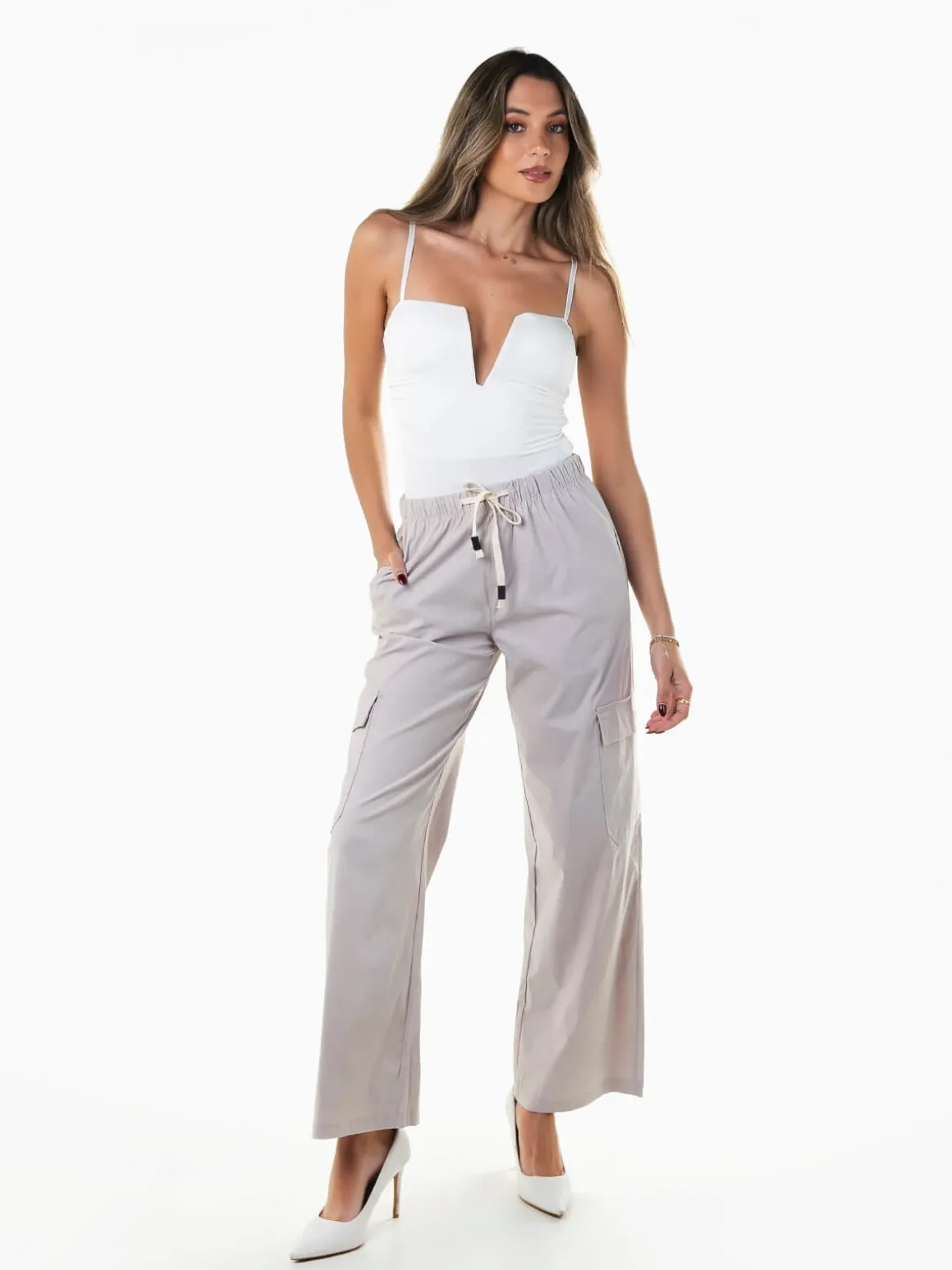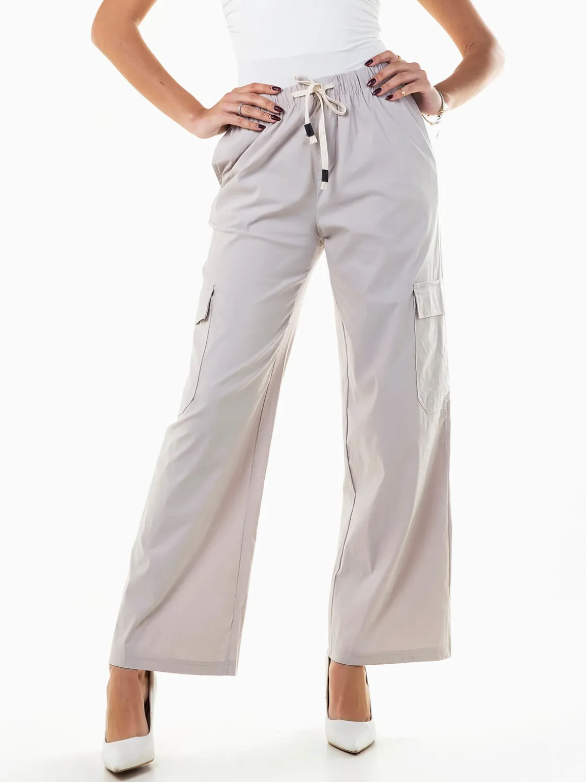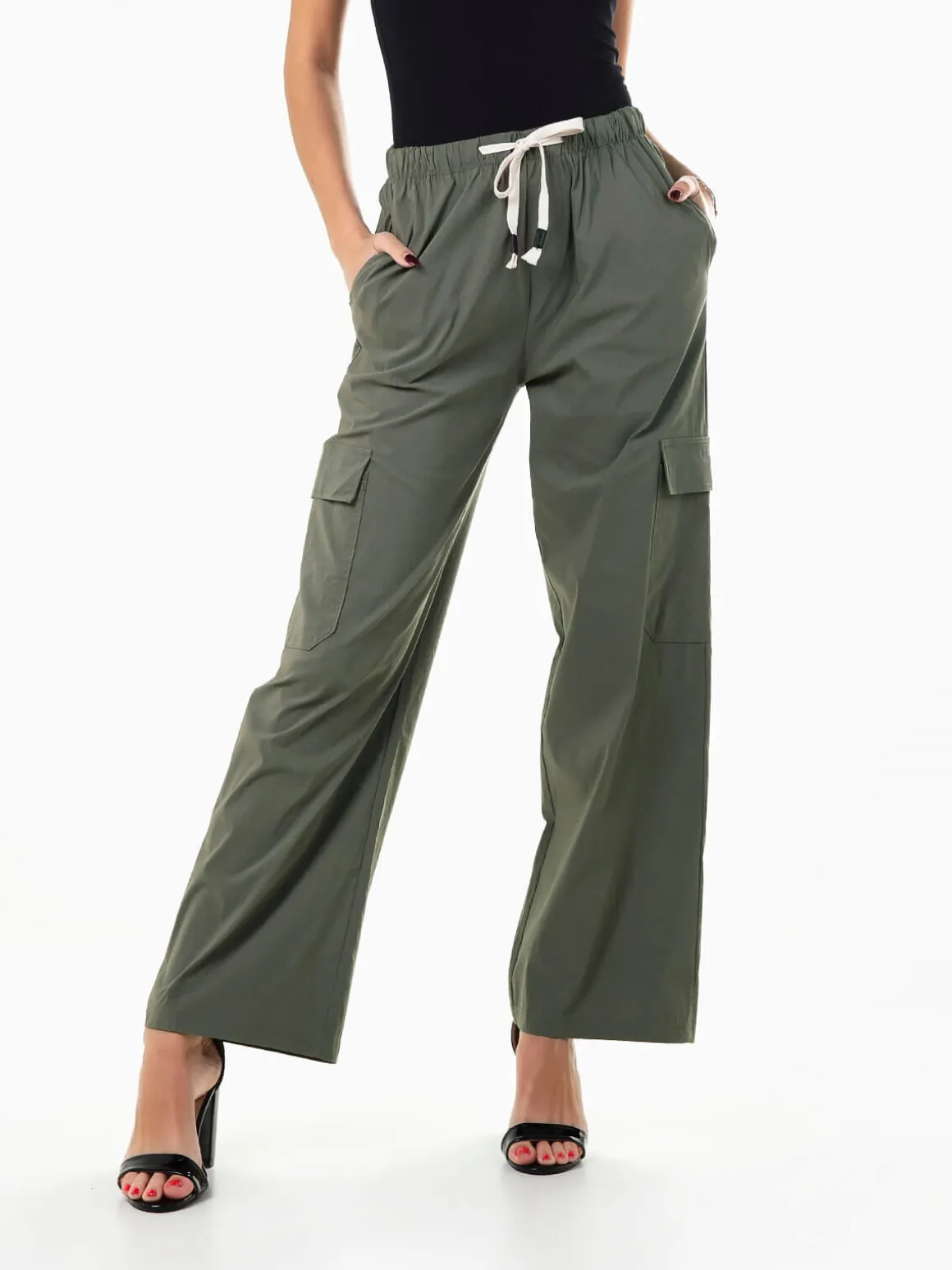 Calças cargo em tecido elástico com mistura de algodão para maior conforto e respirabilidade. Calças largas de cintura alta elástica com cordão para ajustar. 6 bolsos.Altura da Modelo: 175 cm | Tamanho: M/L