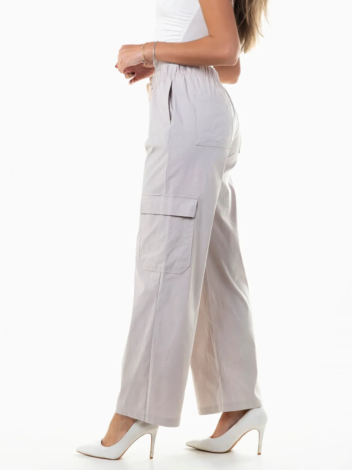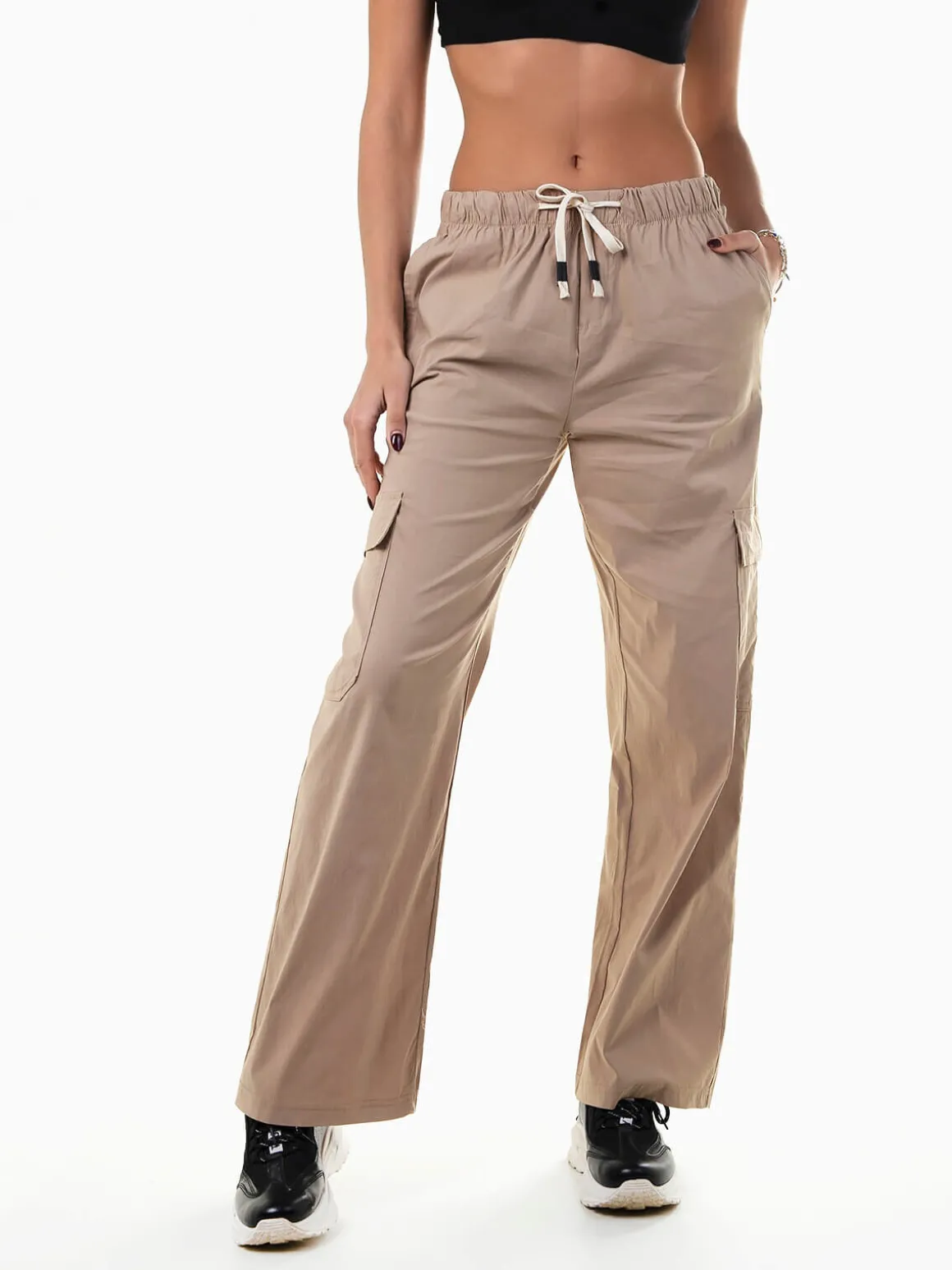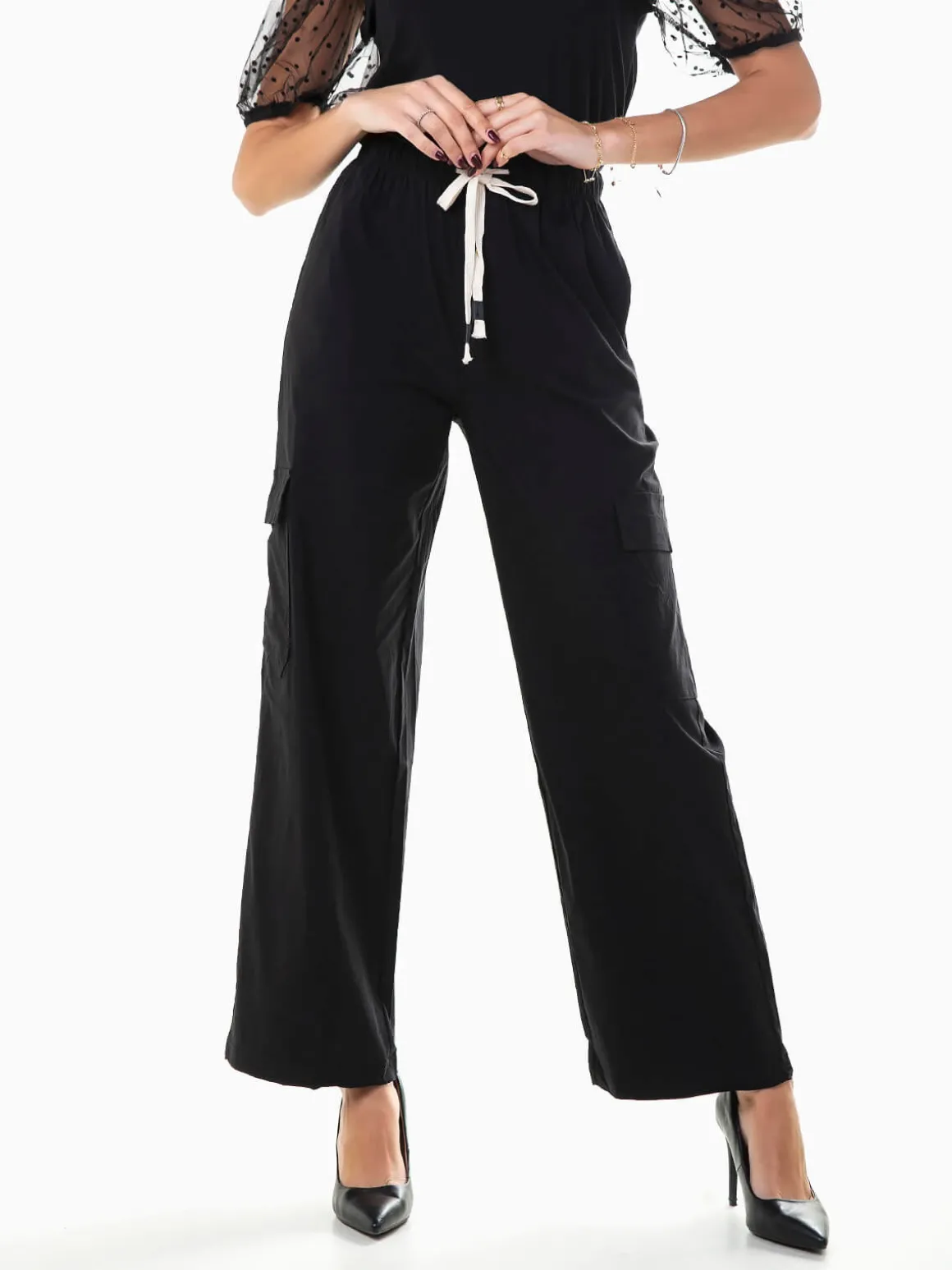 Calças cargo em tecido elástico com mistura de algodão para maior conforto e respirabilidade. Calças largas de cintura alta elástica com cordão para ajustar. 6 bolsos.Altura da Modelo: 175 cm | Tamanho: M/L