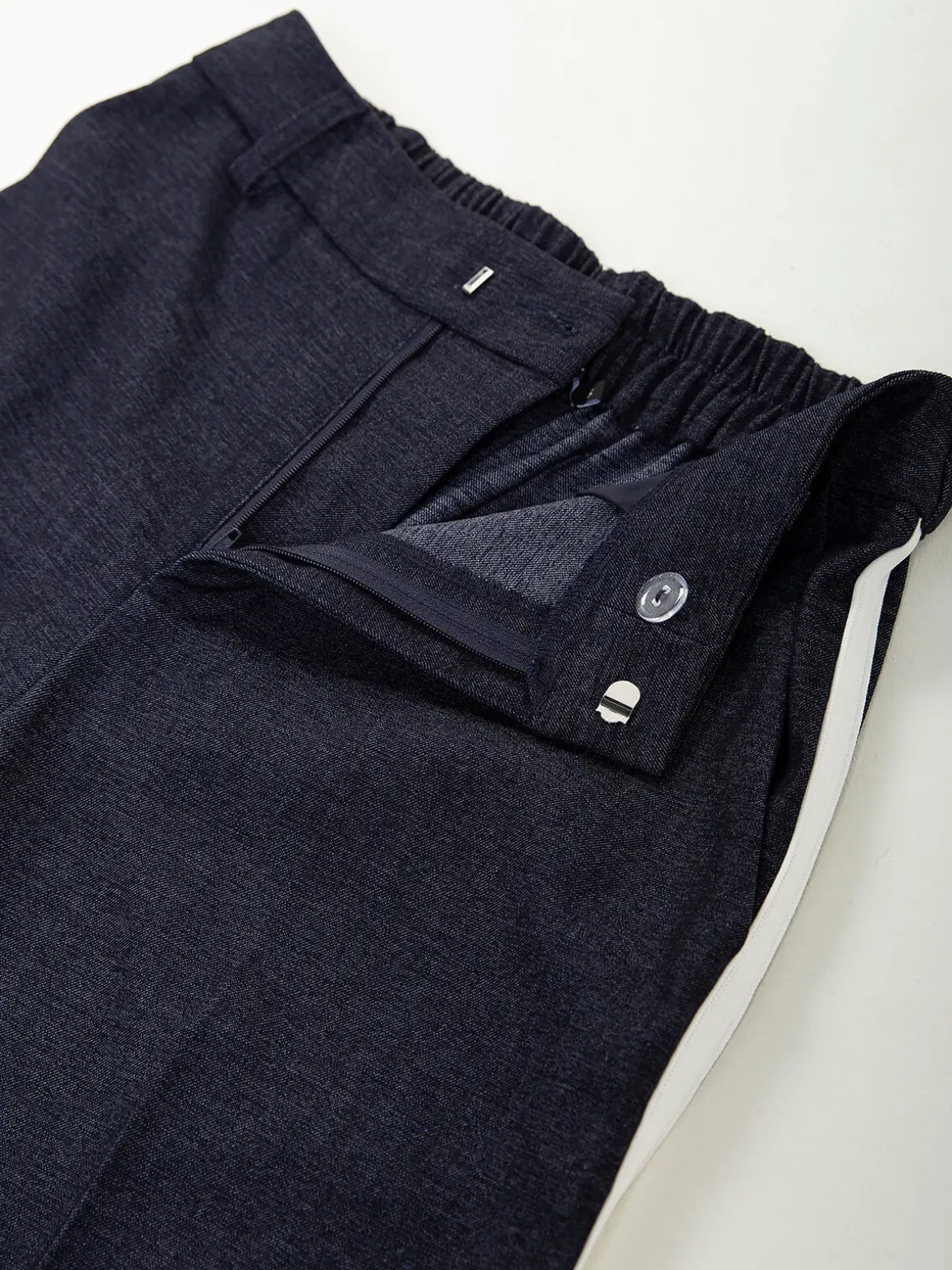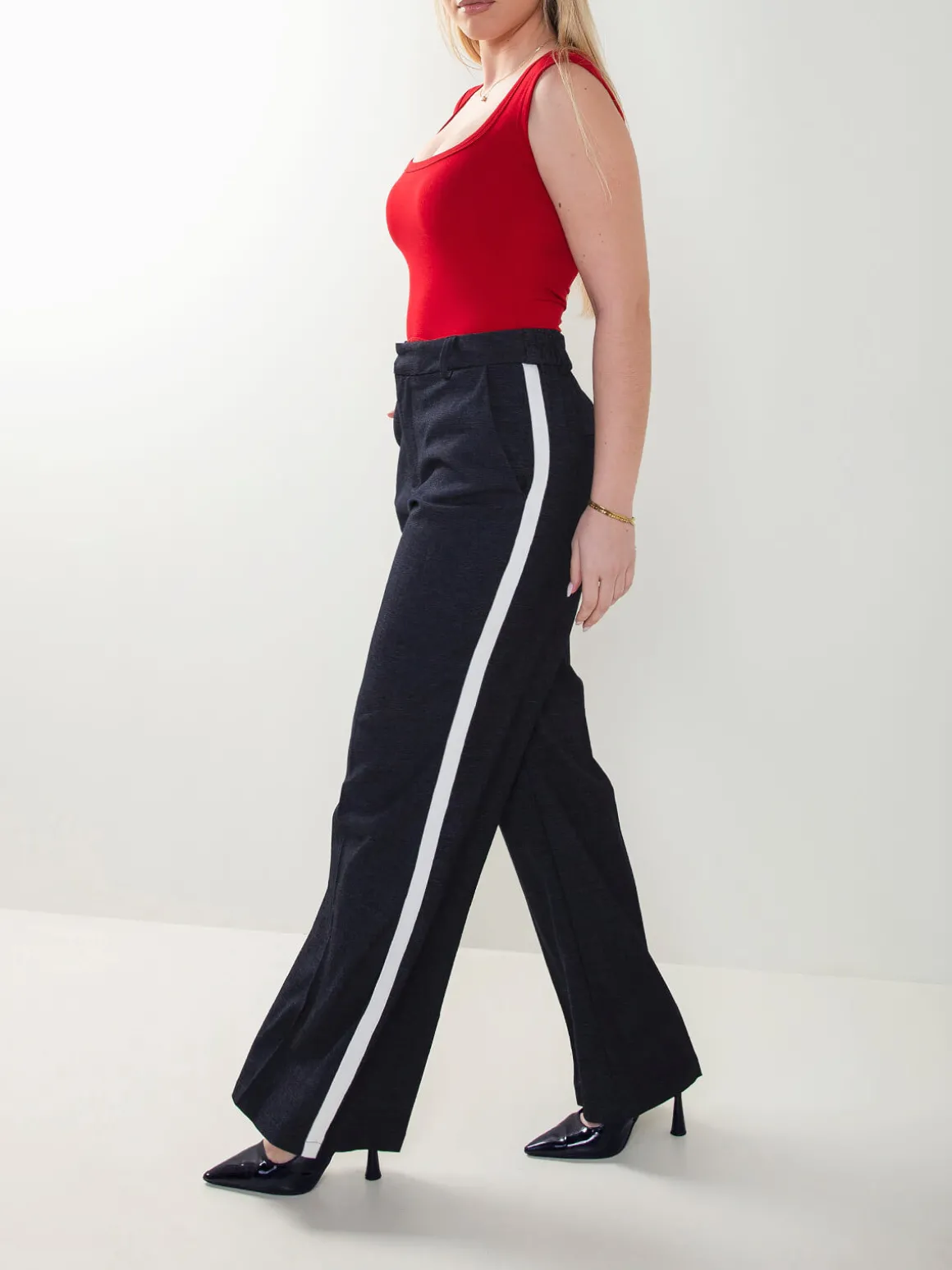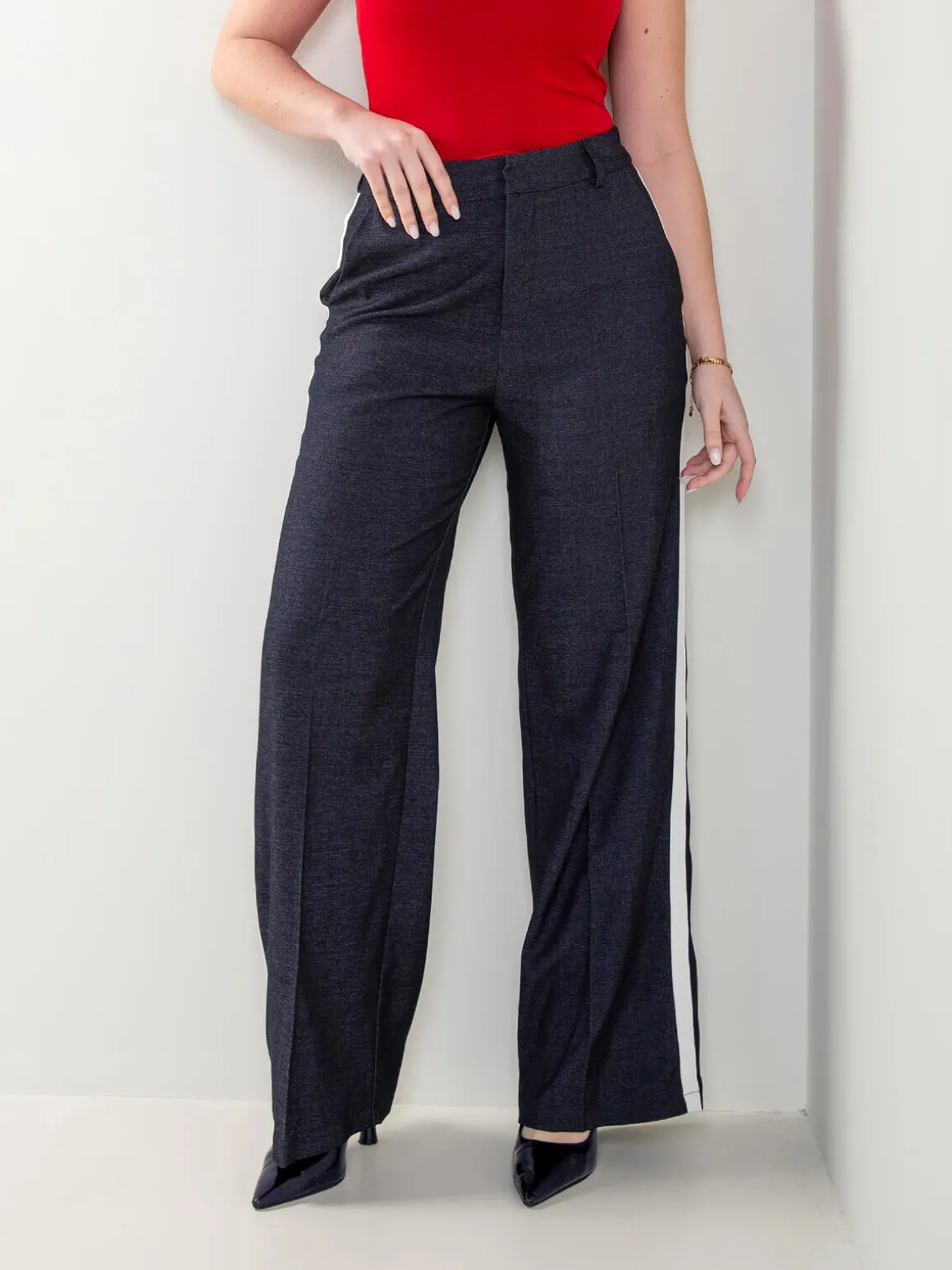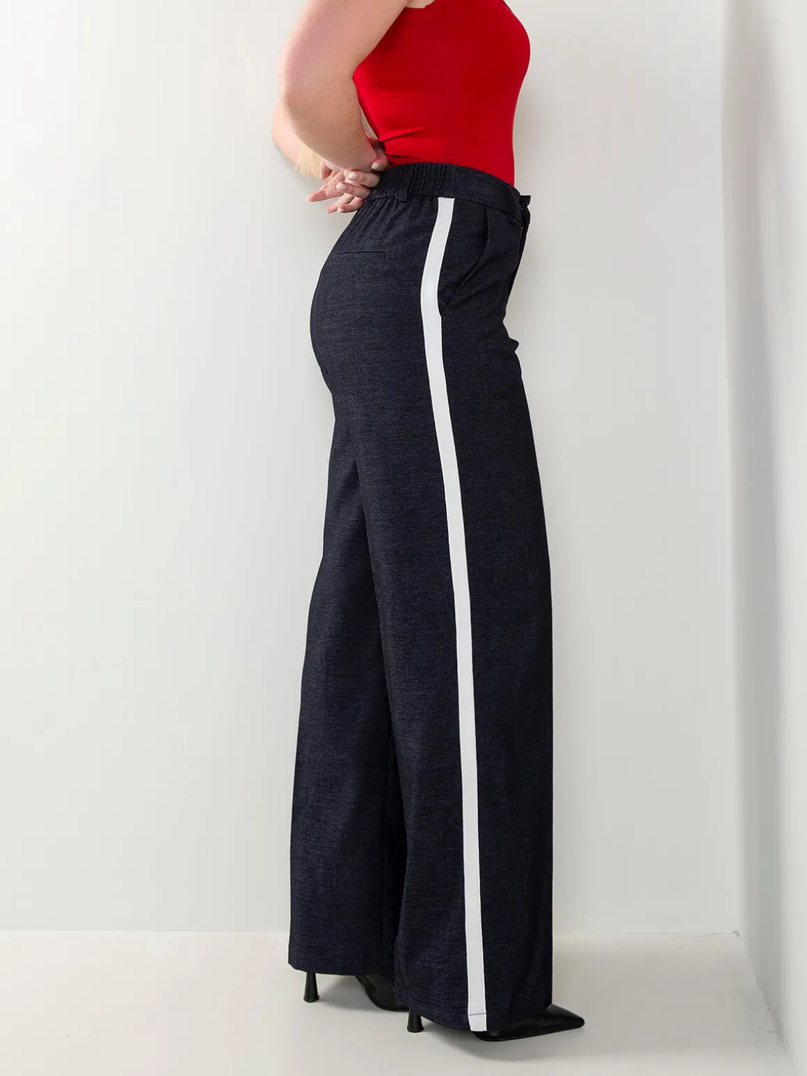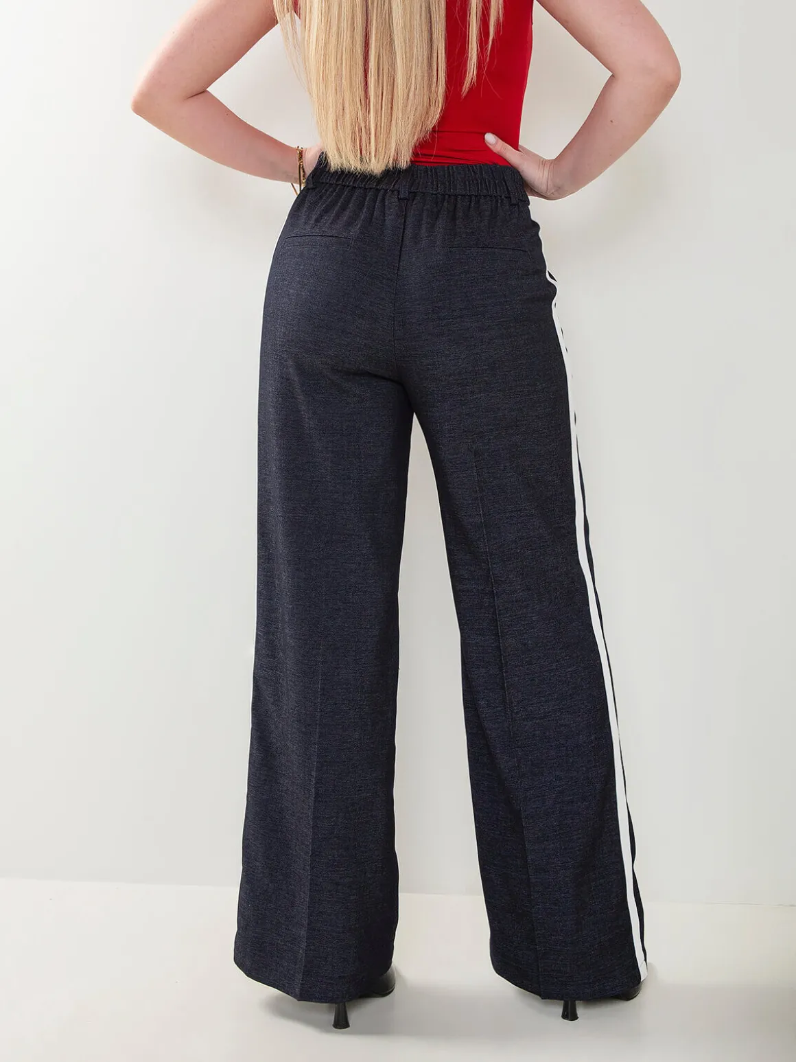 Calças fluídas azul marinho com cintura alta elástica e perna larga. Elegantes e confortáveis com 2 bolsos, aperto de colchete, fecho e botão. Ideais para looks de trabalho ou combinações mais descontraídas com tops ajustados, camisas ou blazers.Altura da Modelo: 166 cm | Tamanho: S