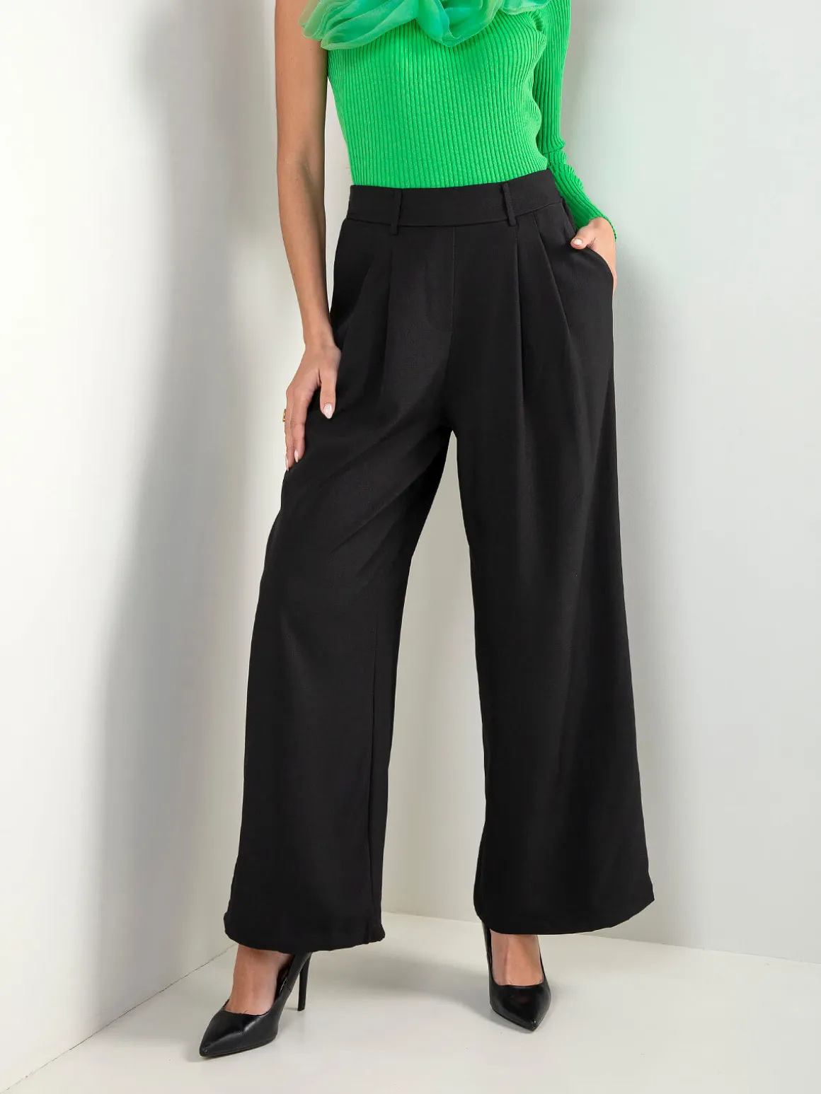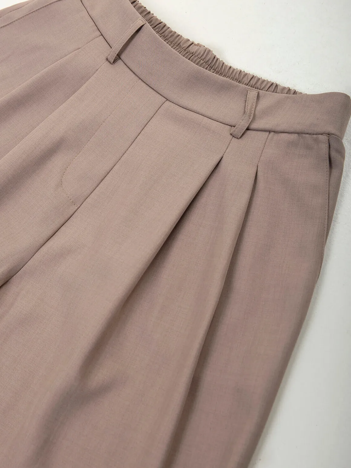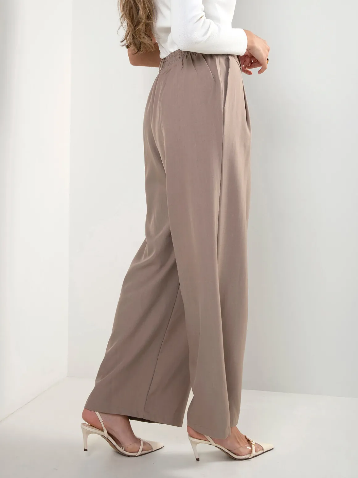 Calças fluídas de cintura alta com cós elástico e dois bolsos laterais. Modelo confortável e elegante, ideal para looks de alfaiataria. Blazer a combinar disponível.Altura da Modelo: 175 cm | Tamanho: S/M