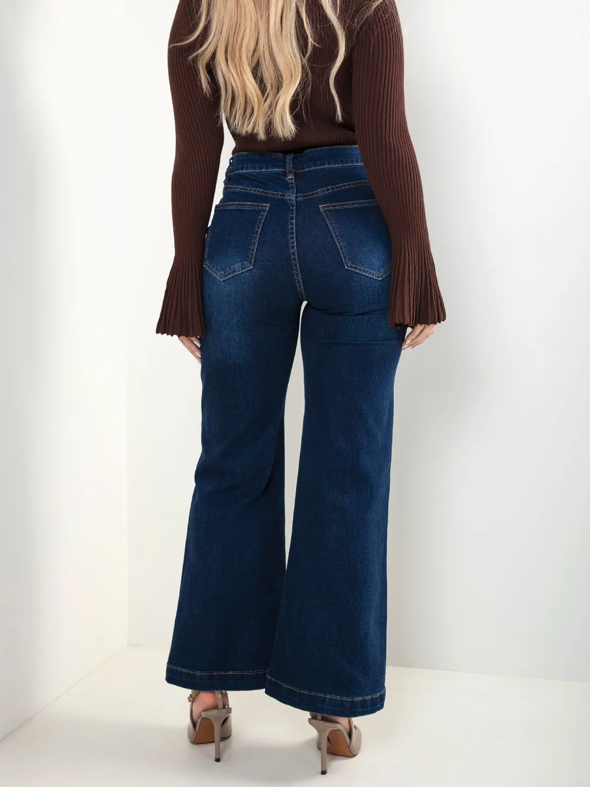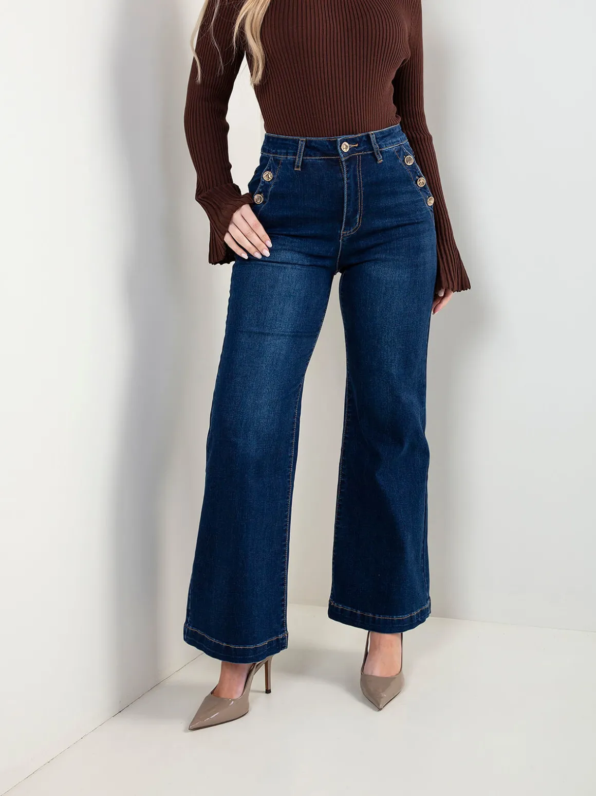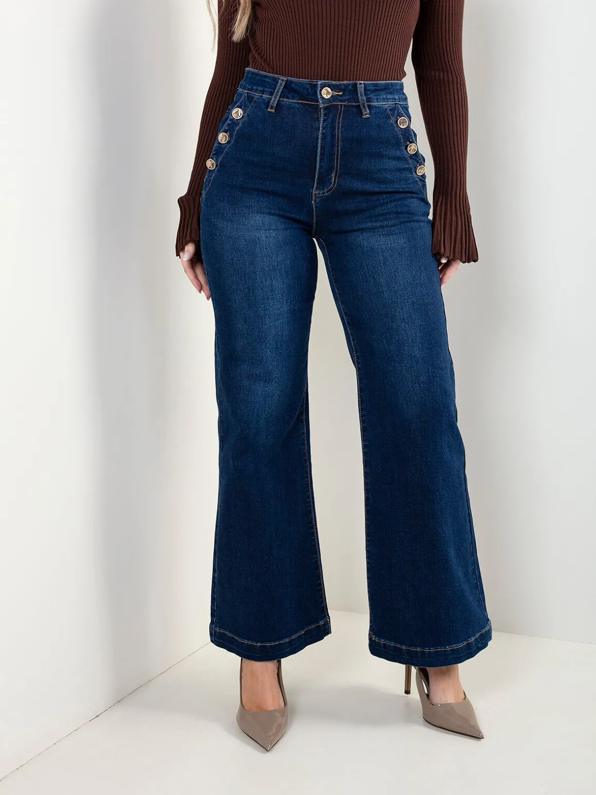 Calças de ganga de cintura alta com botões dourados nos bolsos e lavagem azul escuro. Corte elegante e estruturado, ideais para looks do dia a dia com um toque mais sofisticado. Altura da Modelo: 166 cm | Tamanho: 36