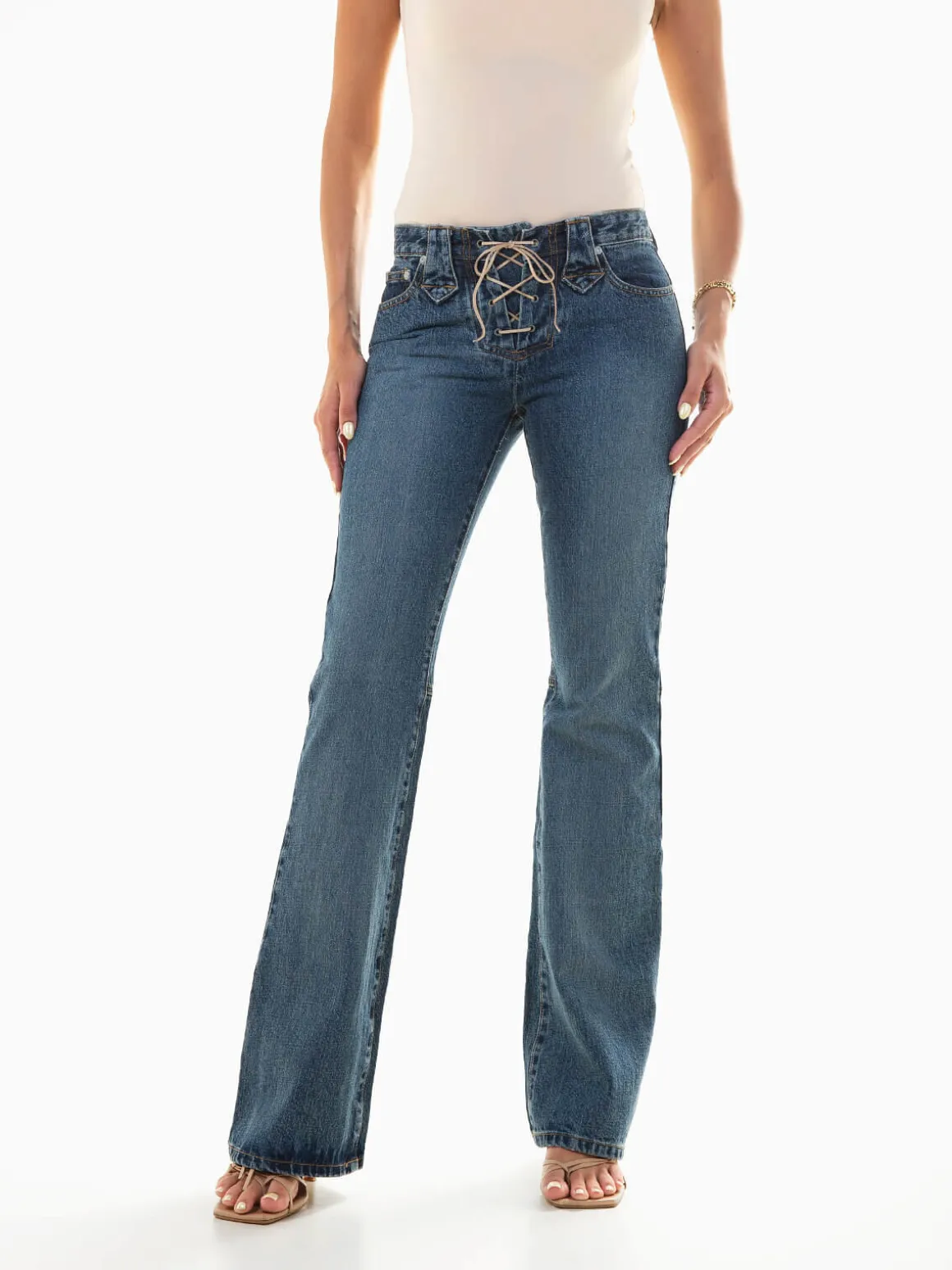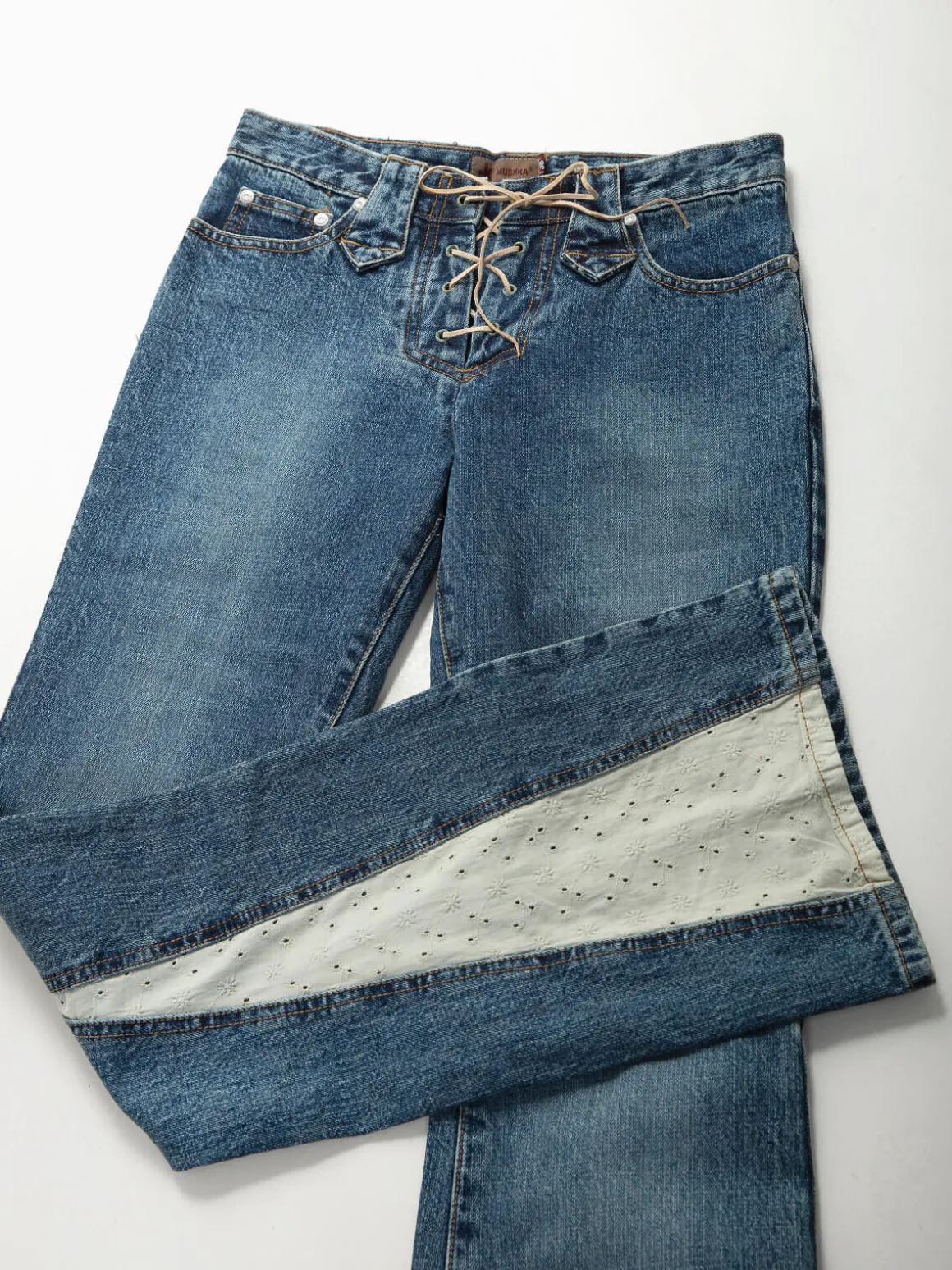 Calças de ganga à boca de sino com tecido bordado na parte posterior. Jeans de cintura baixa com lavagem azul escuro e 3 bolsos. Aperta com cordão e botão. Altura da Modelo: 175 cm | Tamanho: 38