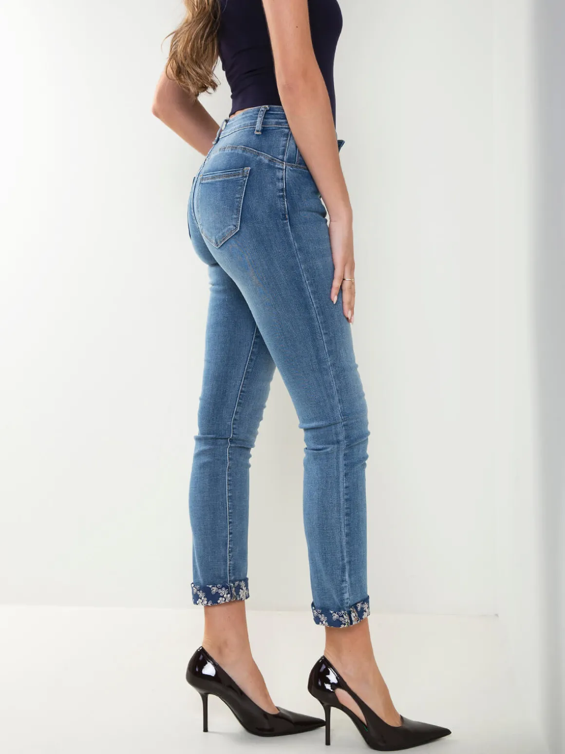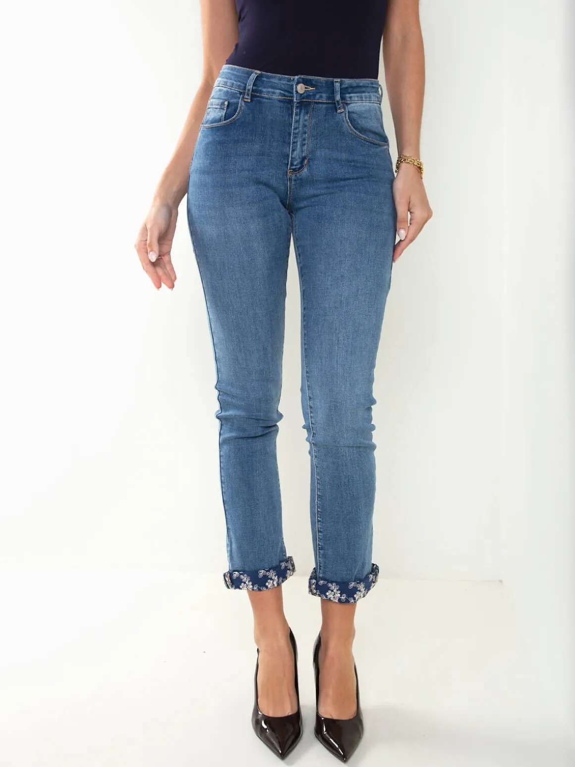 Calças de ganga de cintura média com estrutura 5 bolsos e fecho de correr com botão. Modelo skinny em lavagem azul com detalhe estampado na dobra da bainha. Versáteis e fáceis de conjugar, ideais para looks do dia a dia.Altura da Modelo: 175 cm | Tamanho: 36