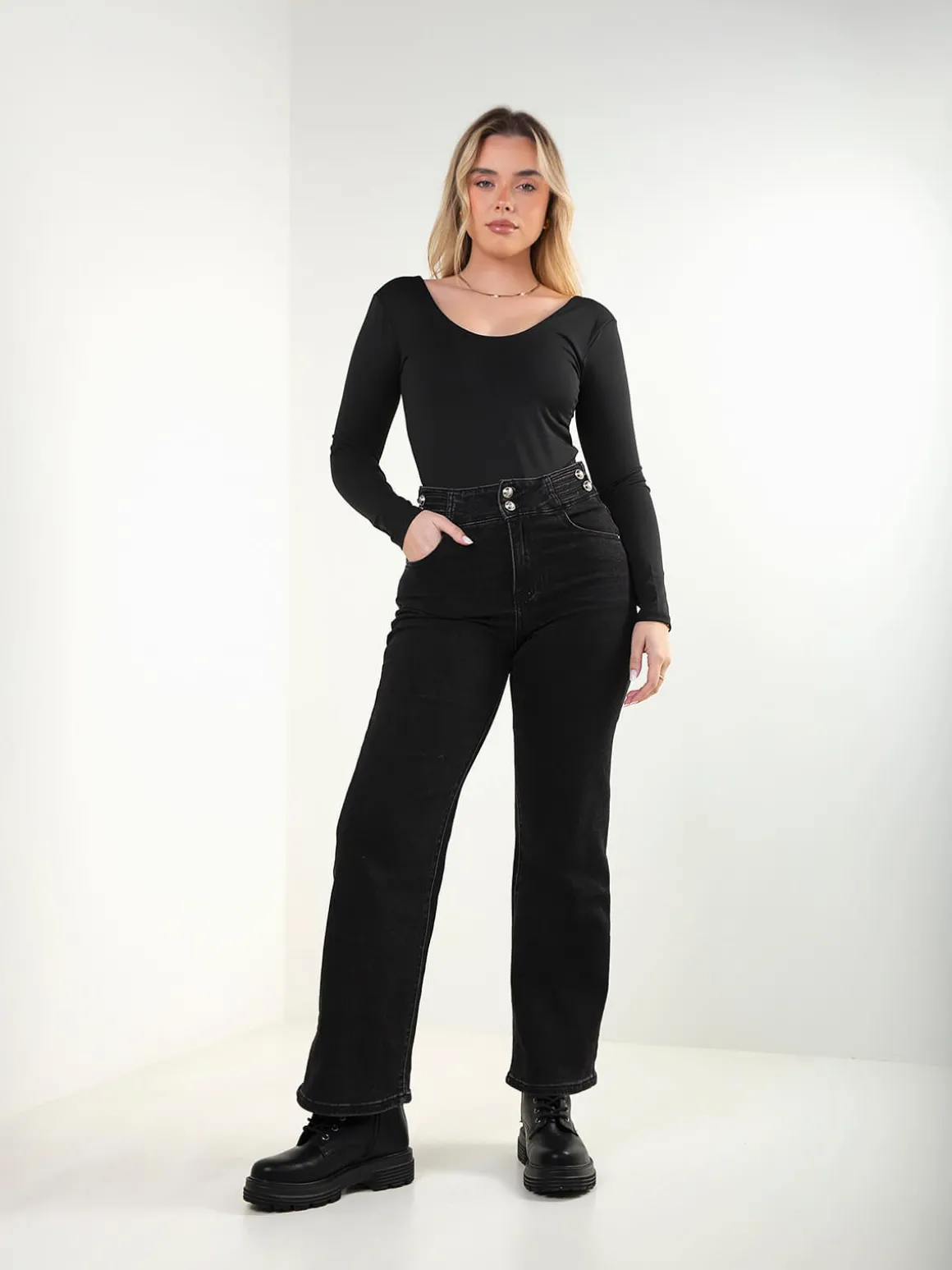Calças de ganga pretas com cintura alta, fecho éclair e aperto de dois botões. Modelo de perna reta com 5 bolsos, confortável e perfeito para looks simples e modernos.Altura da Modelo: 166 cm | Tamanho: 38