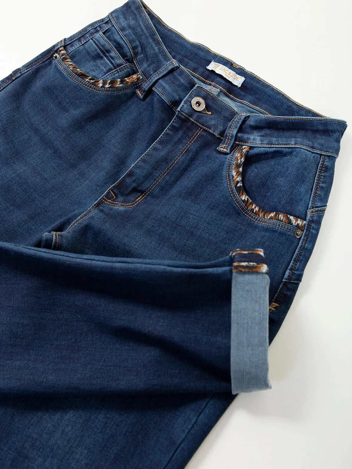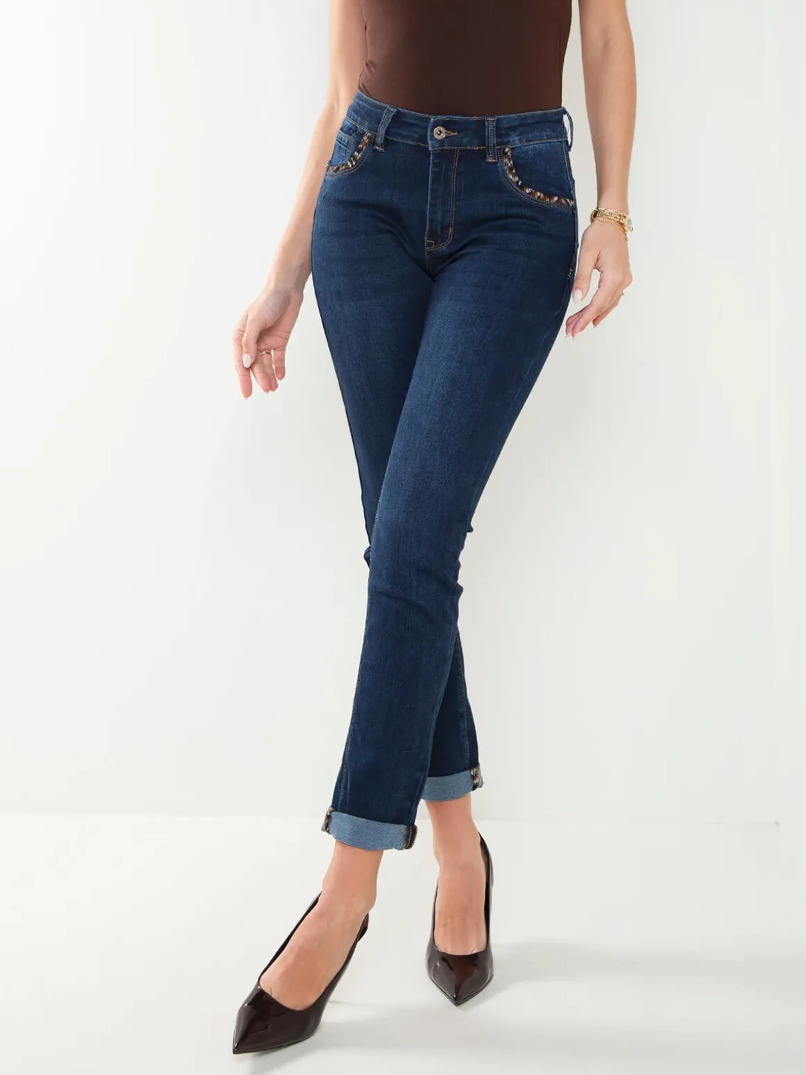 Calças de ganga efeito push-up com lavagem azul médio e detalhe animal print nos bolsos. Confortáveis, versáteis e perfeitas para looks casuais ou mais descontraídos.Altura da Modelo: 175 cm | Tamanho: 36