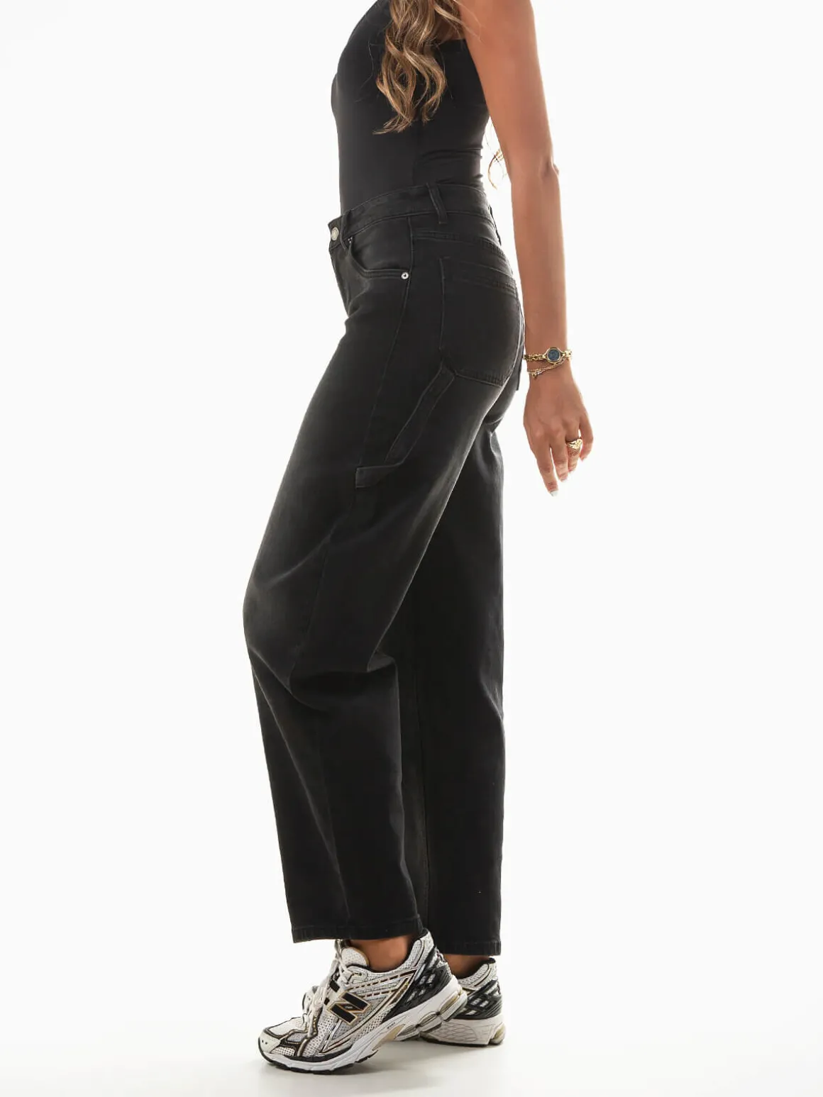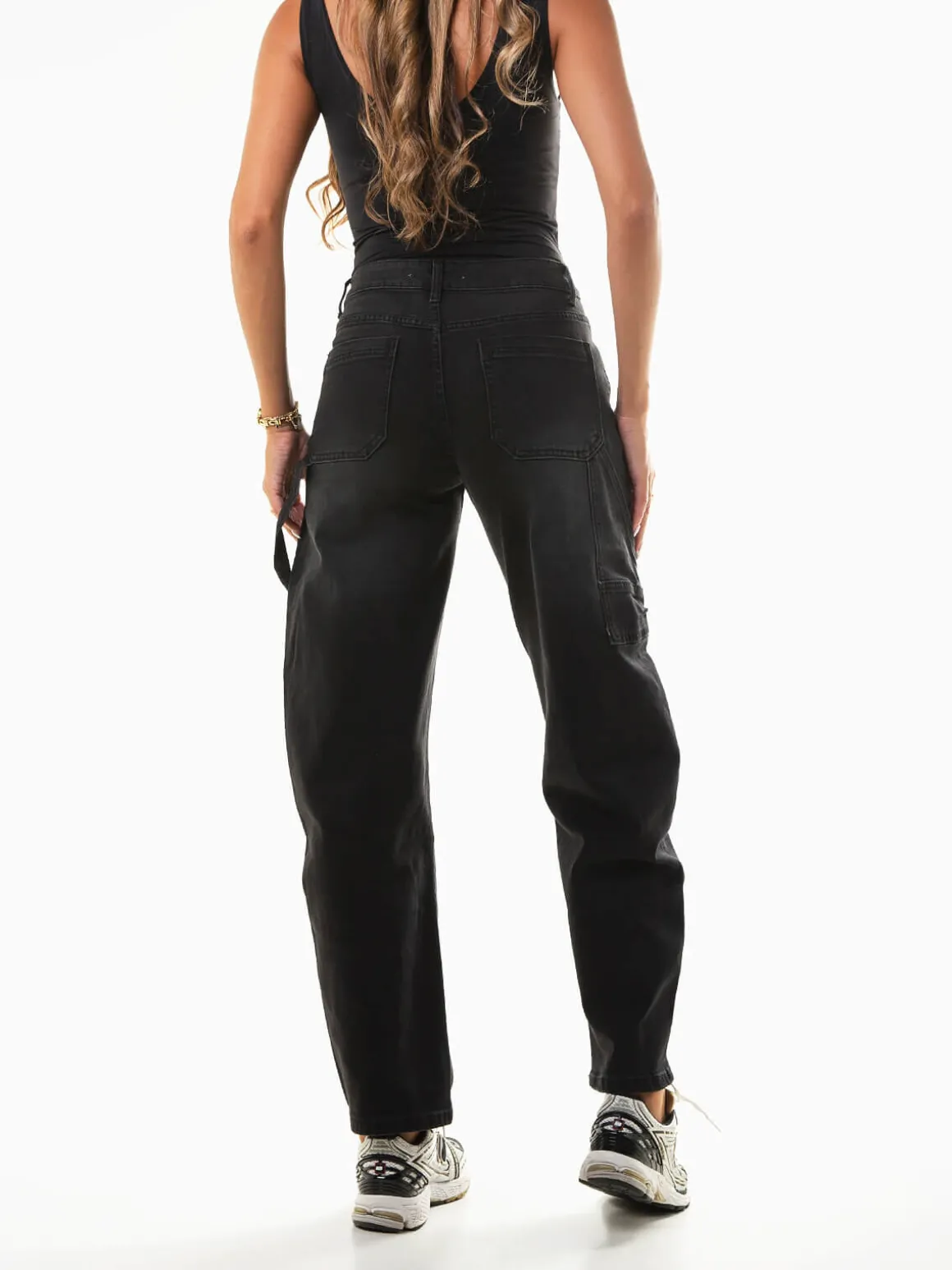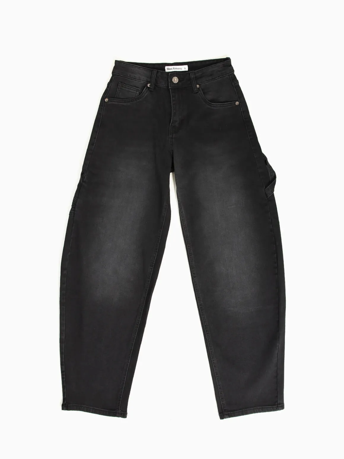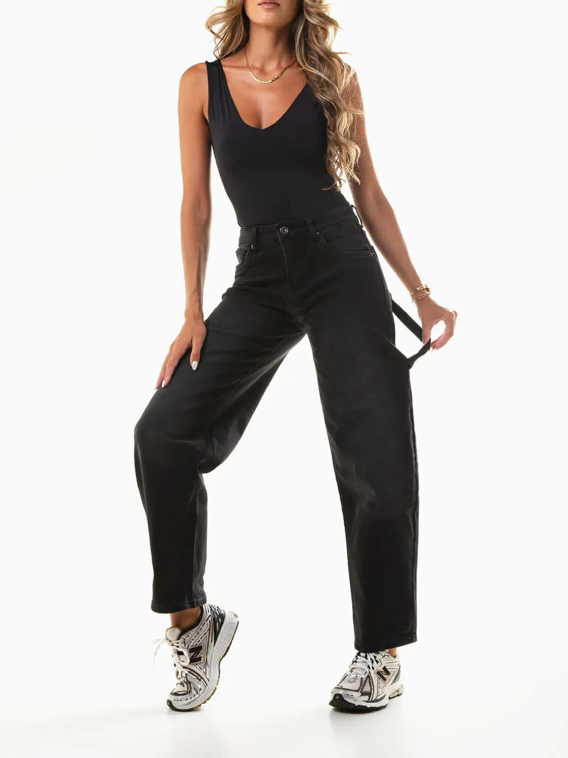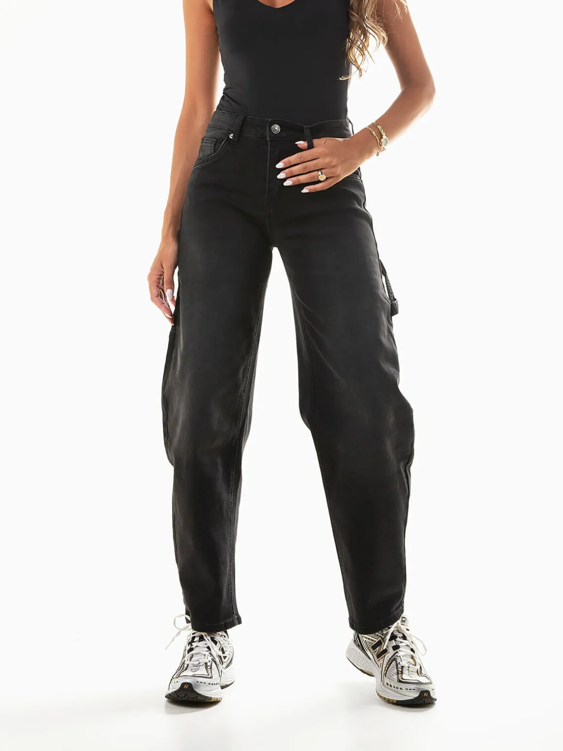 Calças de ganga pretas estilo skater, com cintura média e corte largo. Modelo de 5 bolsos, com fecho éclair e botão. O detalhe de fivela decorativa na lateral acrescenta um toque moderno e irreverente ao design clássico. Combina com uma t-shirt cropped e ténis chunky para um look urbano cheio de atitude.Altura da Modelo: 175 cm | Tamanho: S