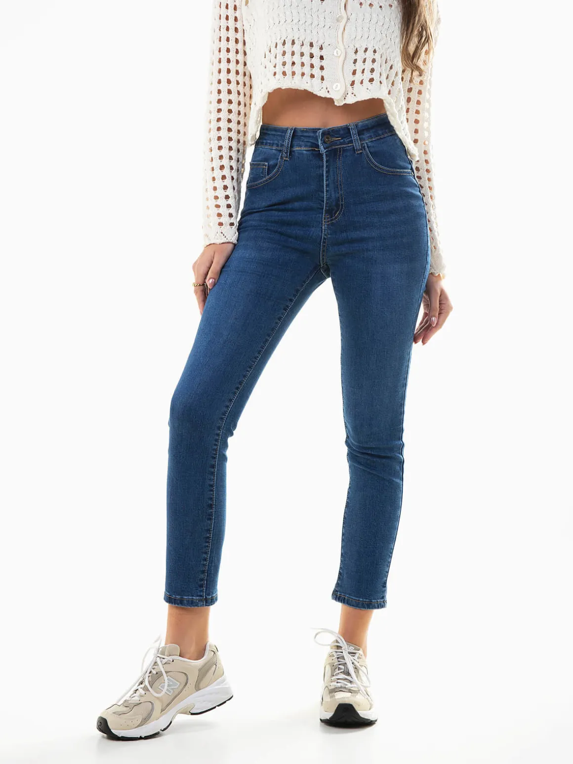 Calças de ganga skinny fit com lavagem azul escuro para mulher. Push-up jeans de cintura alta com 5 bolsos. Aperto de fecho éclair e botão. Altura da Modelo: 175 cm | Tamanho: 38