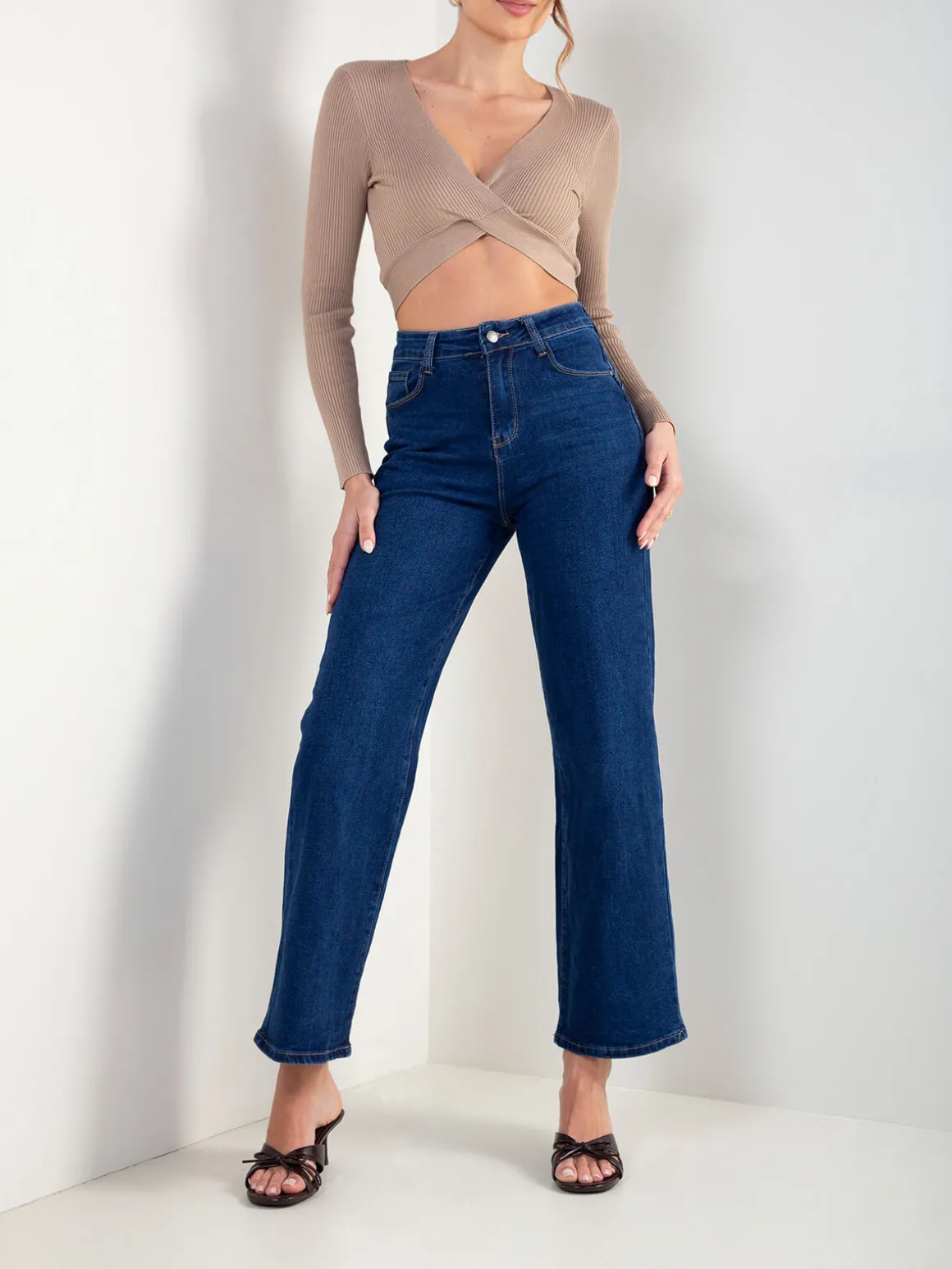 Calças de ganga wide leg em denim elástico, com cintura alta e efeito push-up. Lavagem azul escuro e 5 bolsos. Modelo confortável, atual e versátil, ideal para looks do dia a dia ou mais urbanos.Altura da Modelo: 175 cm | Tamanho: 36