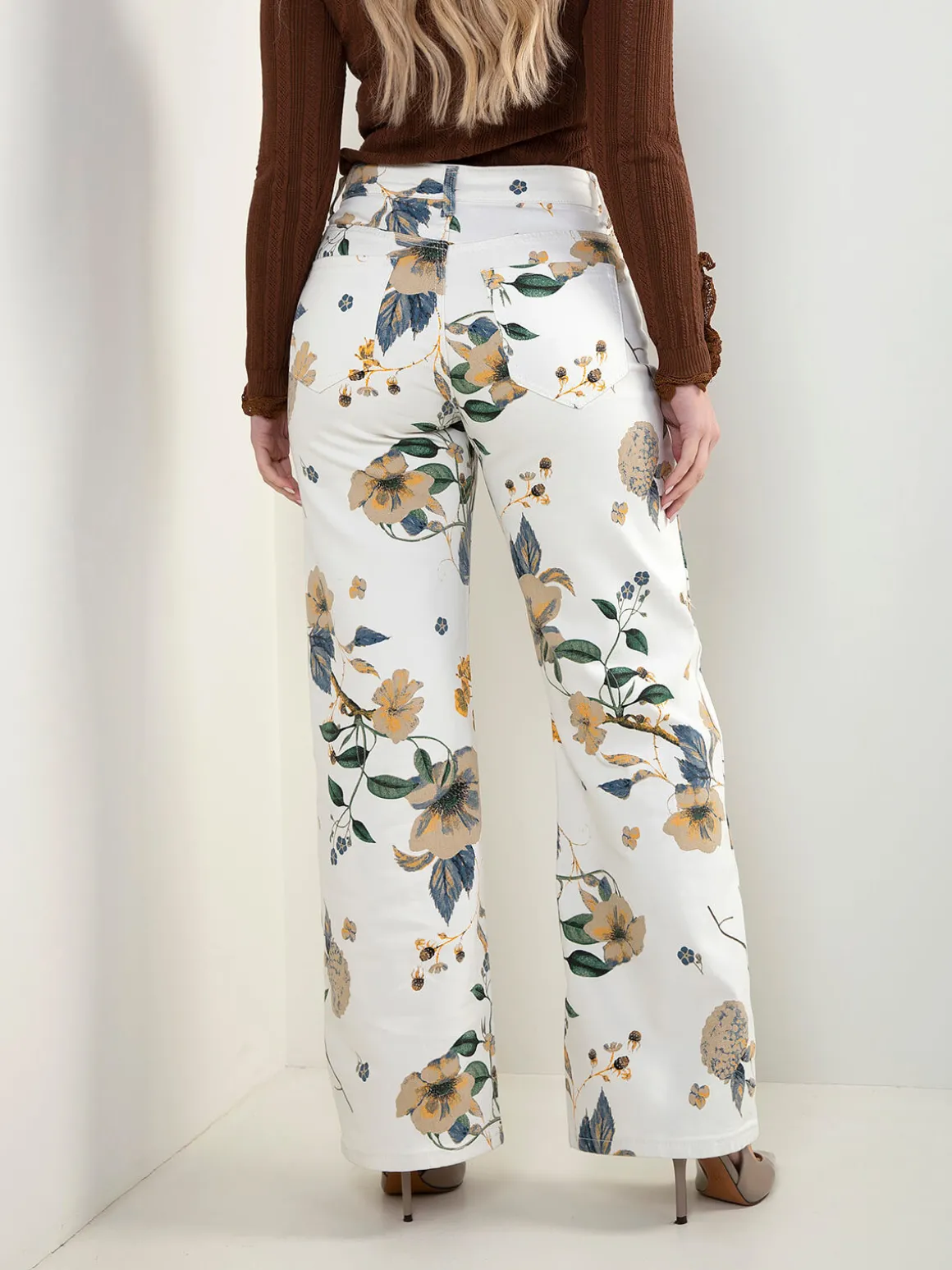 Calças de ganga pérola de cintura alta com corte wide leg e padrão floral. Modelo de 5 bolsos, fecho de correr e botão. Ideais para looks de primavera com um toque feminino.Altura da Modelo: 166 cm | Tamanho: S