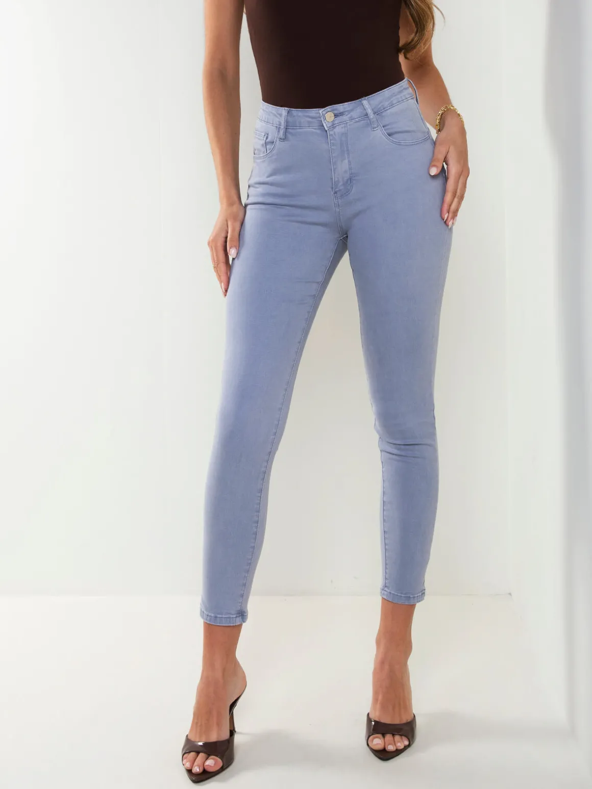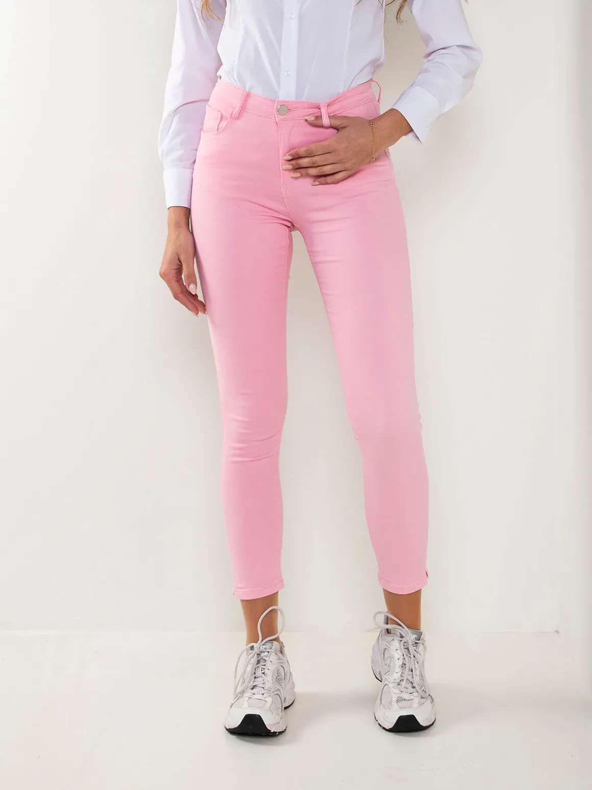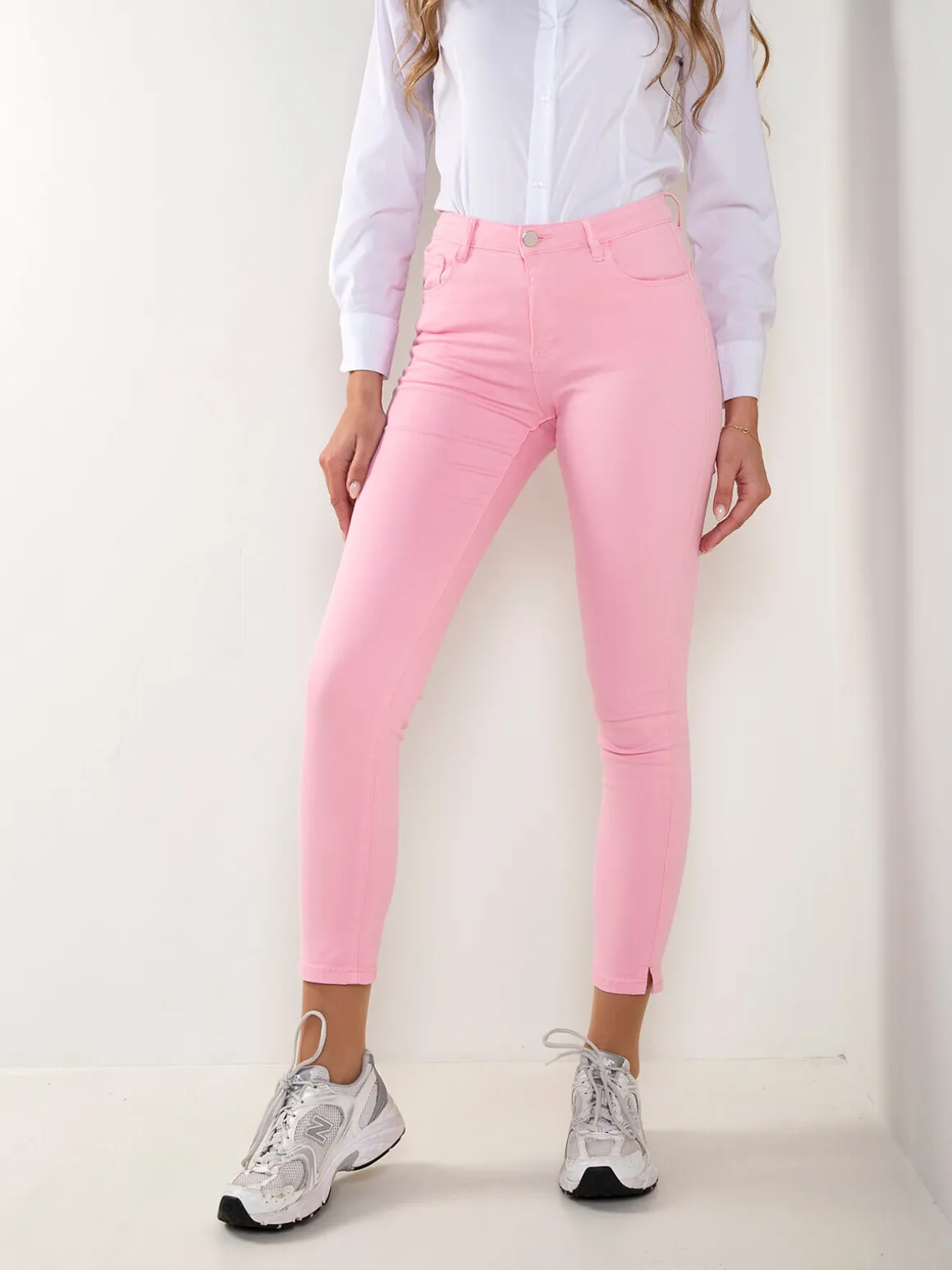 Calças justas de ganga de cintura alta para senhora. Calças com efeito push-up e pormenor de aberturas na base. 5 bolsos. Aperto de fecho éclair e botão.Hauteur du mannequin: 175 cm | Taille: 38