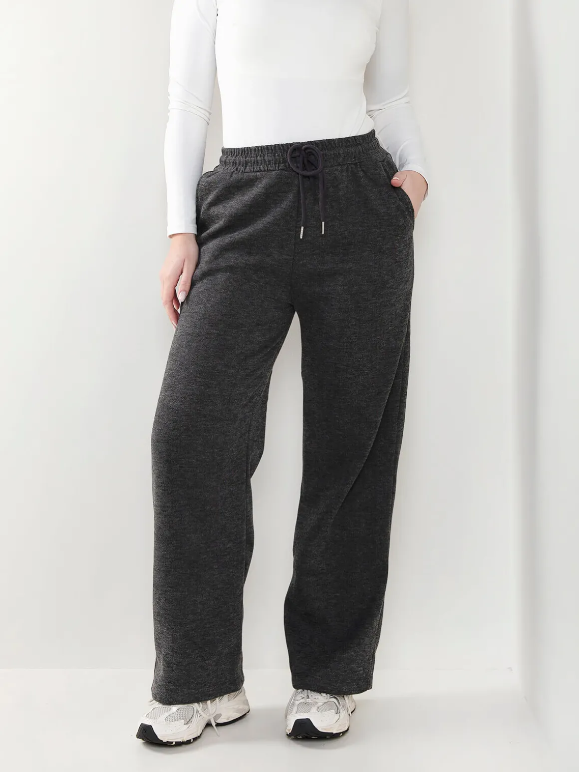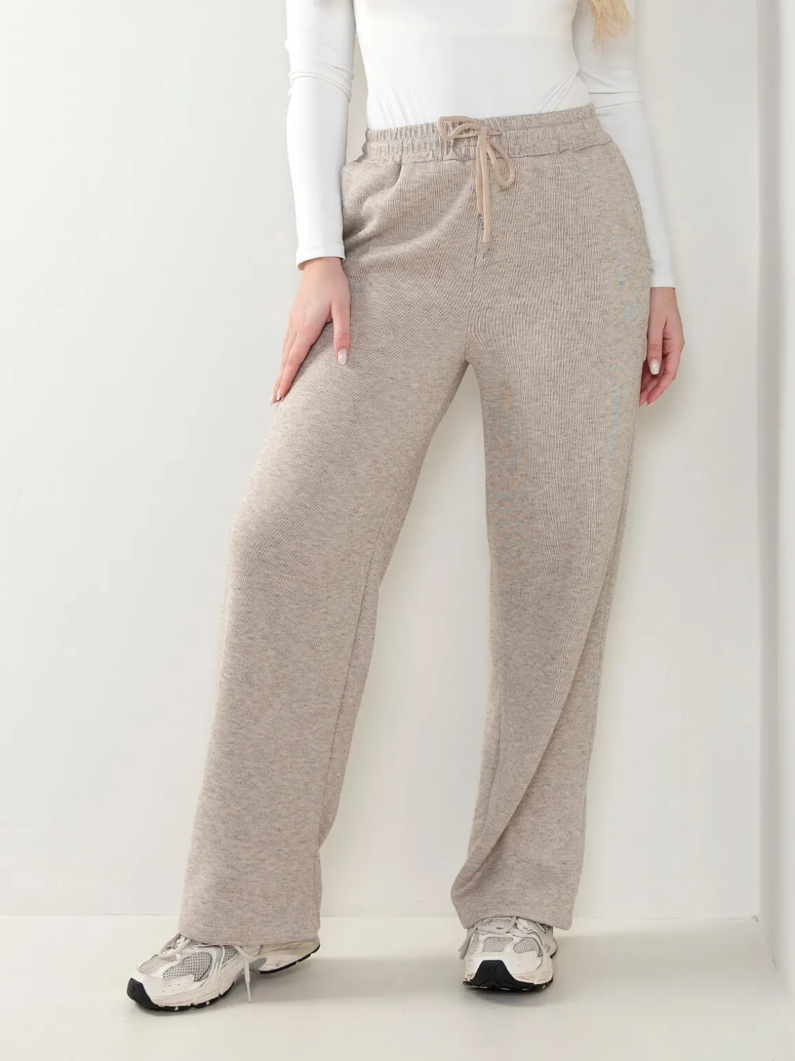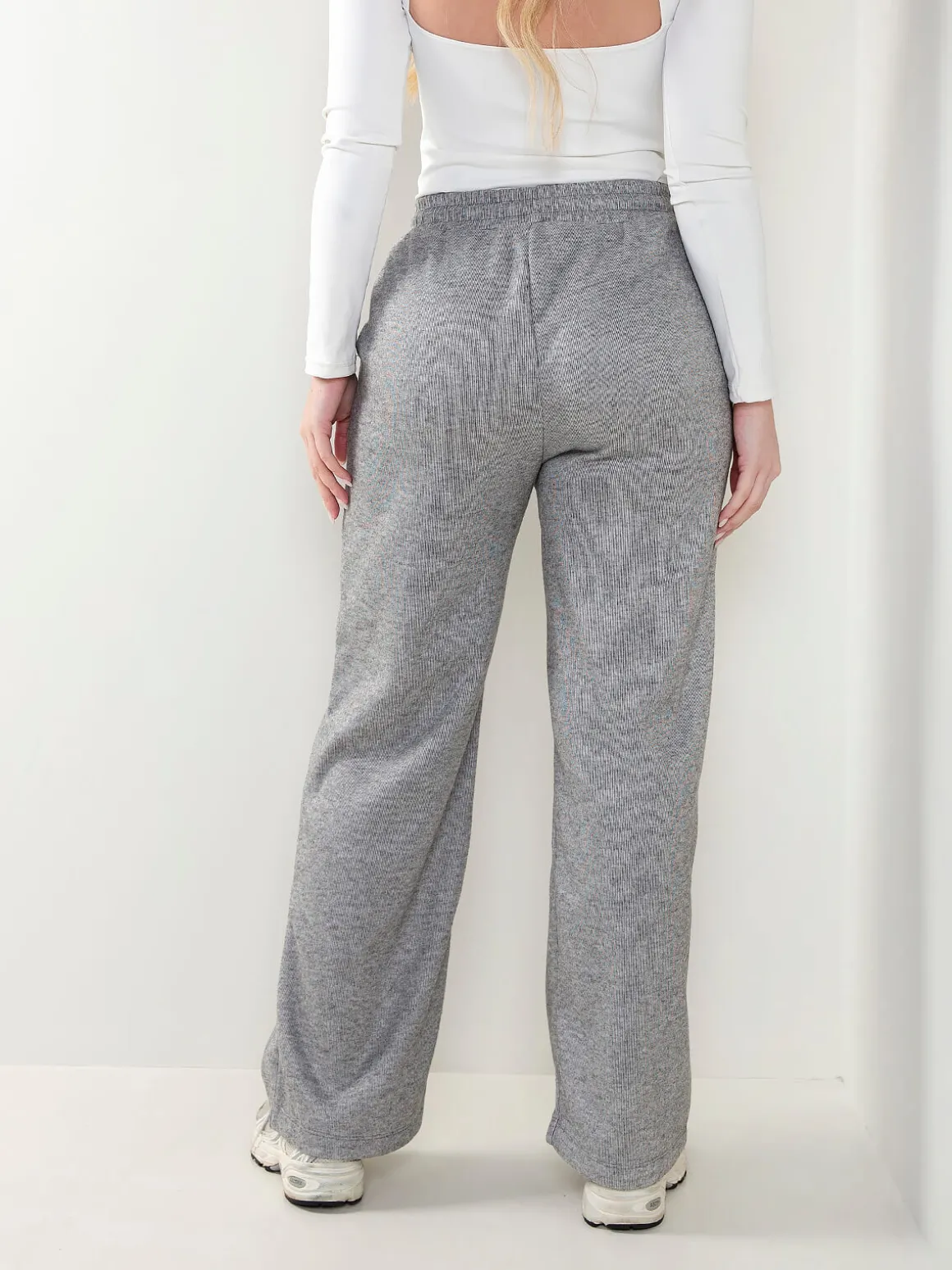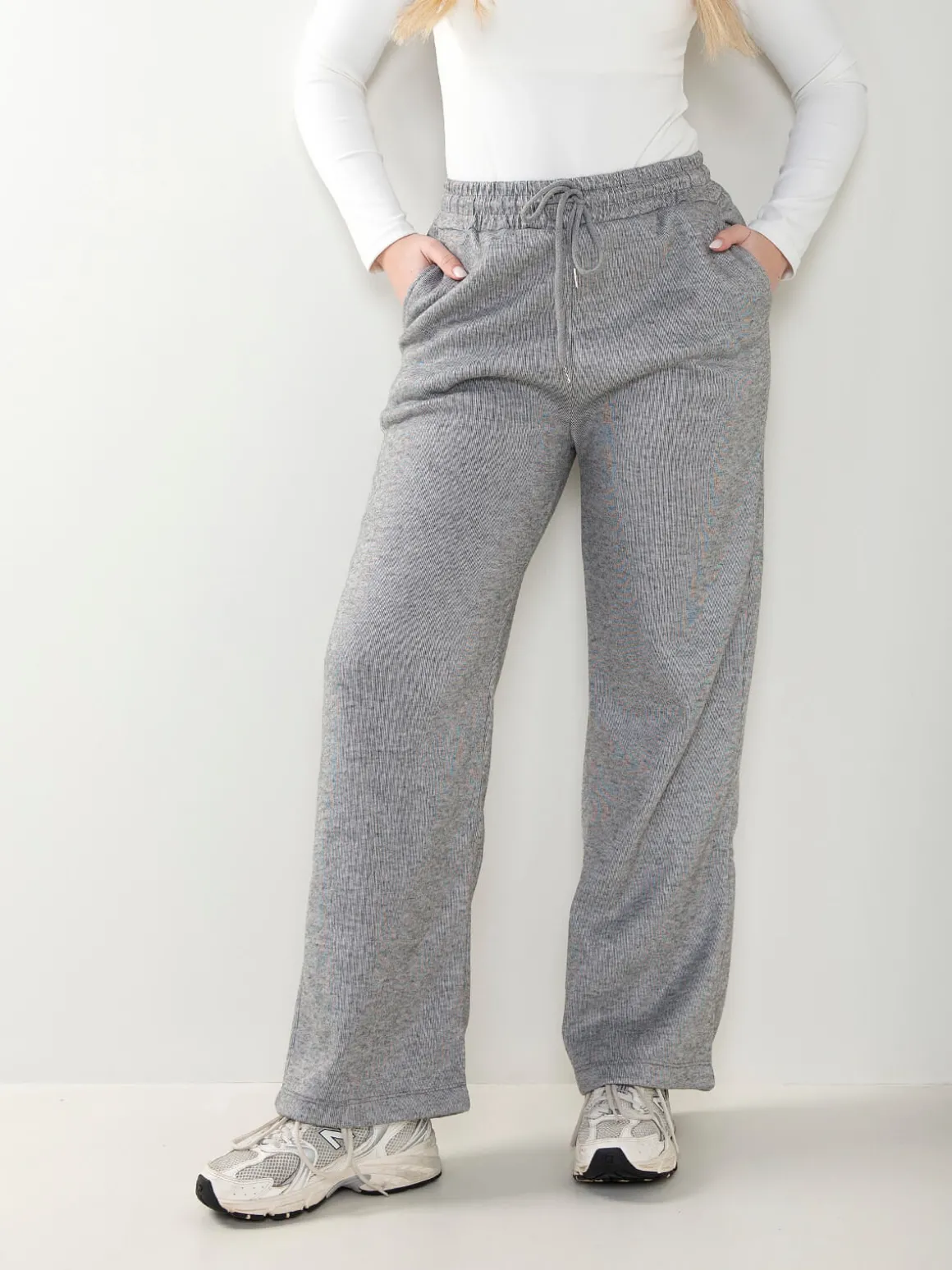 Calças de malha nervurada com interior cardado para senhora. Calças largas de cintura alta com cordão para ajustar. 4 bolsos. Altura da Modelo: 175 cm | Tamanho: M/L