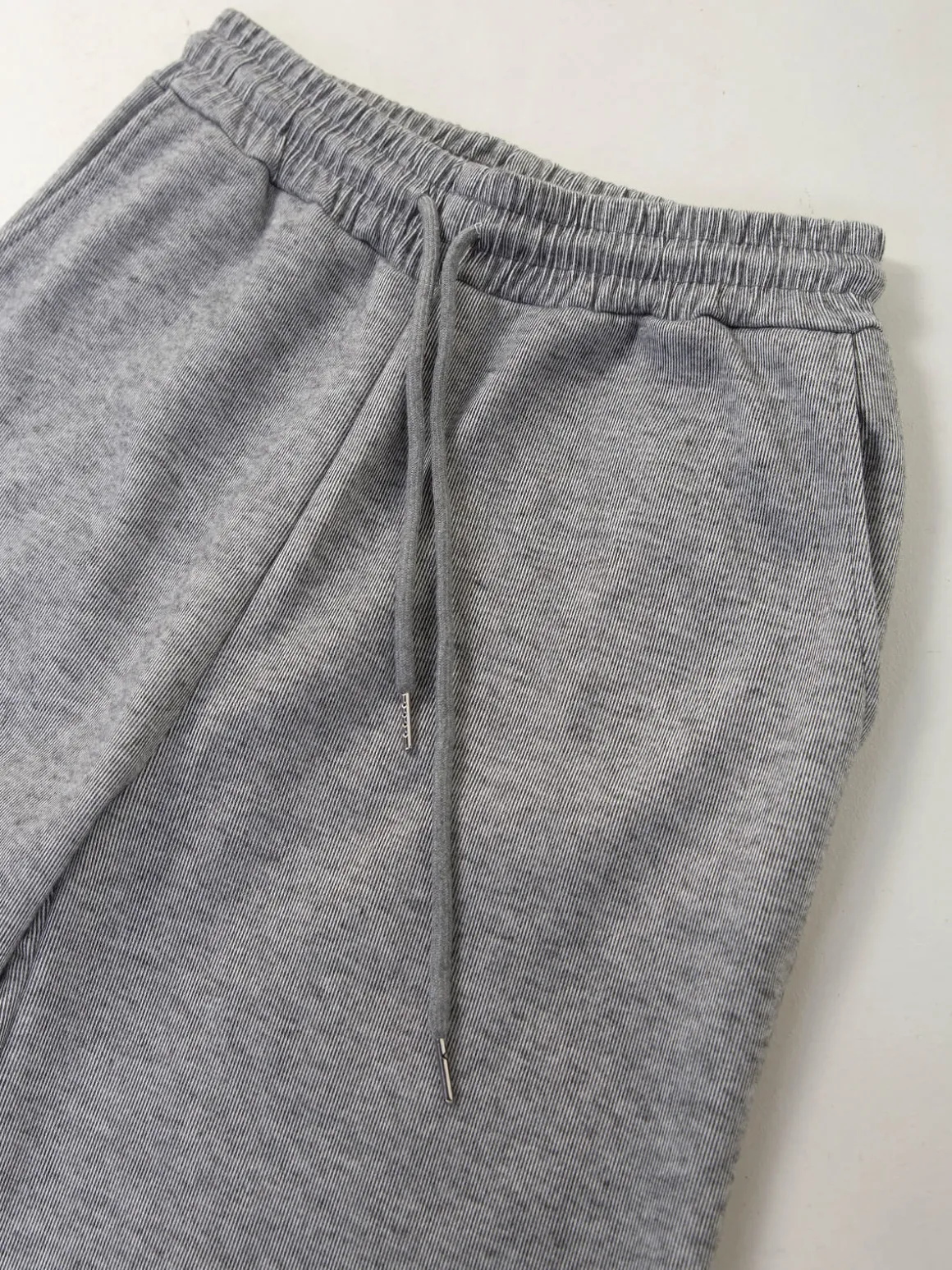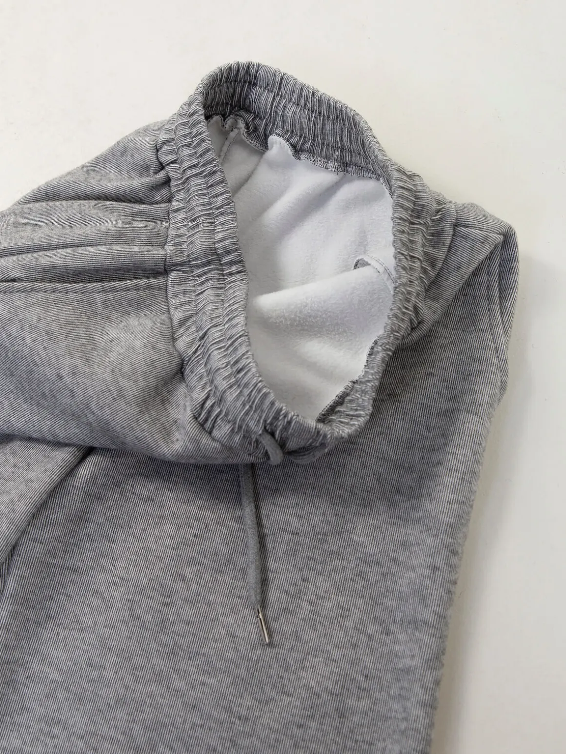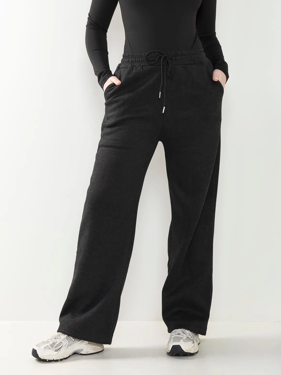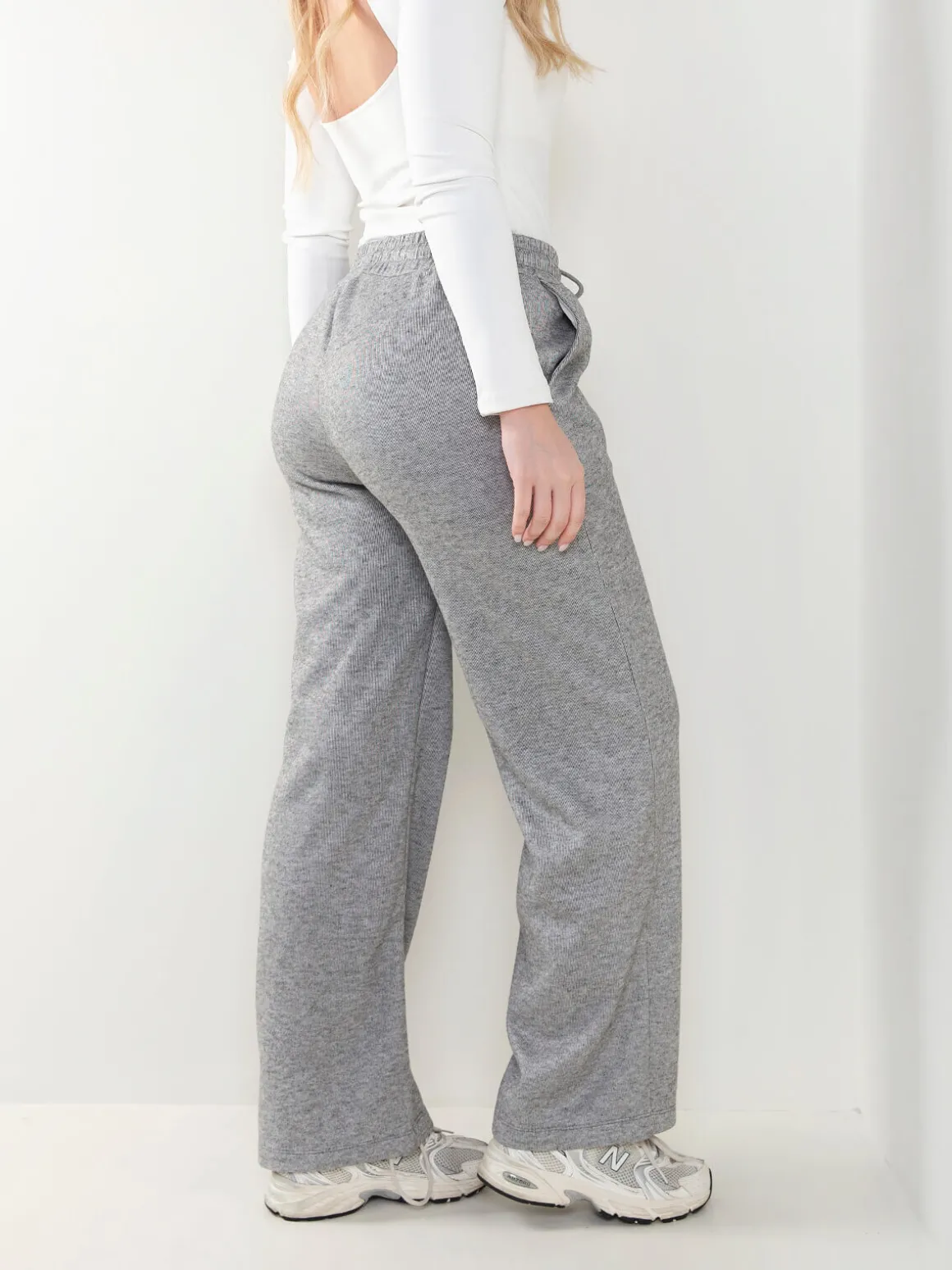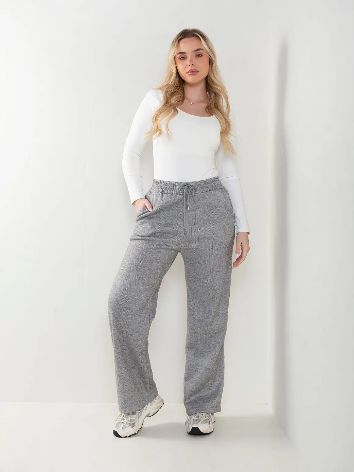 Calças de malha nervurada com interior cardado para senhora. Calças largas de cintura alta com cordão para ajustar. 4 bolsos. Altura da Modelo: 175 cm | Tamanho: M/L