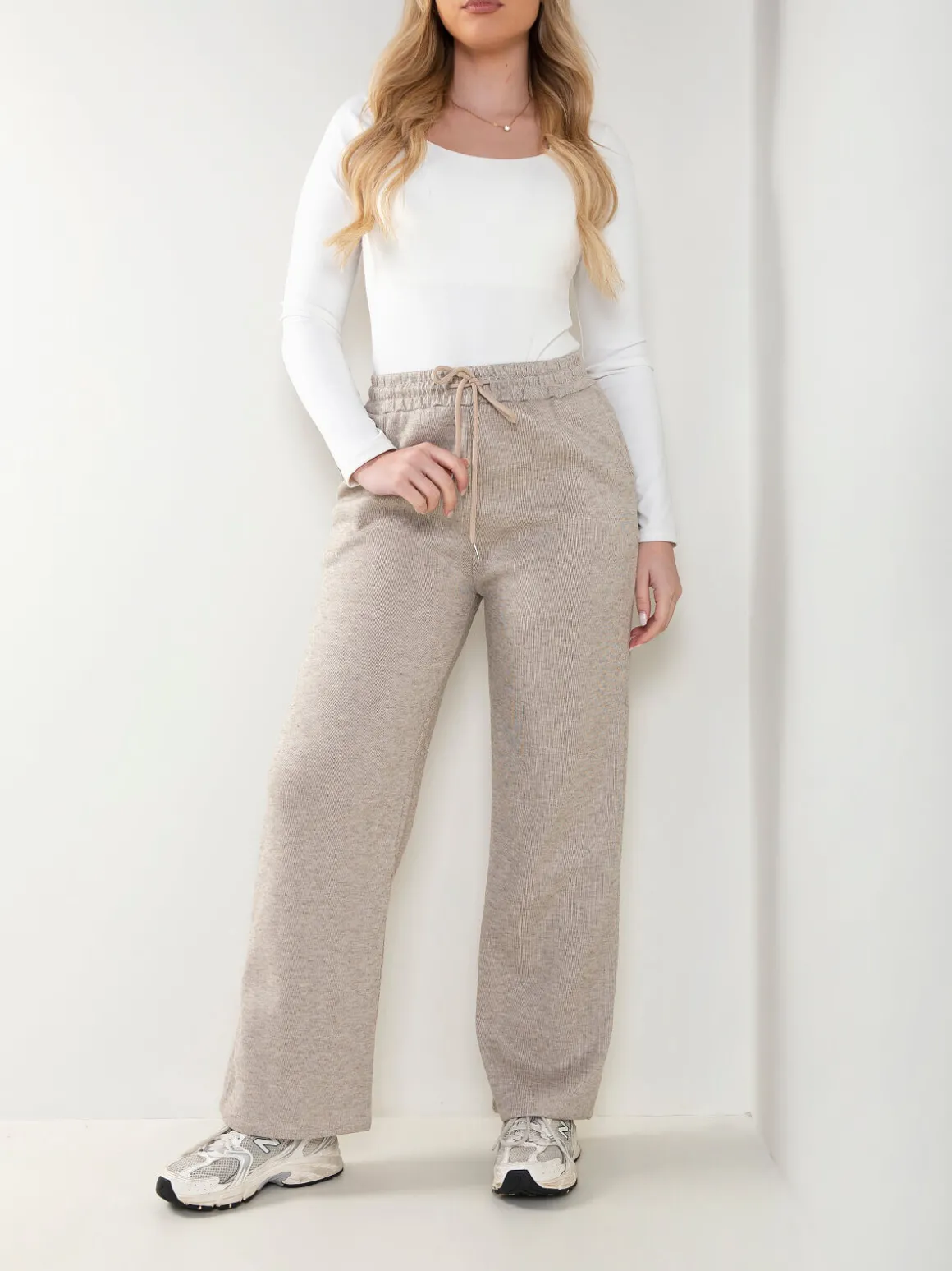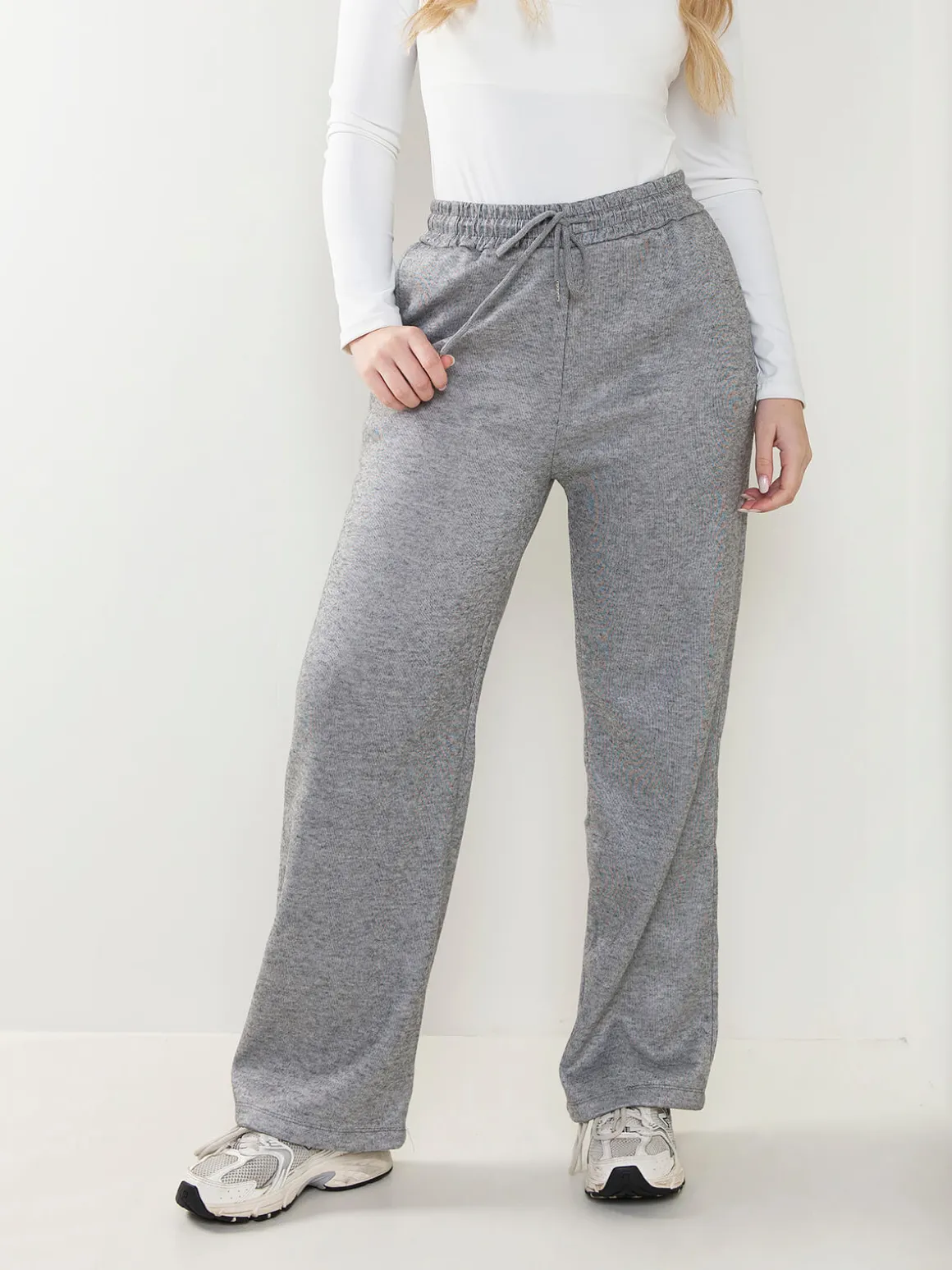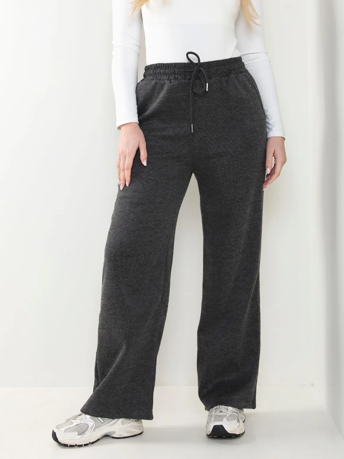 Calças de malha nervurada com interior cardado para senhora. Calças largas de cintura alta com cordão para ajustar. 4 bolsos. Altura da Modelo: 175 cm | Tamanho: M/L
