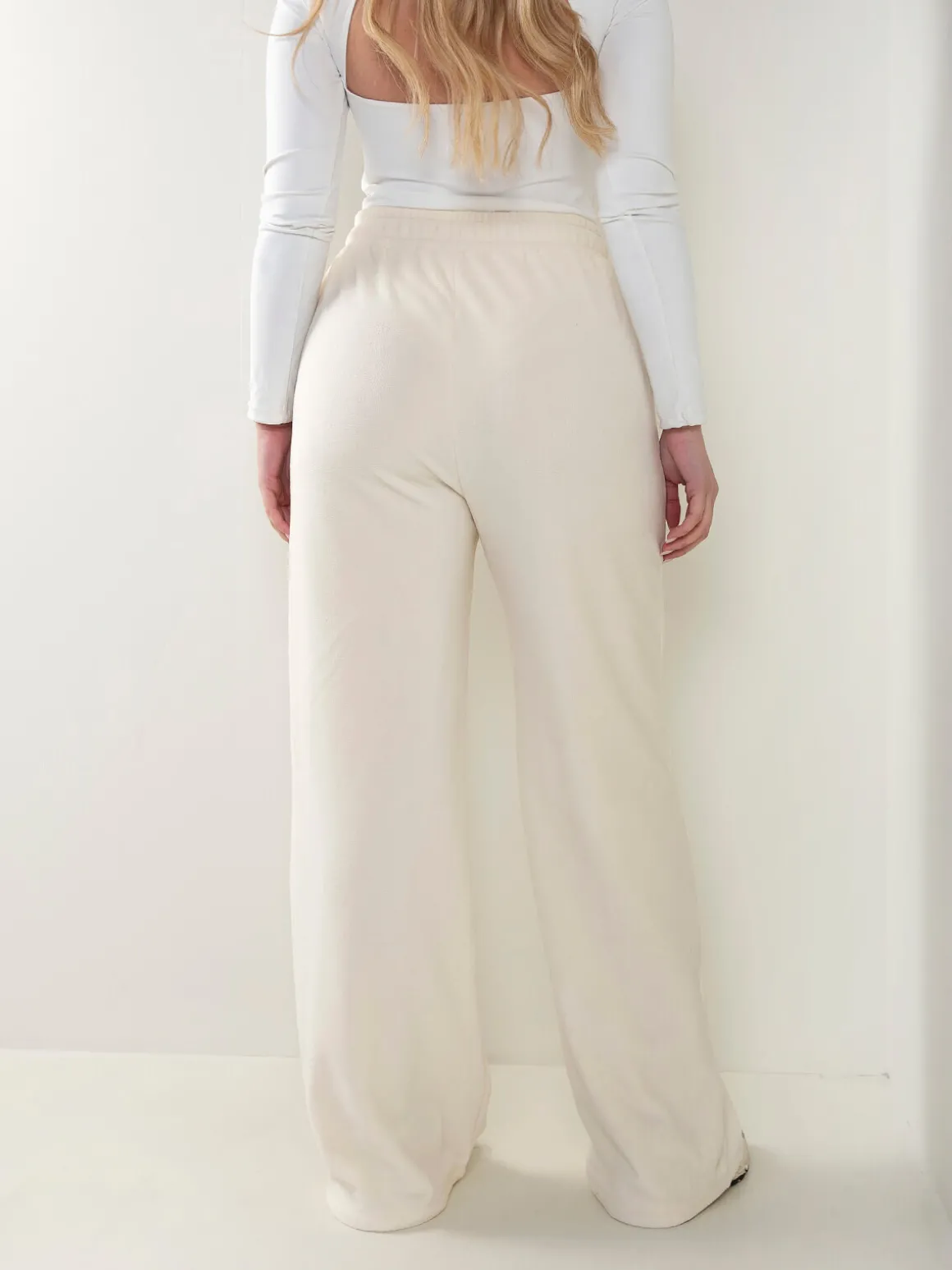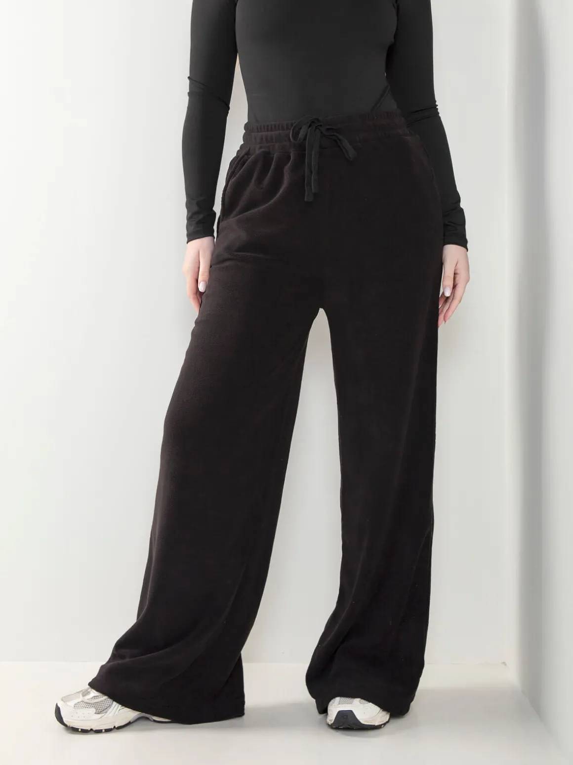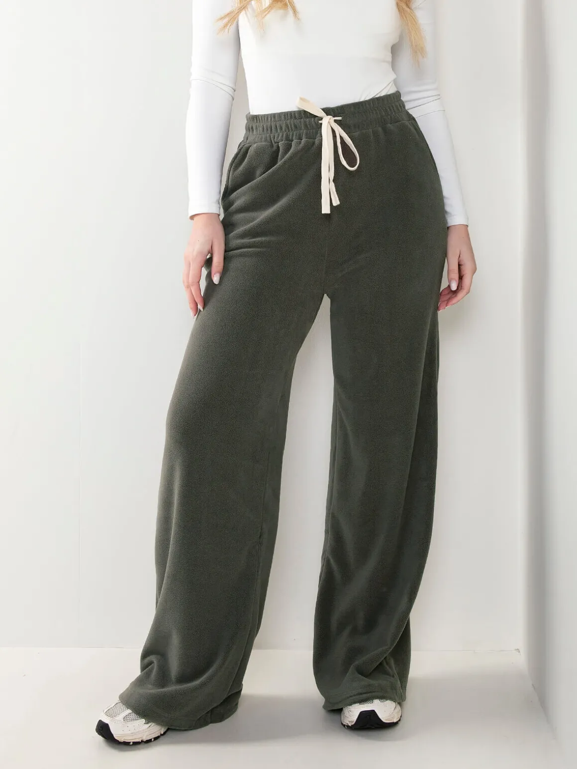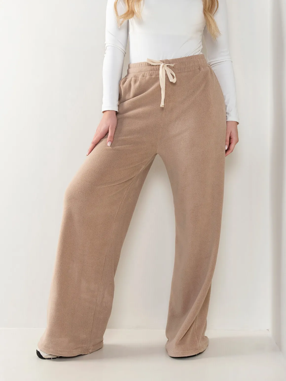 Calças em tecido polar macio, com toque suave e confortável. Modelo de perna larga, cintura elástica ajustável com cordão, pensado para máximo conforto no dia a dia. 2 bolsos. Ideais para looks descontraídos sem perder uma linha cuidada.Altura da Modelo: 166 cm | Tamanho: L/XL