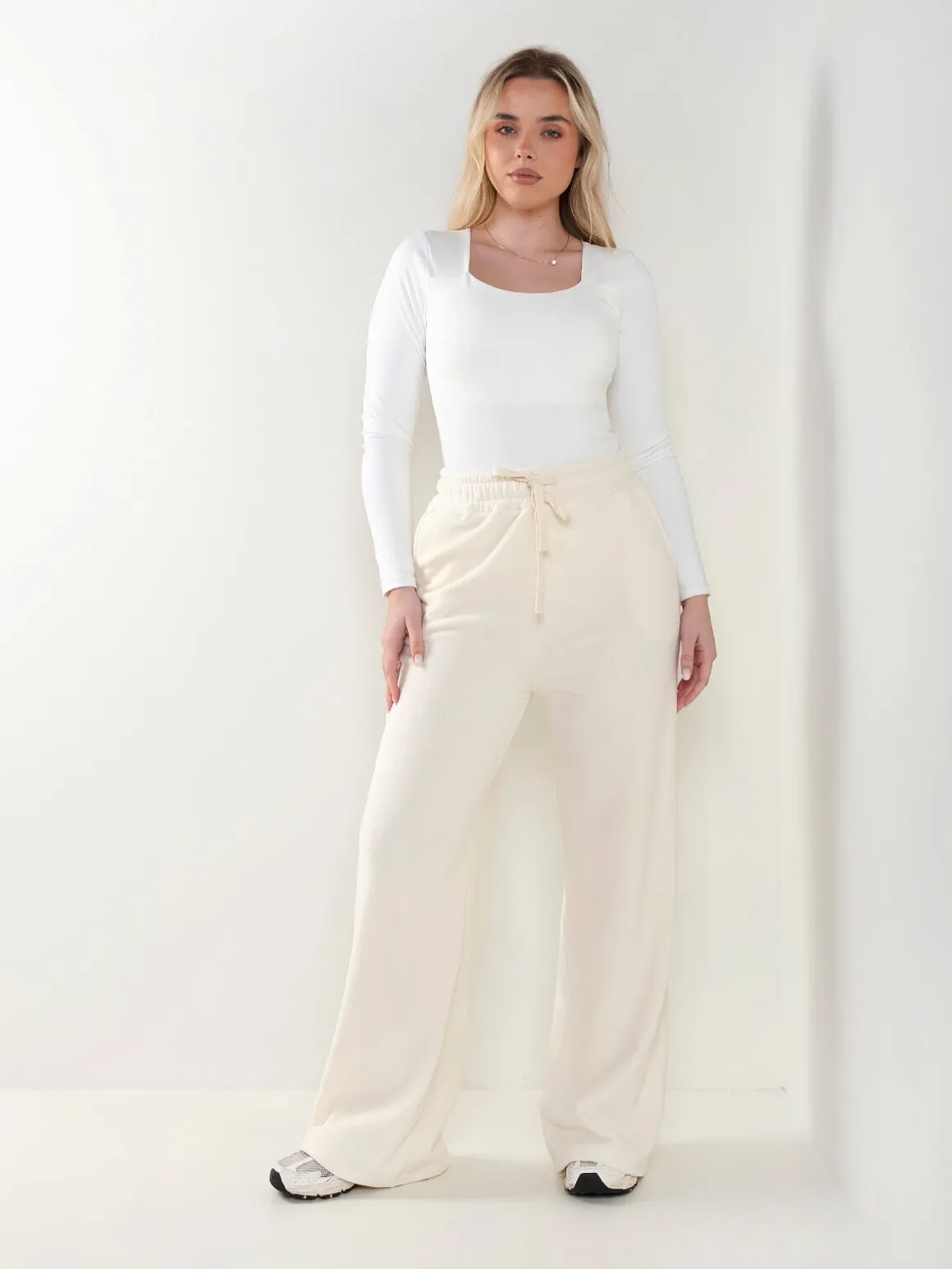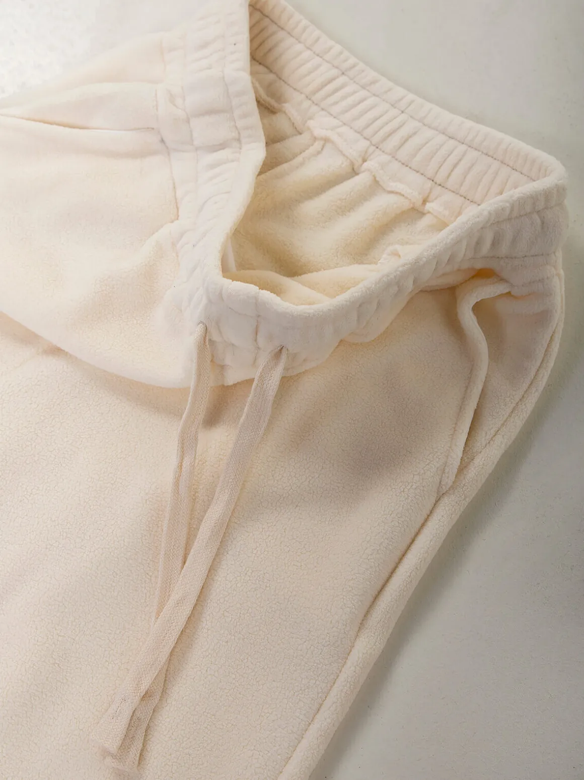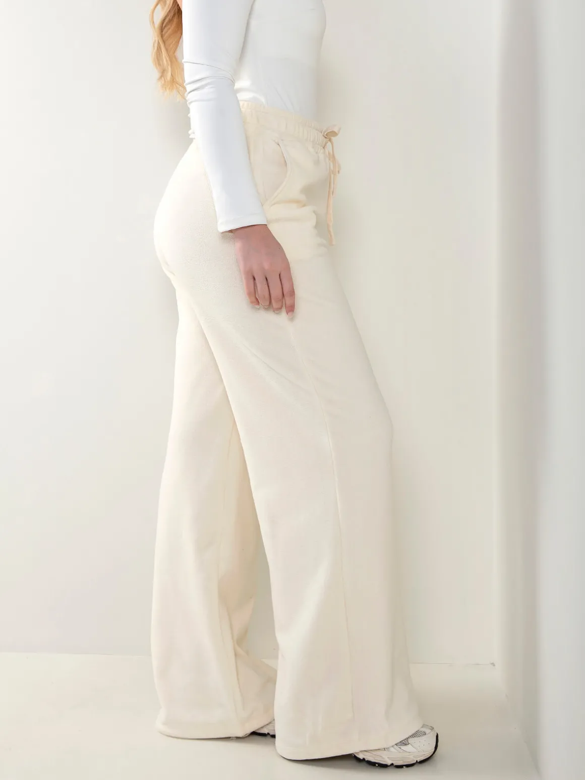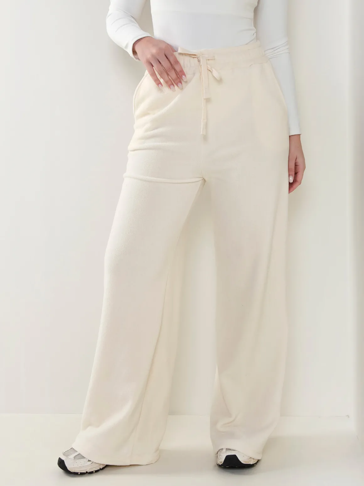 Calças em tecido polar macio, com toque suave e confortável. Modelo de perna larga, cintura elástica ajustável com cordão, pensado para máximo conforto no dia a dia. 2 bolsos. Ideais para looks descontraídos sem perder uma linha cuidada.Altura da Modelo: 166 cm | Tamanho: L/XL