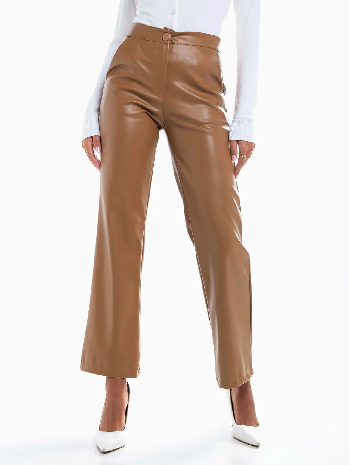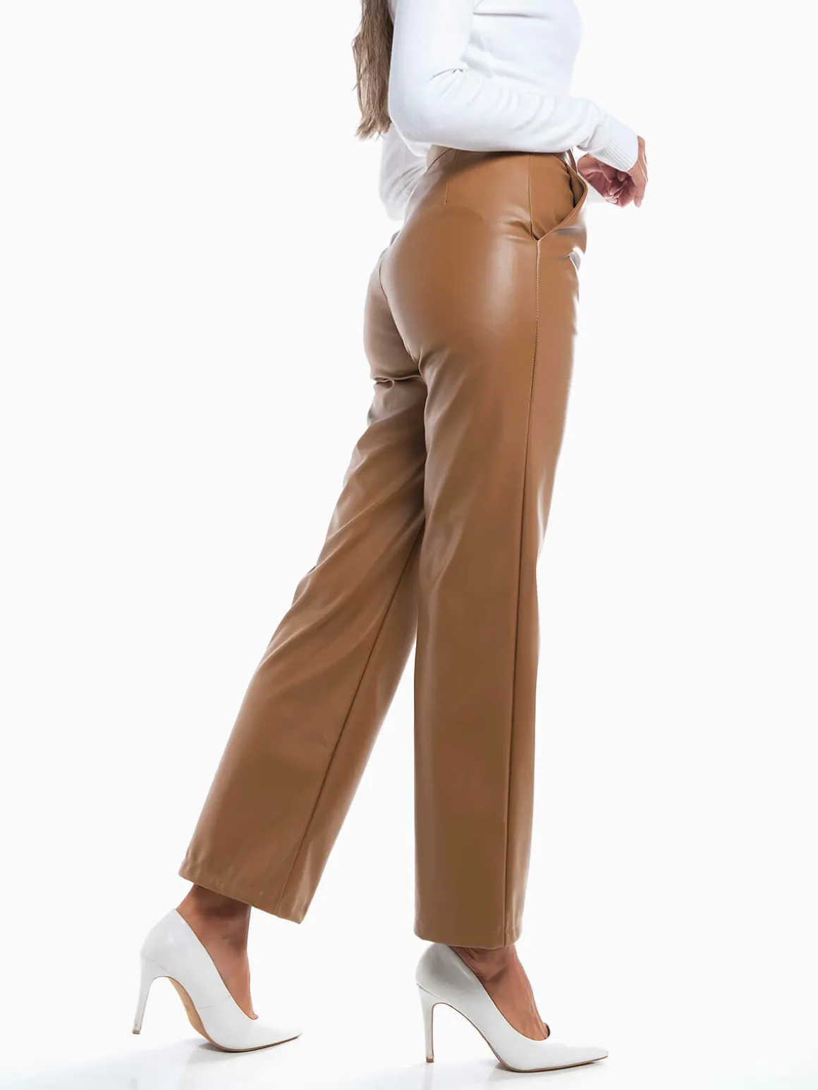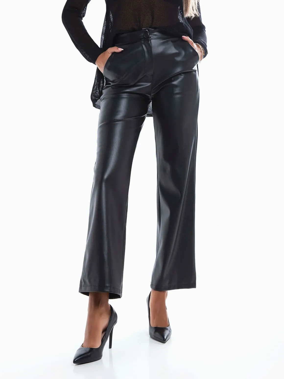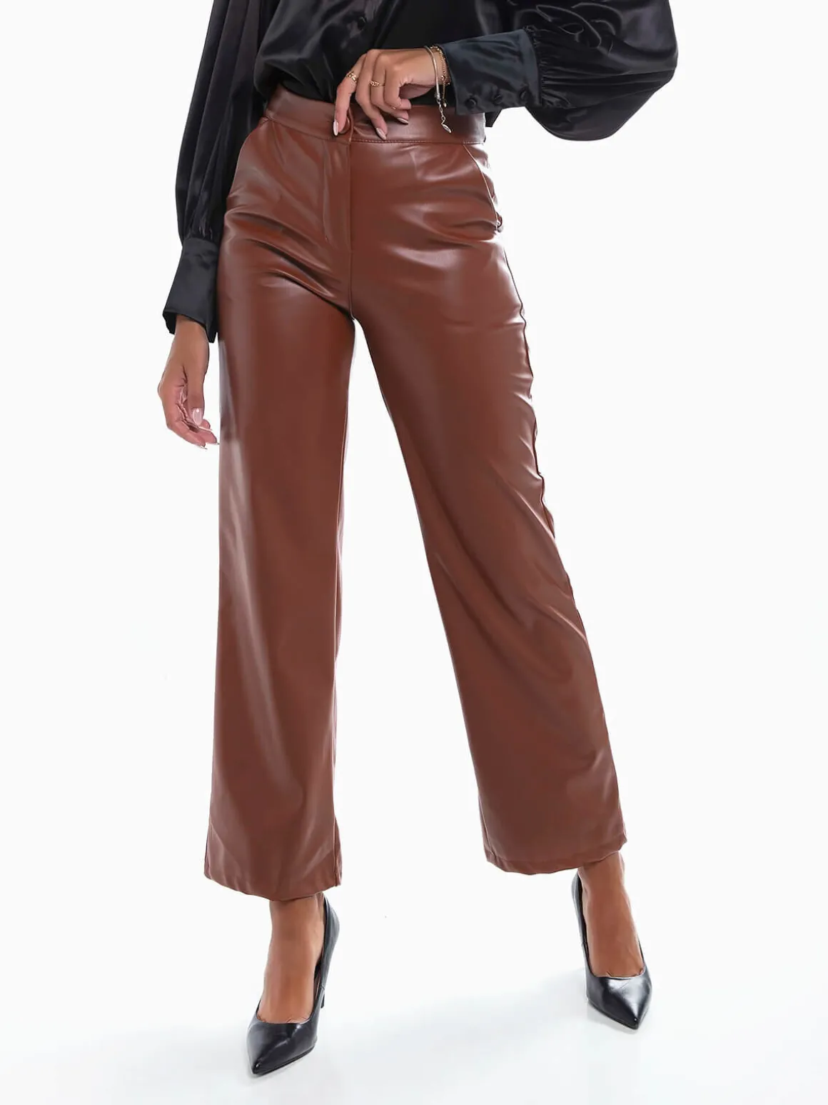 Calças straight leg de efeito pele para senhora. Calças de cintura alta com interior cardado. 2 bolsos.Altura da Modelo: 175 cm | Tamanho: S