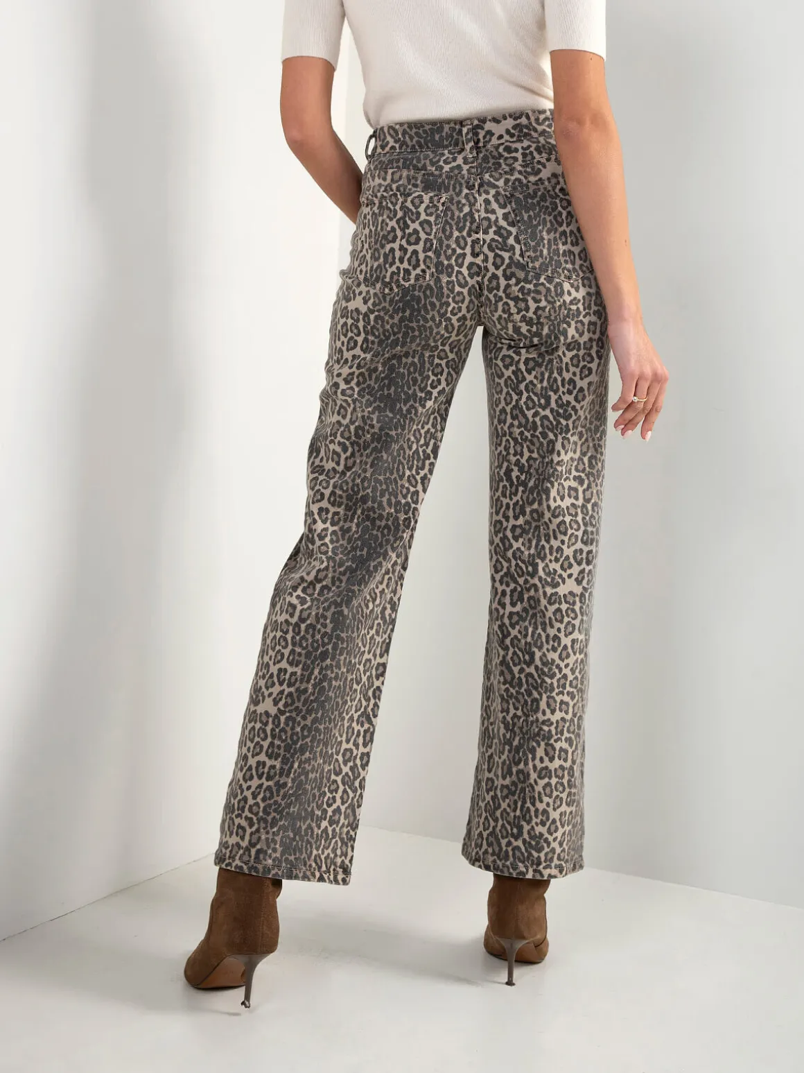Calças de ganga cintura alta em animal print, com corte direito e largo. 5 bolsos. Um modelo atual que conjuga tendência e versatilidade, ideal para looks urbanos ou mais elegantes. Confortáveis e fáceis de combinar, adaptam-se do dia a dia a ocasiões especiais.Altura da Modelo: 175 cm | Tamanho: S