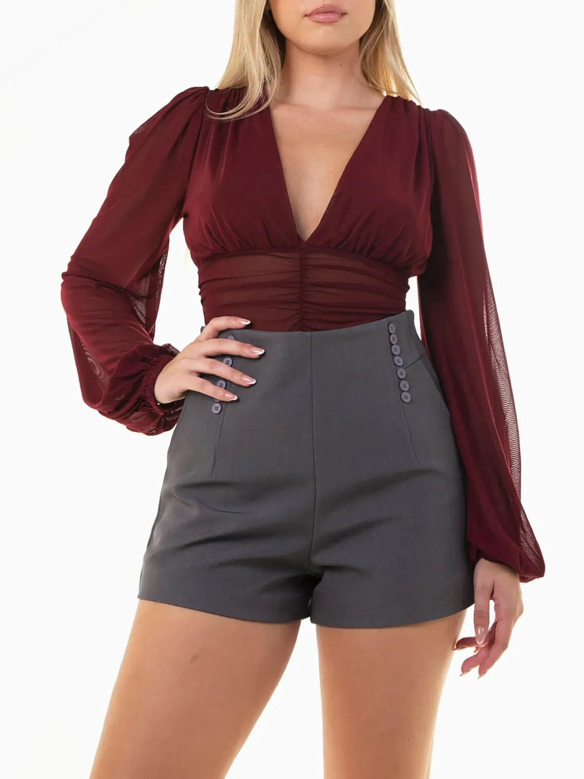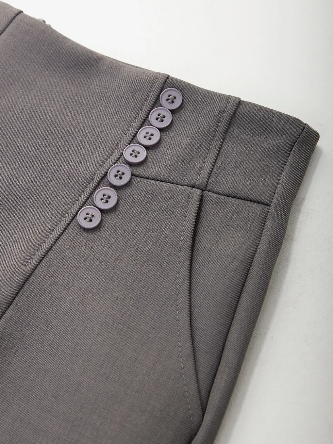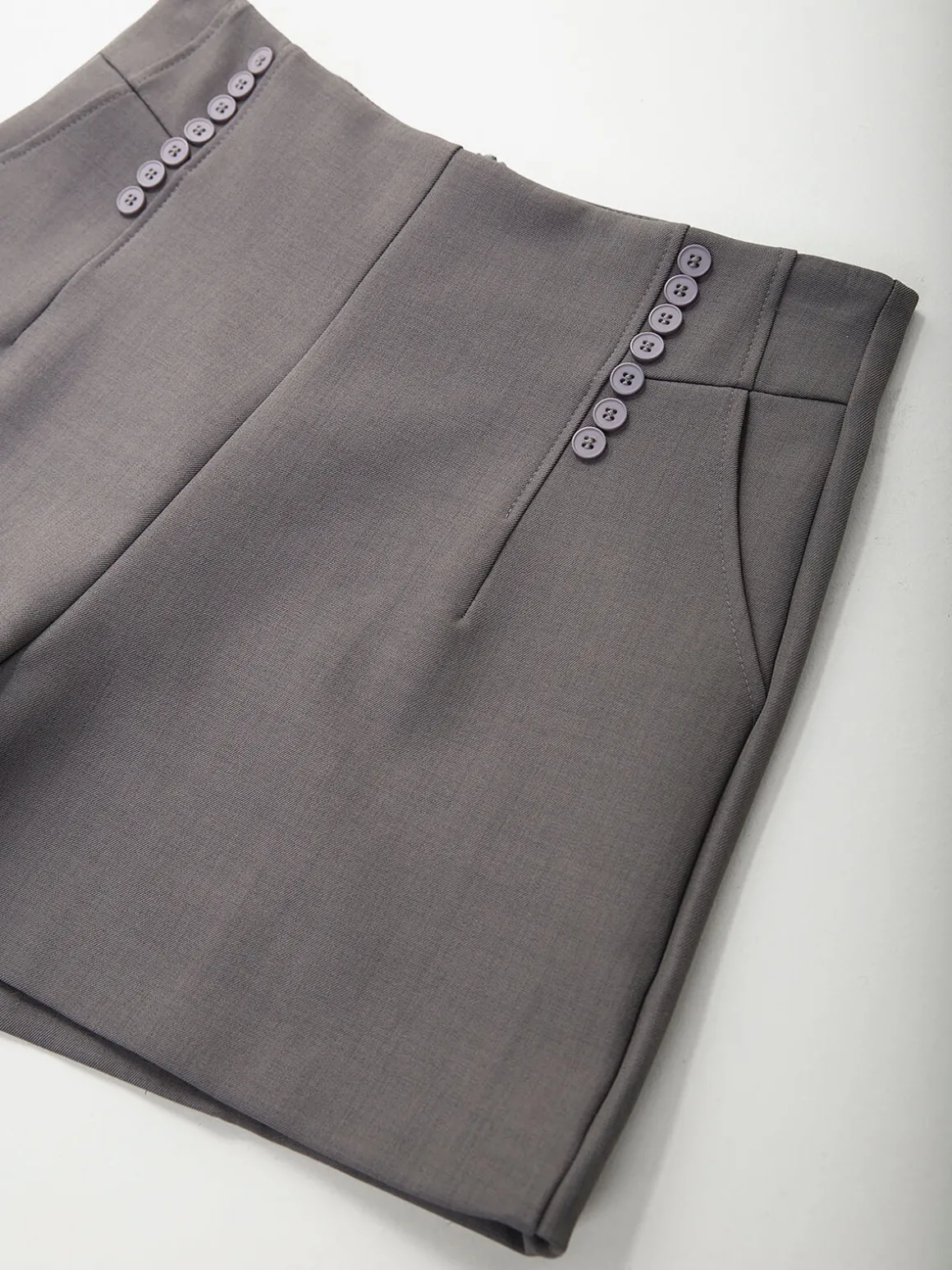 Calções de alfaiataria com corte curto e cintura alta. Modelo com dois bolsos frontais e detalhe de botões decorativos na frente. Aperto por fecho éclair na parte posterior. Peça versátil e elegante, perfeita para combinar com camisas, tops ou blusas em looks modernos de dia ou de noite.Altura da Modelo: 166 cm | Tamanho: S