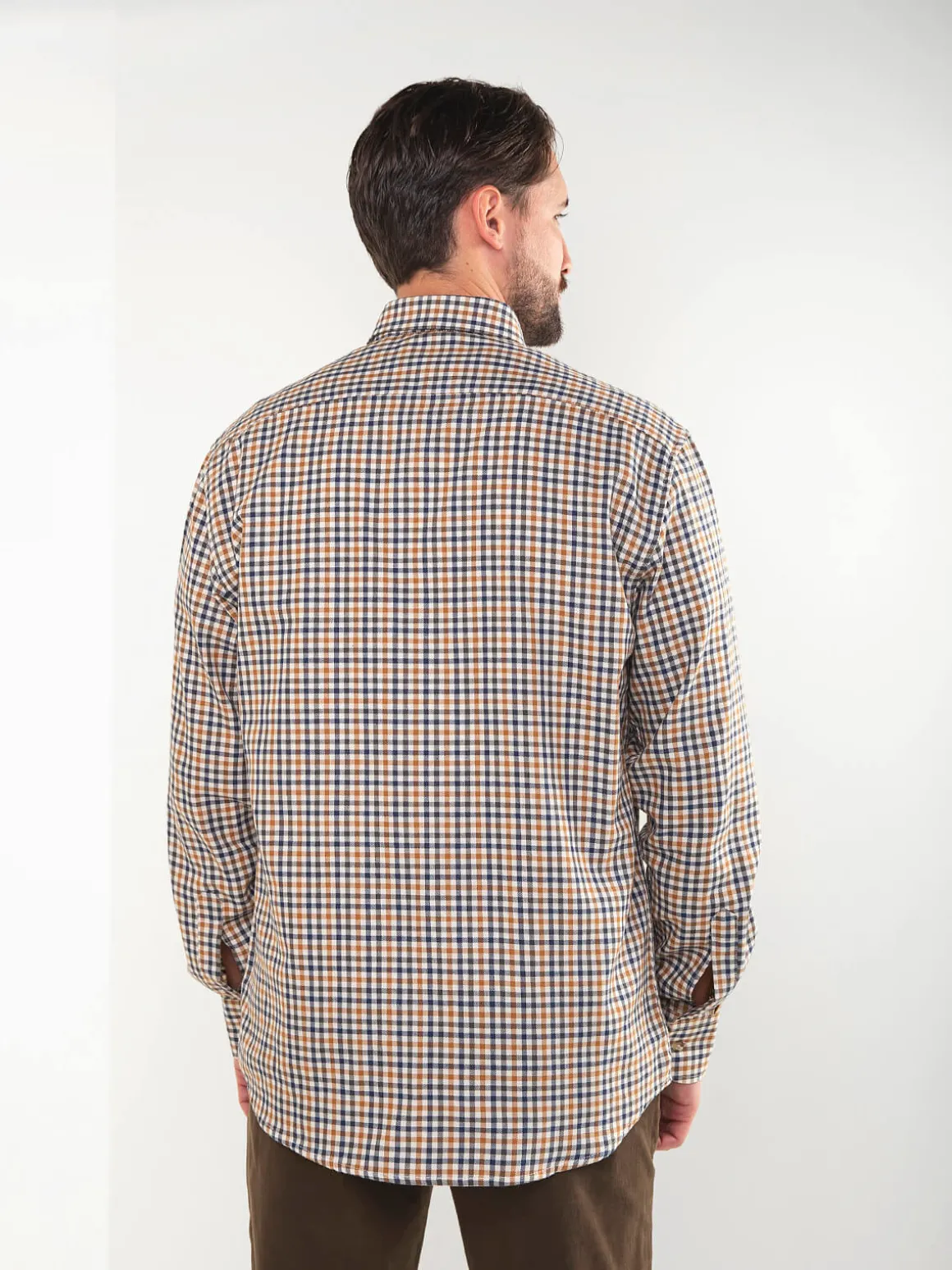 Camisa de homem bege 100% algodão, padrão aos quadrados, manga comprida e punhos abotoados. Inclui bolso no peito e colarinho americano. Confortável, respirável e perfeita para looks casuais do dia a dia.Altura do Modelo: 180 cm | Tamanho: M