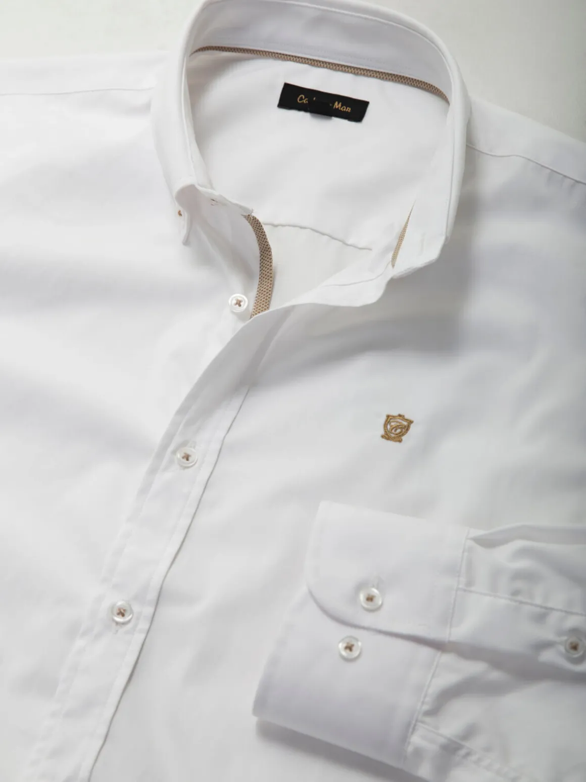 Camisa branca slim fit 100% algodão para homem. Camisa de manga comprida com símbolo bordado no peito em contraste. Colarinho americano e punhos abotoados. Aperto frontal de botões. Altura do Modelo: 182 cm | Tamanho: L
