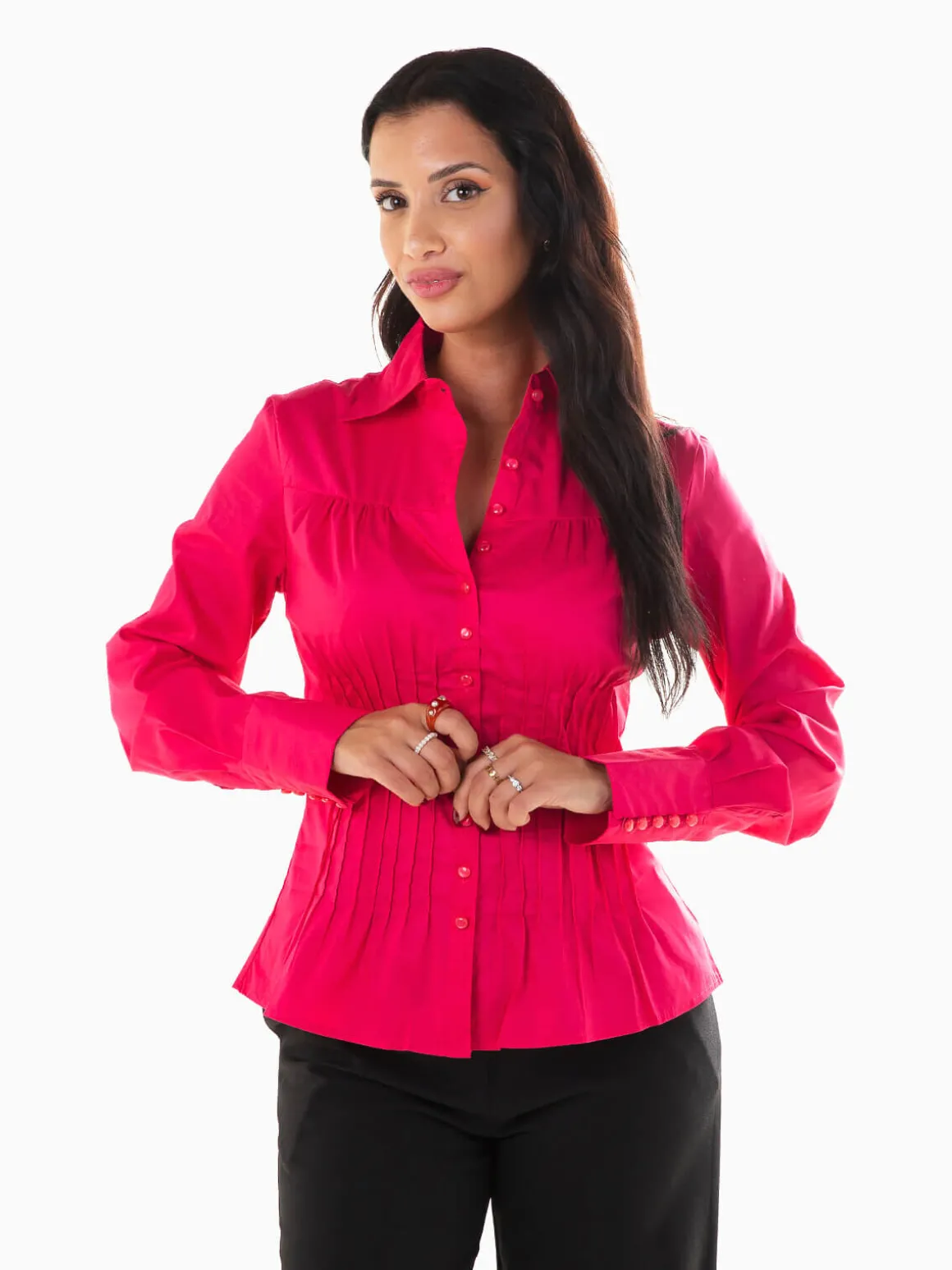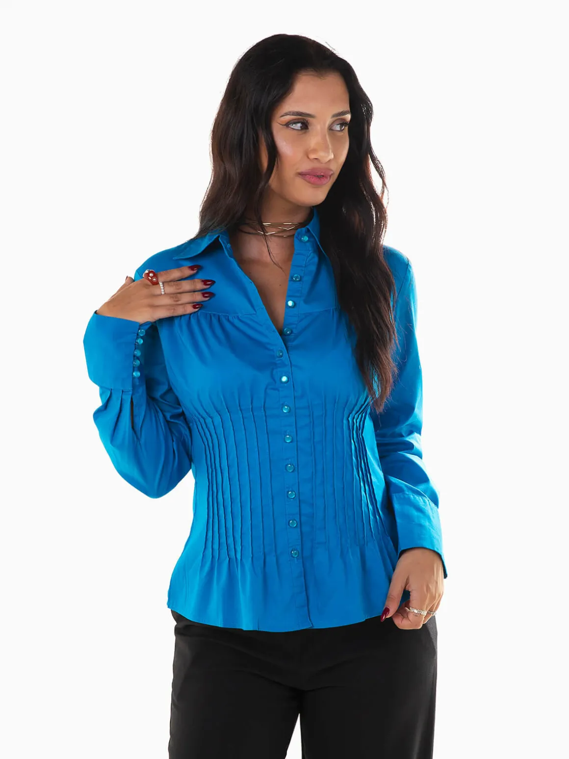 Camisa de manga comprida para senhora com costuras reforçadas para efeito cintado. Camisa para mulher com gola de abas e punhos abotoados. Aperto de botões. Altura da Modelo: 162 cm | Tamanho: S